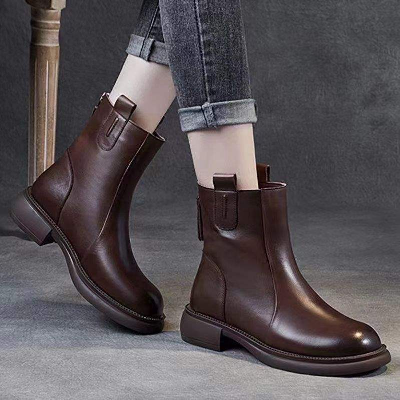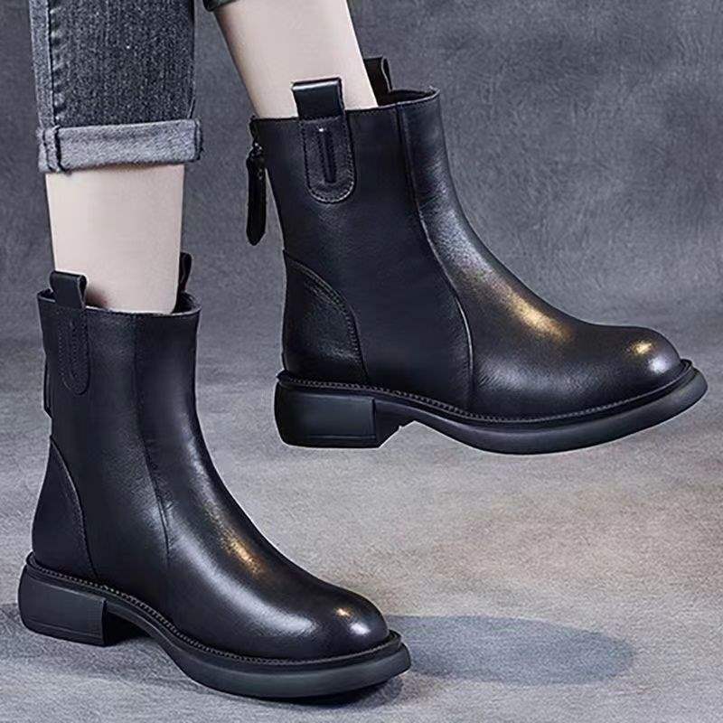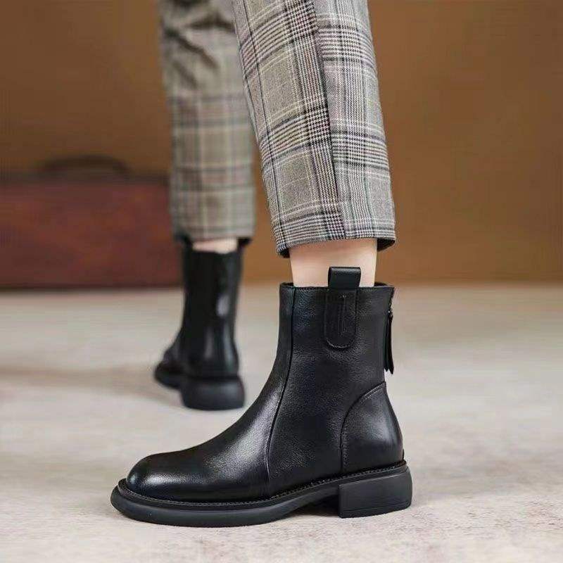 짧은 부츠 여성 2025 가을, 겨울 새로운 영국 스타일 로우 힐 작은 가죽 부츠 첼시 레트로 백 지퍼 부츠