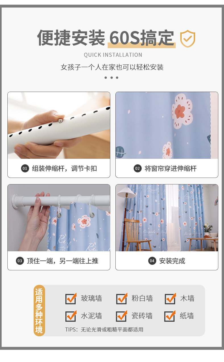 렌탈하우스용 커튼을 설치할 필요가 없으며 간단한 접이식 막대, 사무실용 암막커튼 세트 2025 새로운 스타일스토어 가기