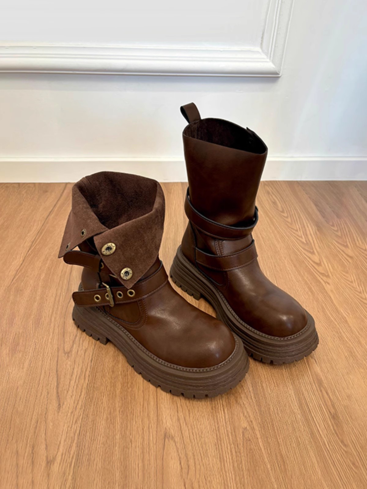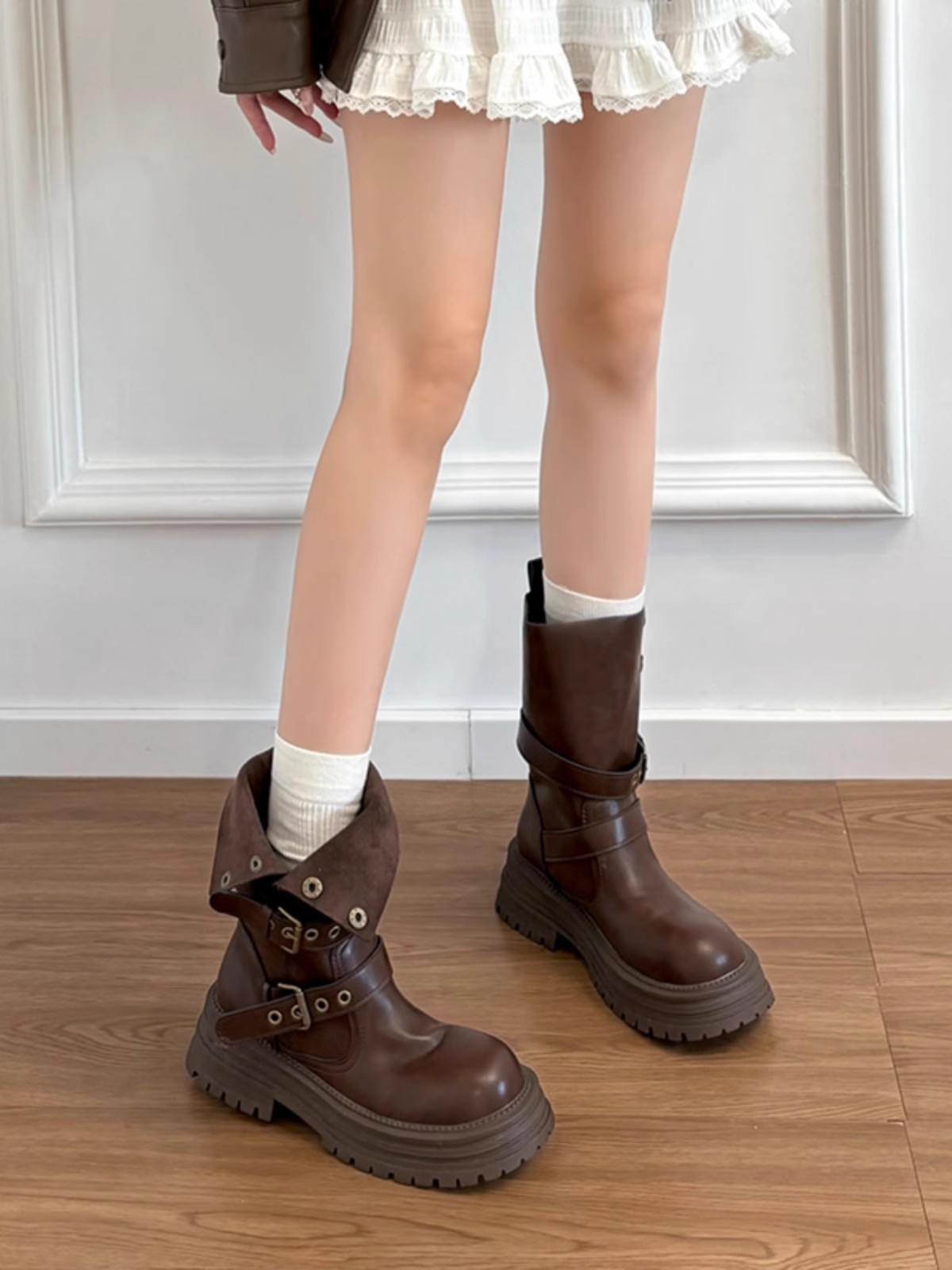 소가죽 버전 ~ 메일라드 두꺼운 밑창 미드 종아리 짧은 부츠 여성 가을 겨울 신작 영국 스타일 복고풍 벨트 버클 마틴 부츠