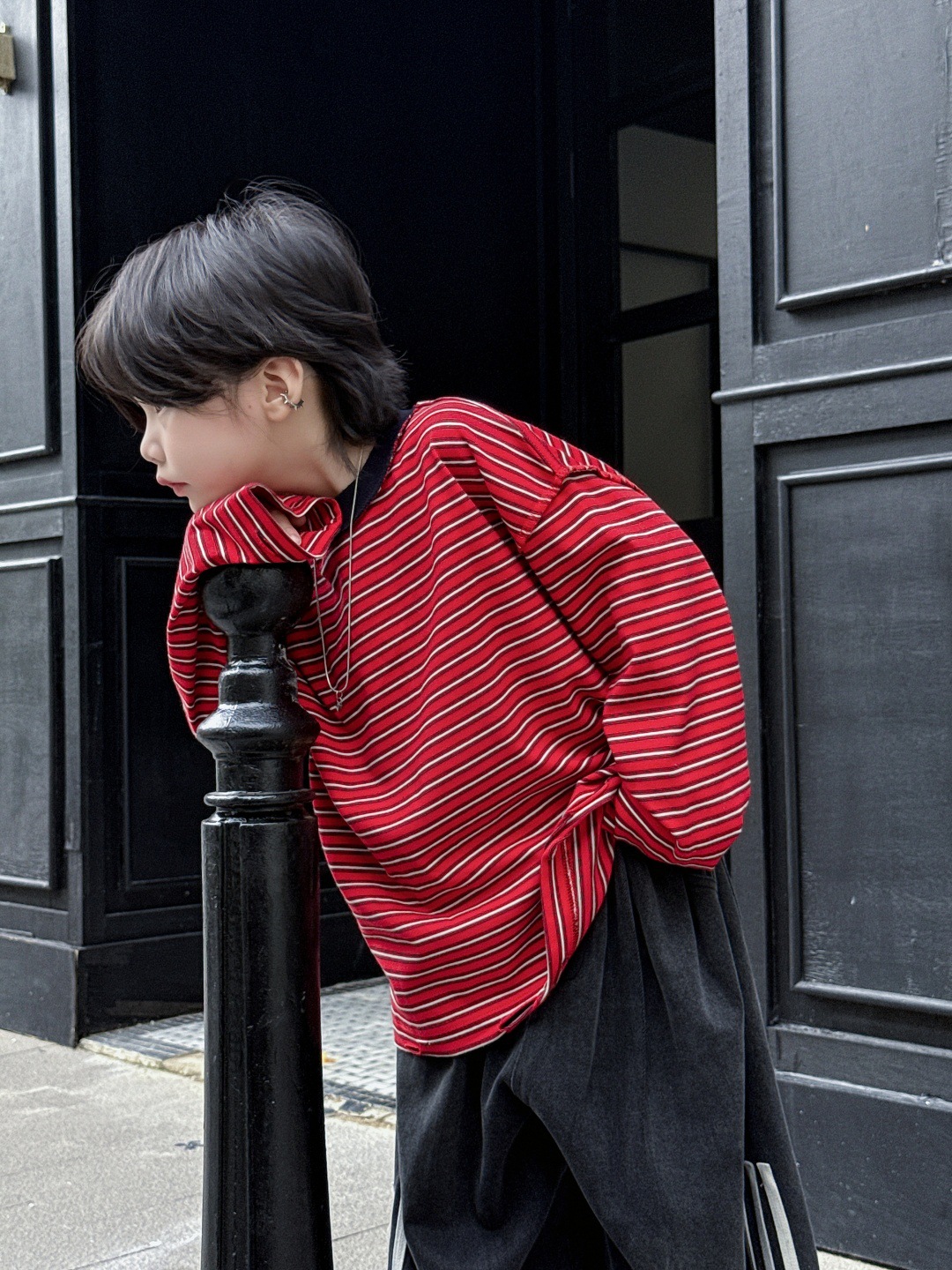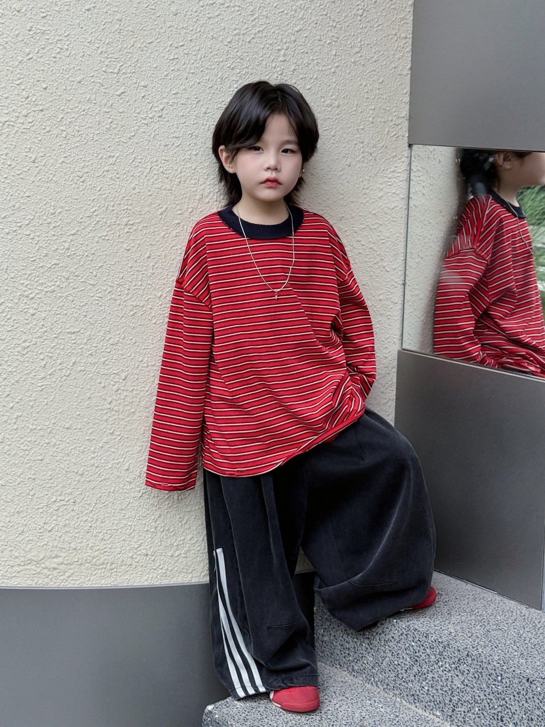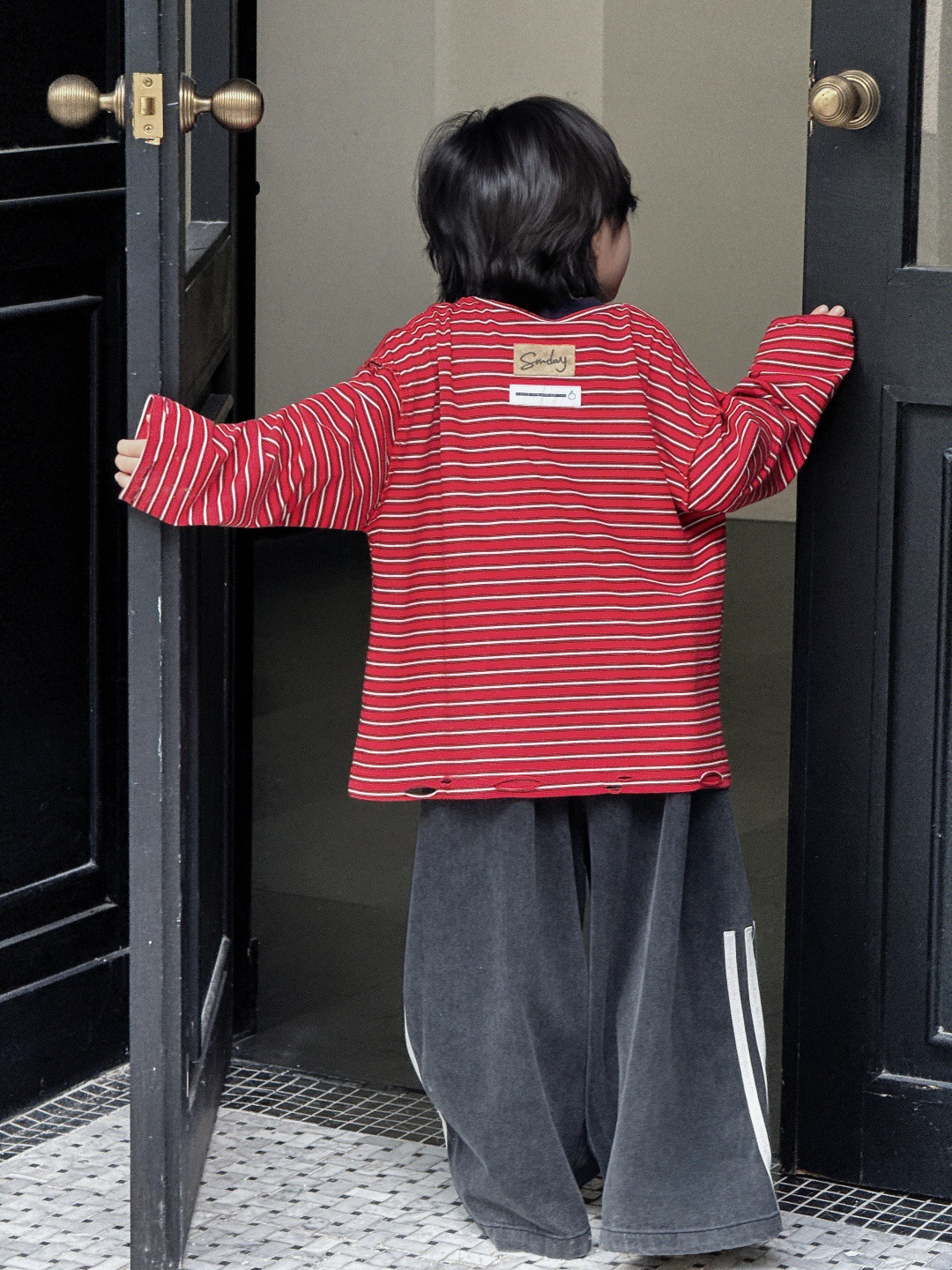 남아, 중대형 아동용 반작업 아동용 티셔츠, 스트라이프 찢어진 상의, 트렌디한 루즈한 하의 셔츠, 긴팔 복고풍스토어 가기