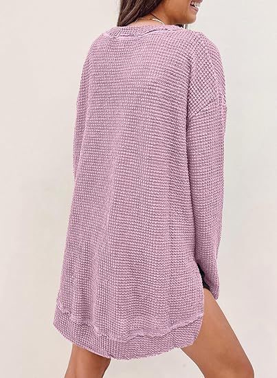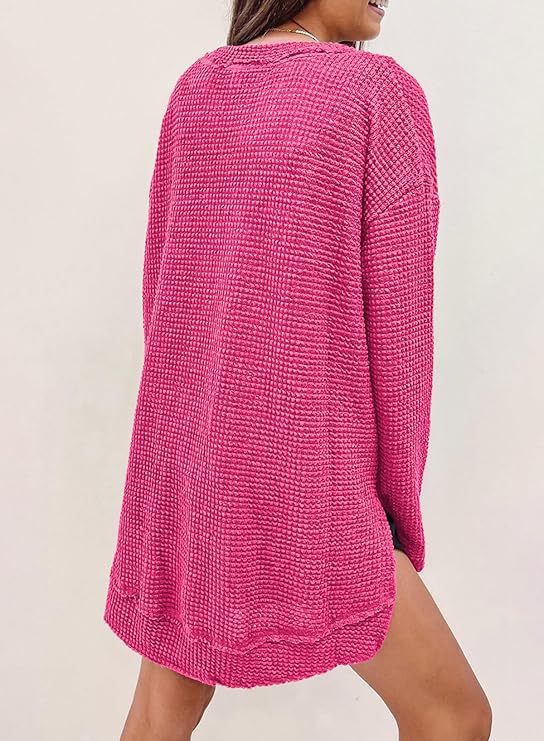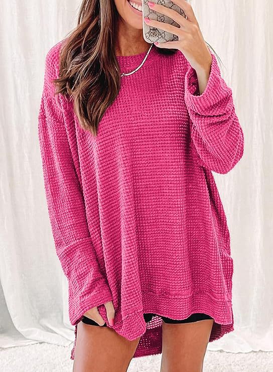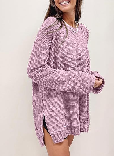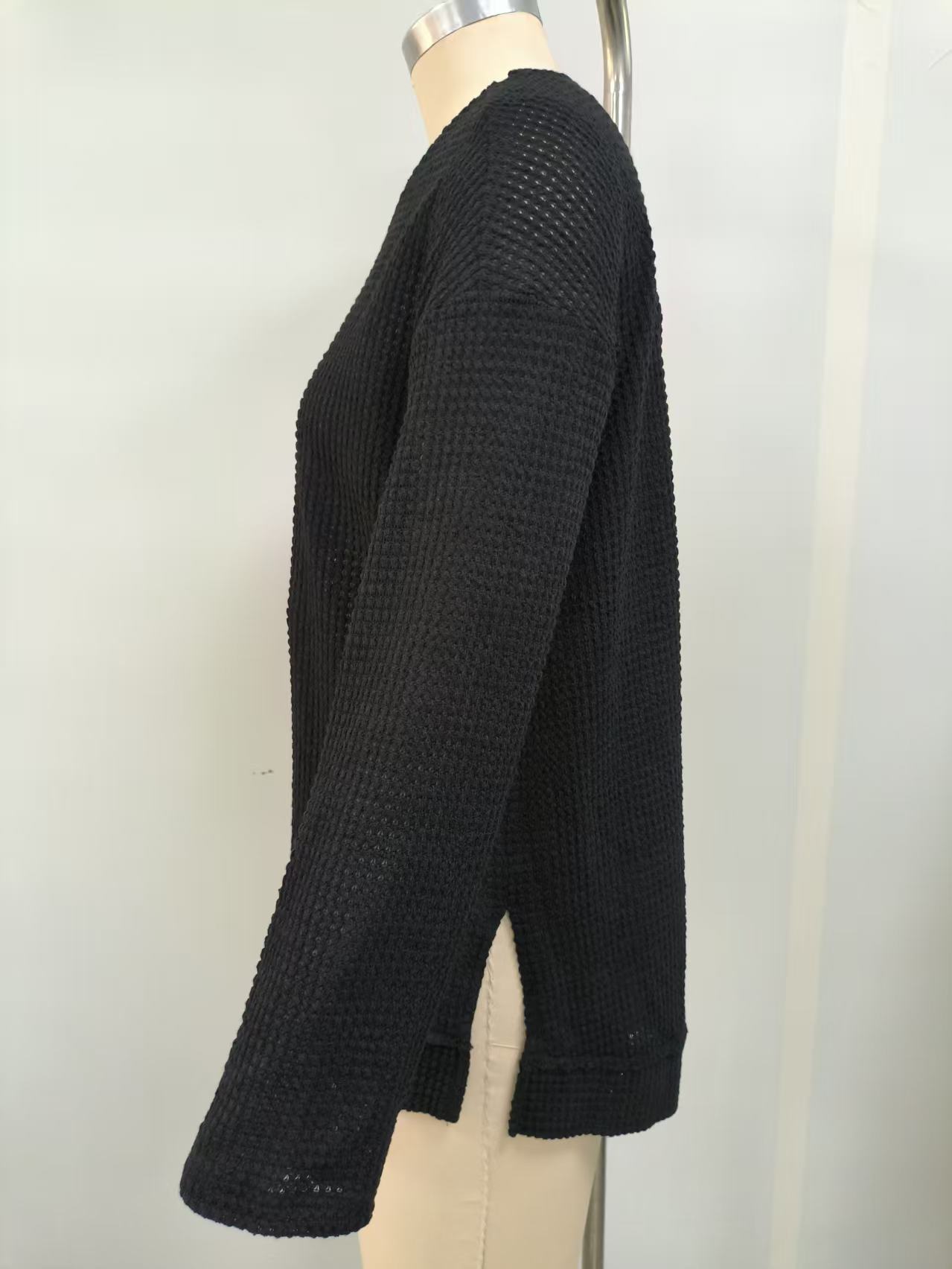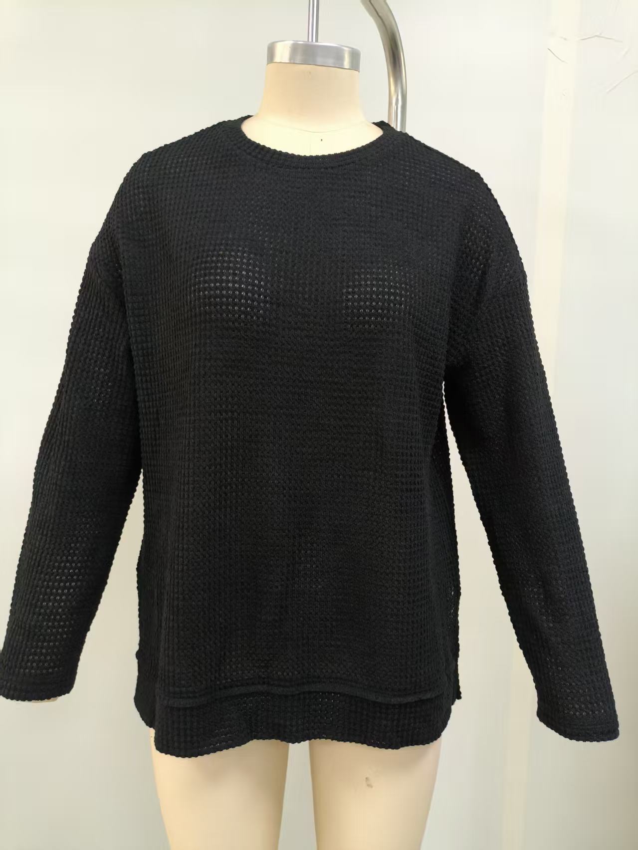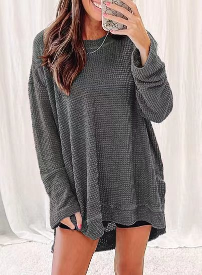 2025 유럽과 미국의 아마존 국경 간 기질 패션 솔리드 컬러 와플 루즈 라운드 넥 긴팔 슬릿 탑 여성 의류스토어 가기