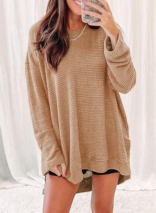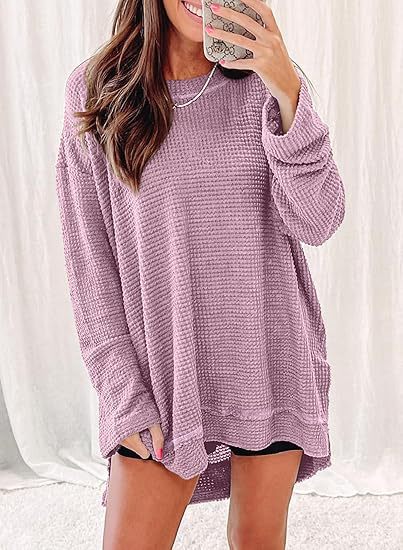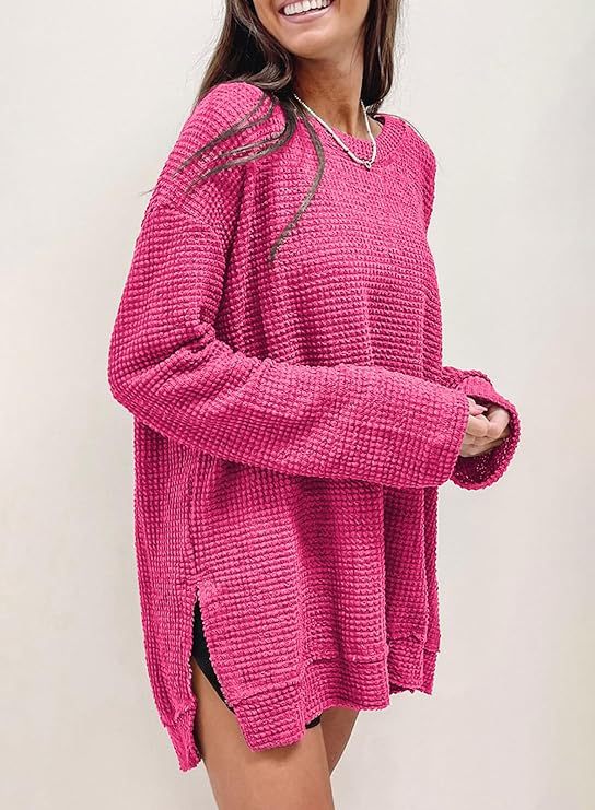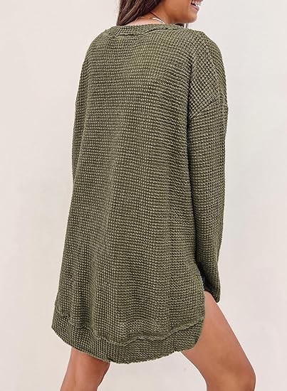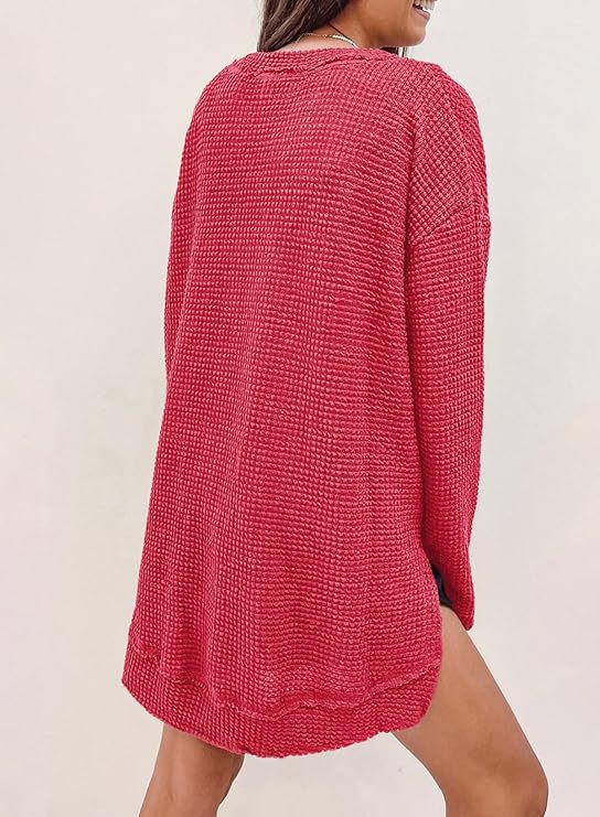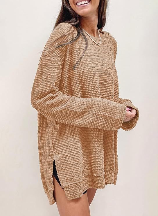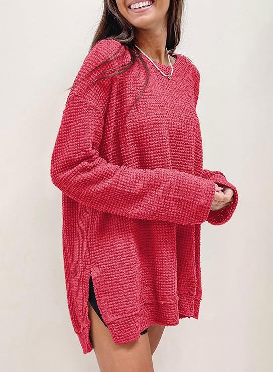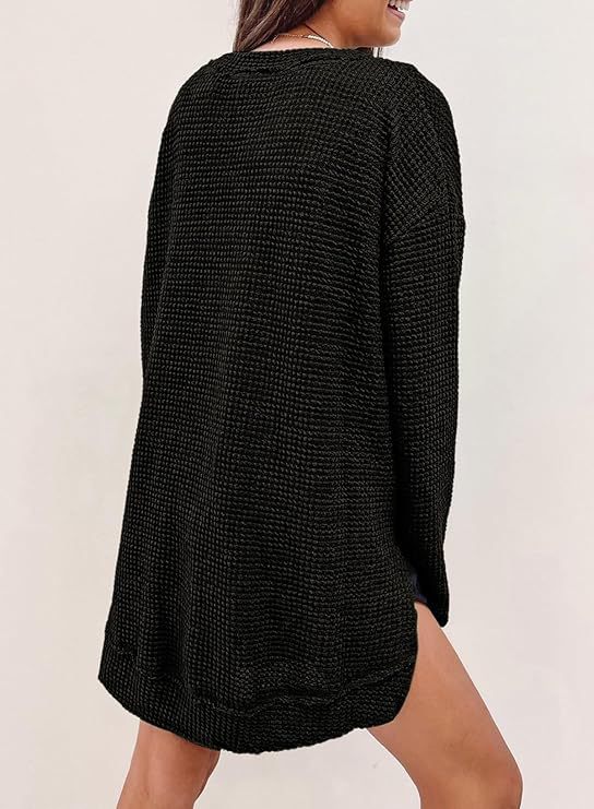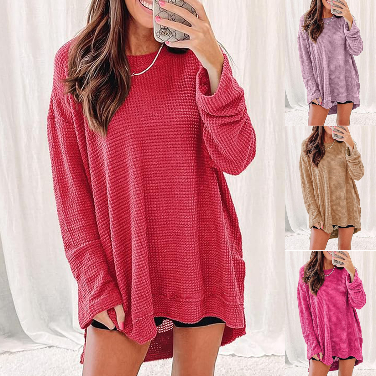 2025 유럽과 미국의 아마존 국경 간 기질 패션 솔리드 컬러 와플 루즈 라운드 넥 긴팔 슬릿 탑 여성 의류스토어 가기