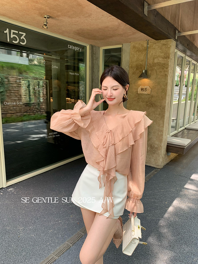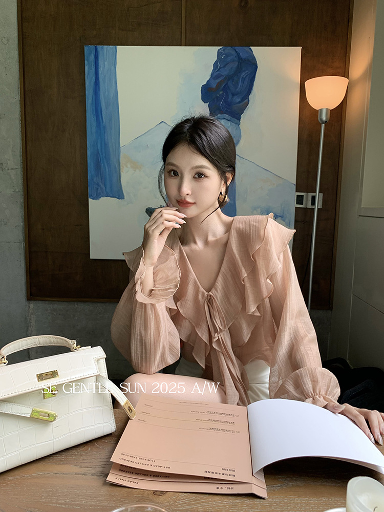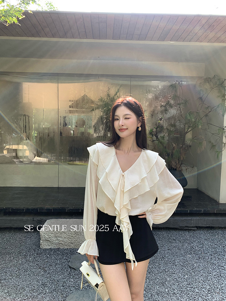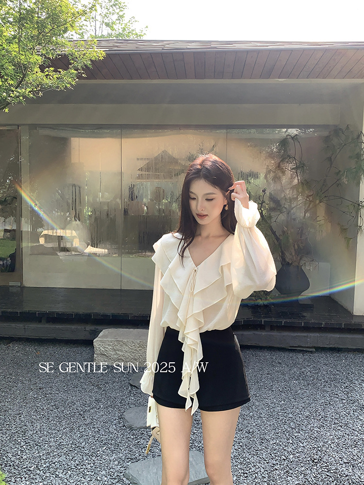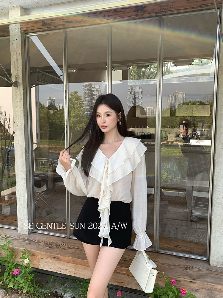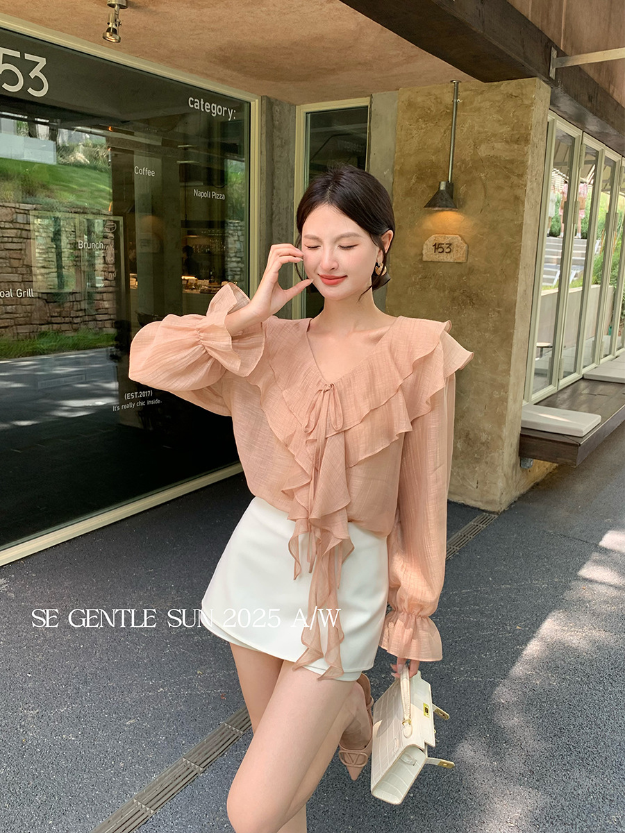 Xiuxixi 2025 가을 화이트 라벨 슬리밍 기질 다용도 연잎 브이넥 쉬폰 탑 여성용 긴팔 셔츠 89553