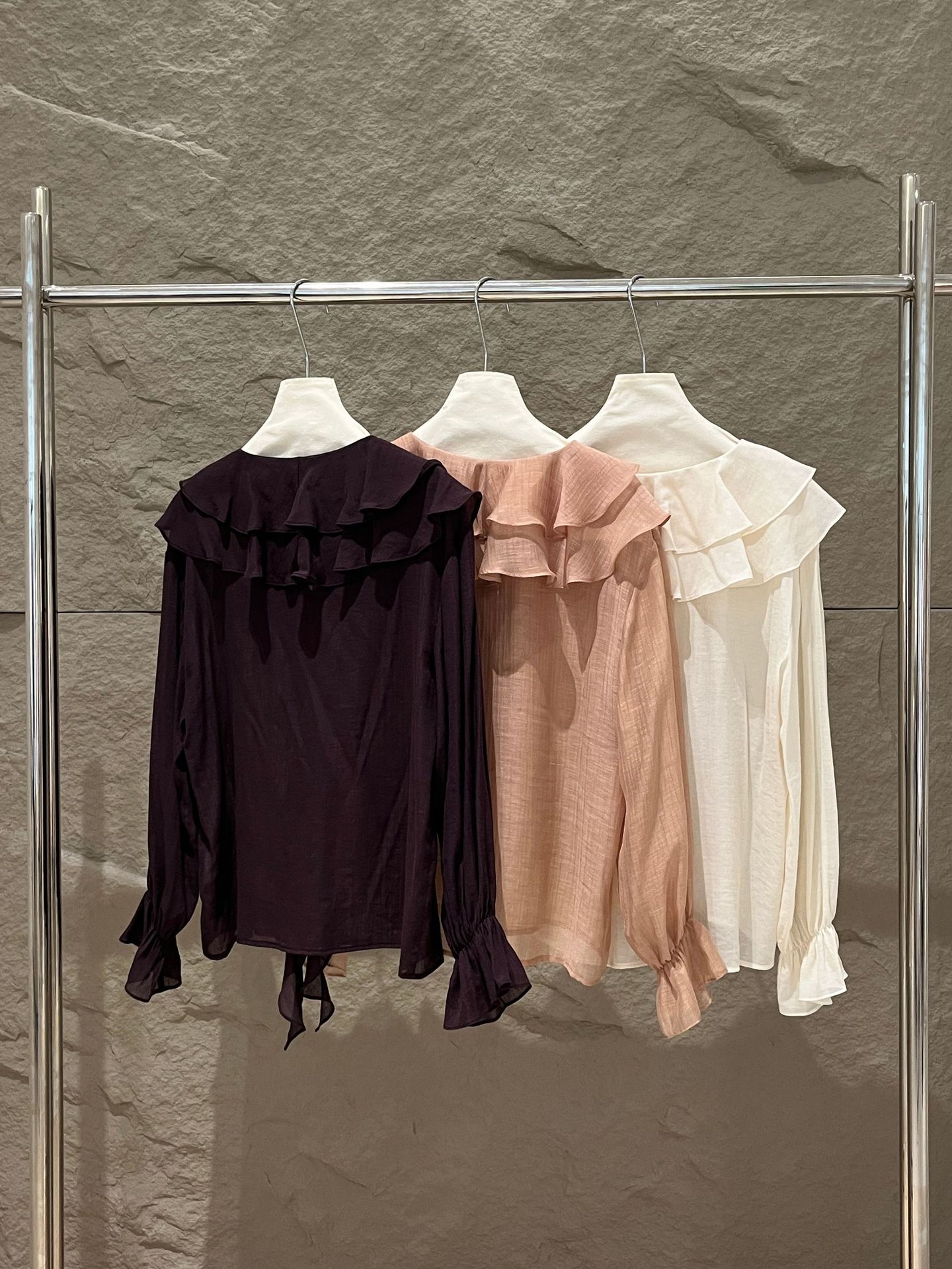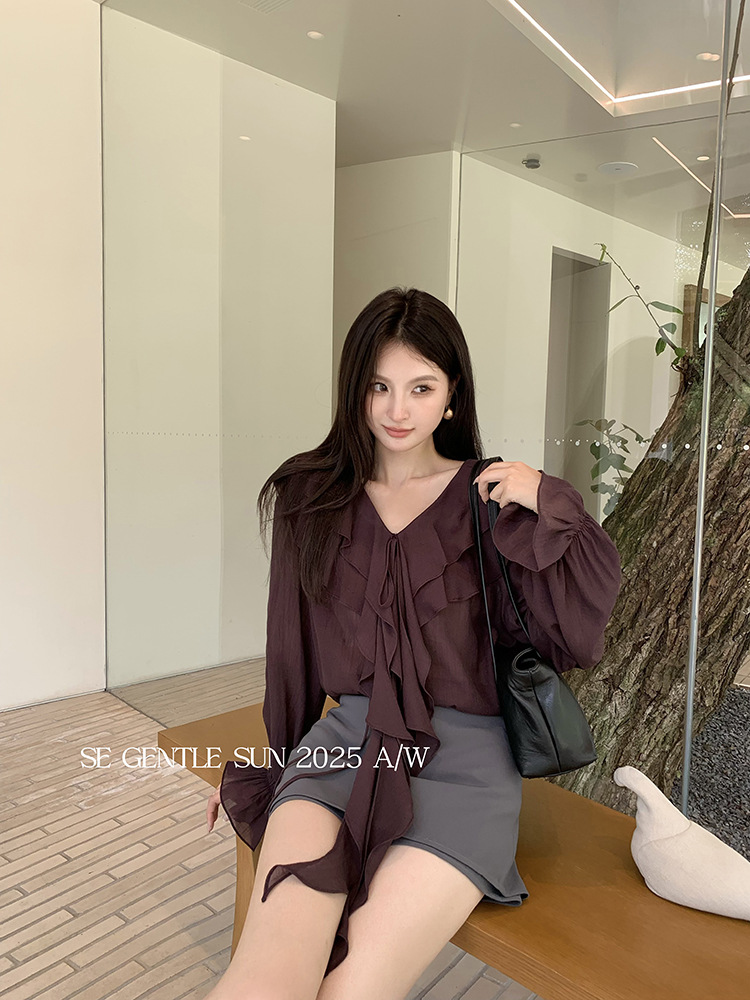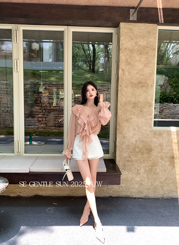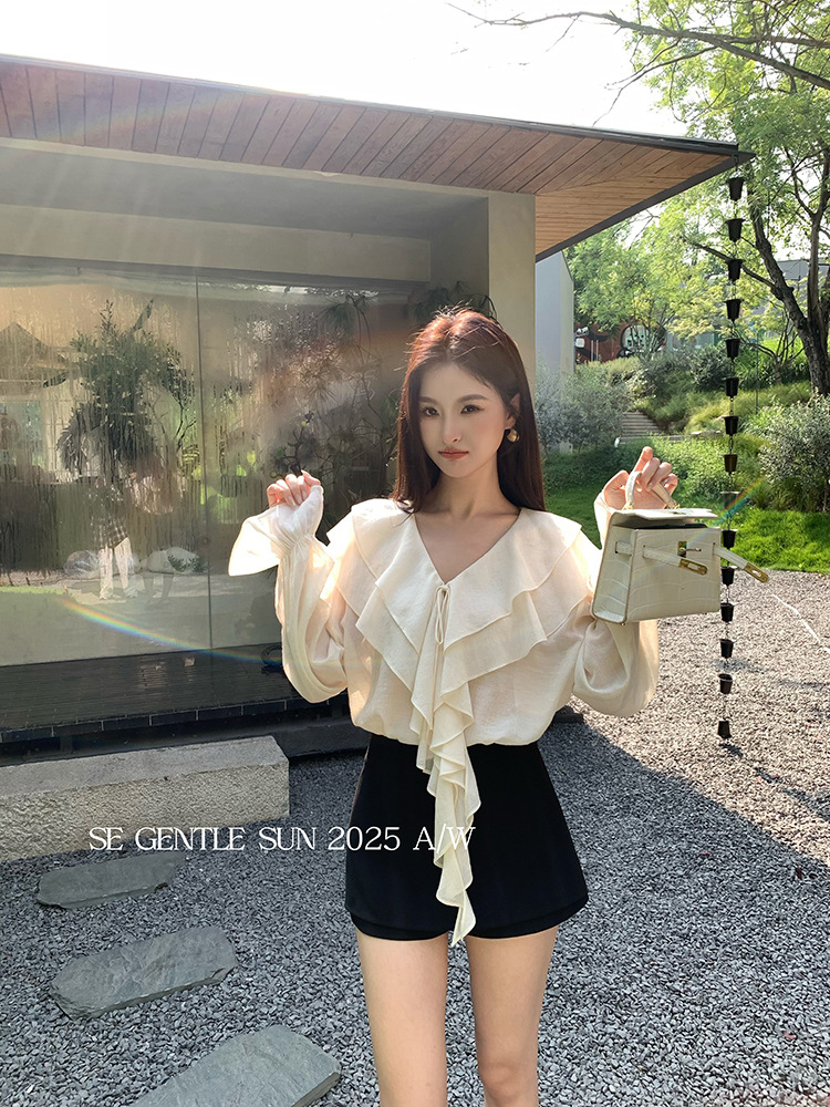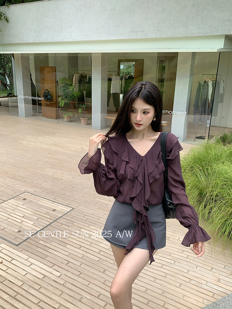 Xiuxixi 2025 가을 화이트 라벨 슬리밍 기질 다용도 연잎 브이넥 쉬폰 탑 여성용 긴팔 셔츠 89553