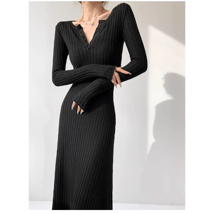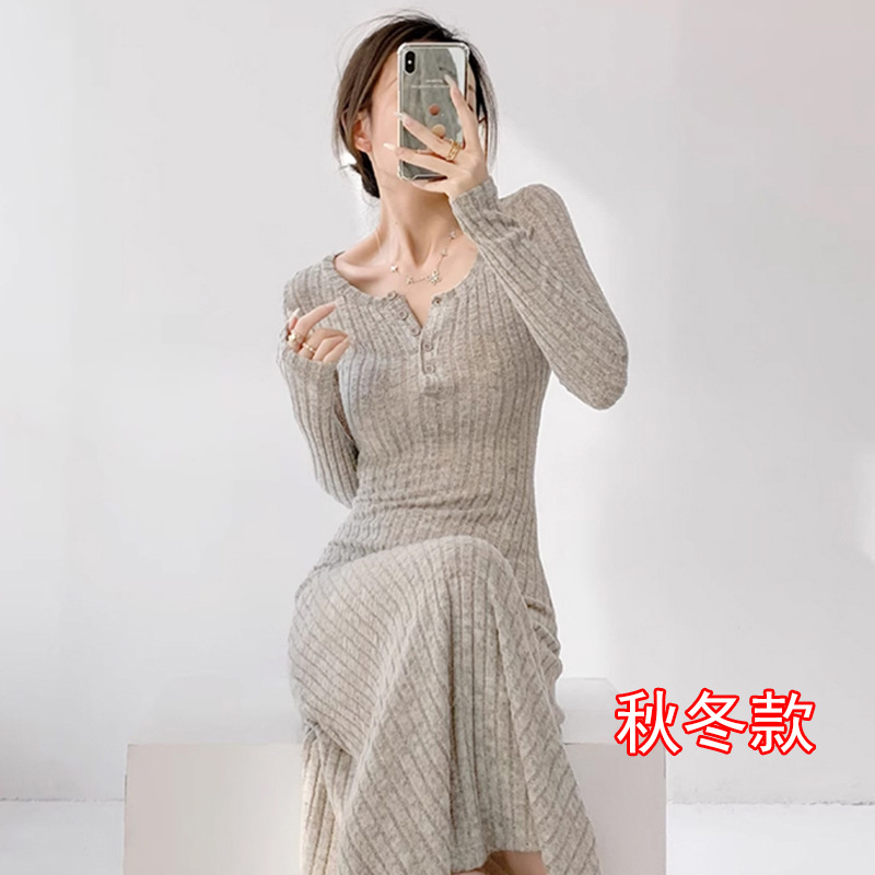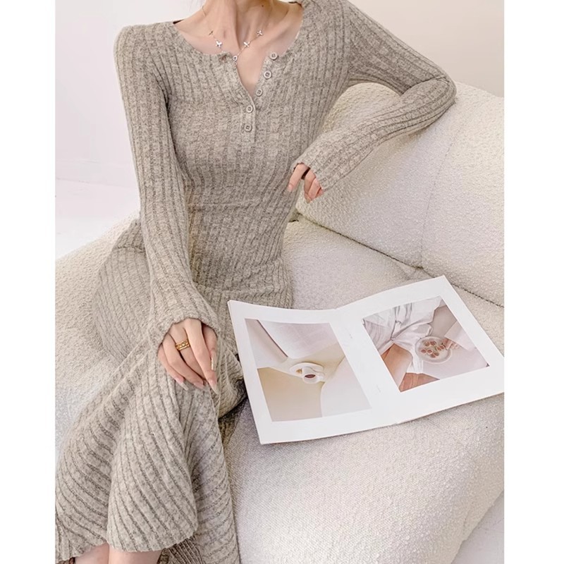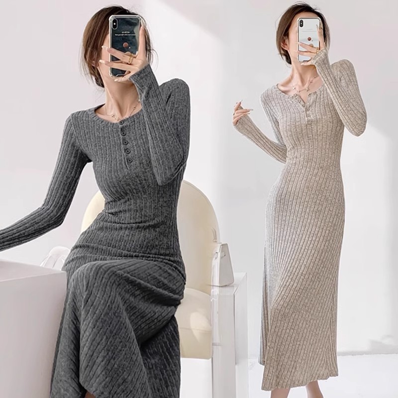 2025 새로운 프랑스 가을 겨울 스타일 허리 슬림 롱 스커트 바닥 슬리밍 긴팔 니트 드레스 스커트