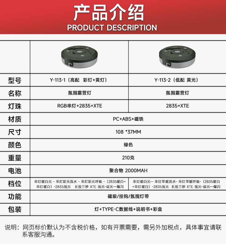• Y-113 캠핑 라이트 노란색 표시등(베어 램프 + 내장 리튬 배터리 + 데이터 케이블 + 컬러 박스) 로우 버전