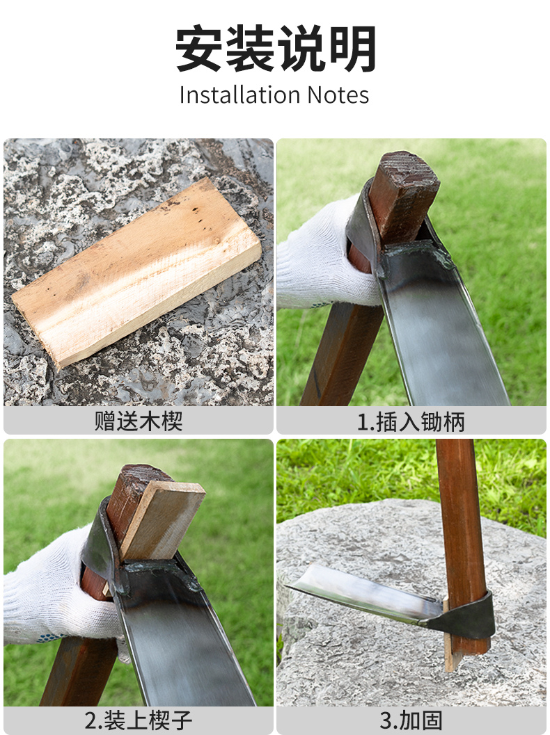 • [작은 넓은 괭이 + 1.4m 메뚜기 나무 손잡이] 수십 년 동안 내구성이 있는 나무 쐐기 + 장갑이 함께 제공됩니다.
