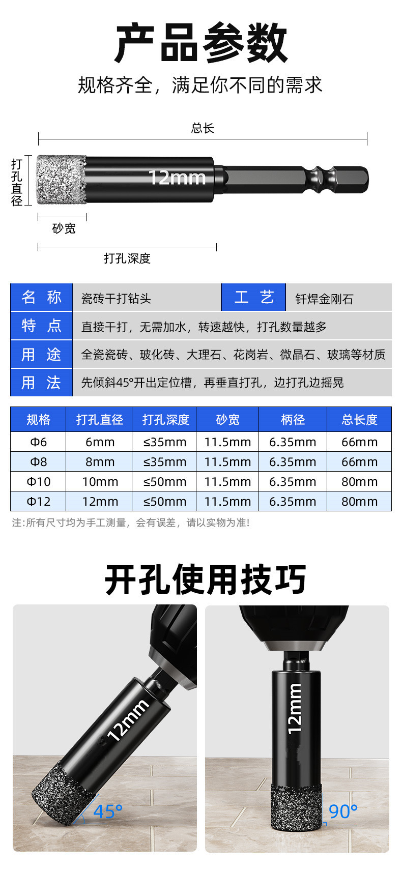• B 브레이징 건식 타일 드릴 비트 [6+8] 총 2개의 육각형 핸들