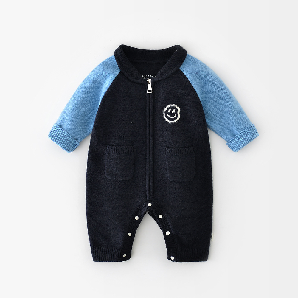 2025 새로운 가을 한국 스타일 어린이 라글란 슬리브 대비 색상 크롤링 슈트 신생아 만화 웃는 얼굴 점프 슈트 53311스토어 가기