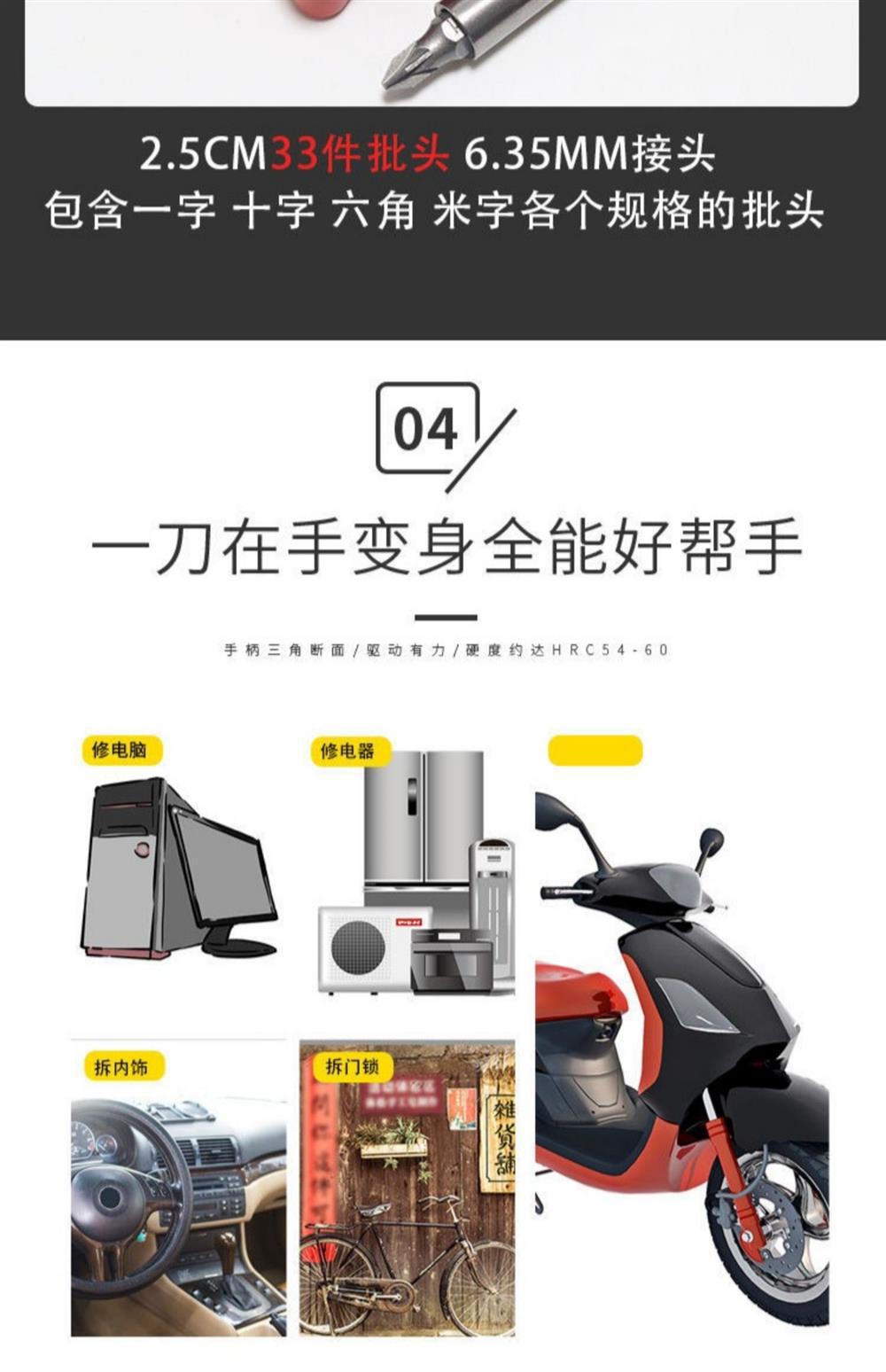 • 빠르고 쉬운 소켓 렌치(빨간색 및 검정색 핸들) + 솔리드 비트 33개