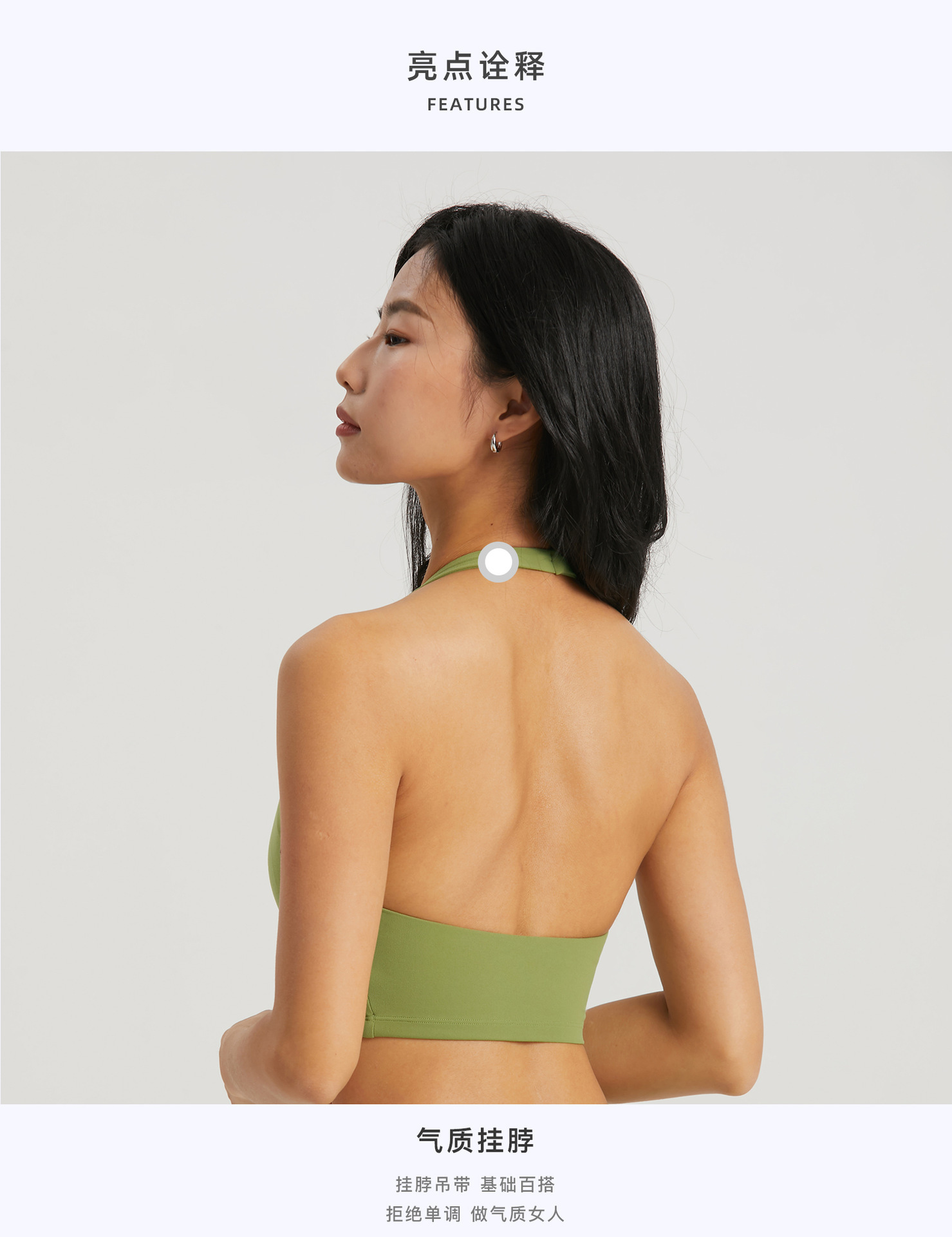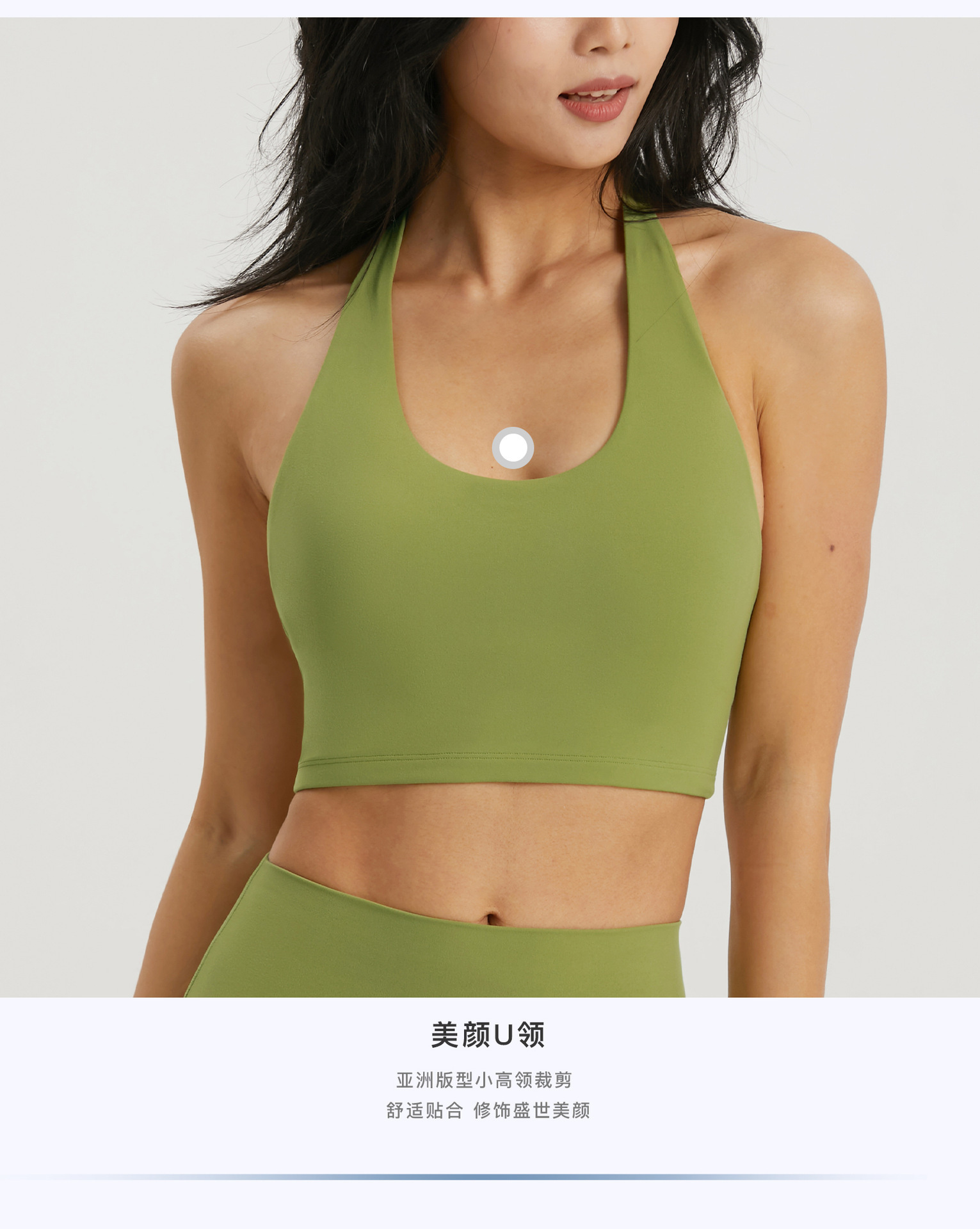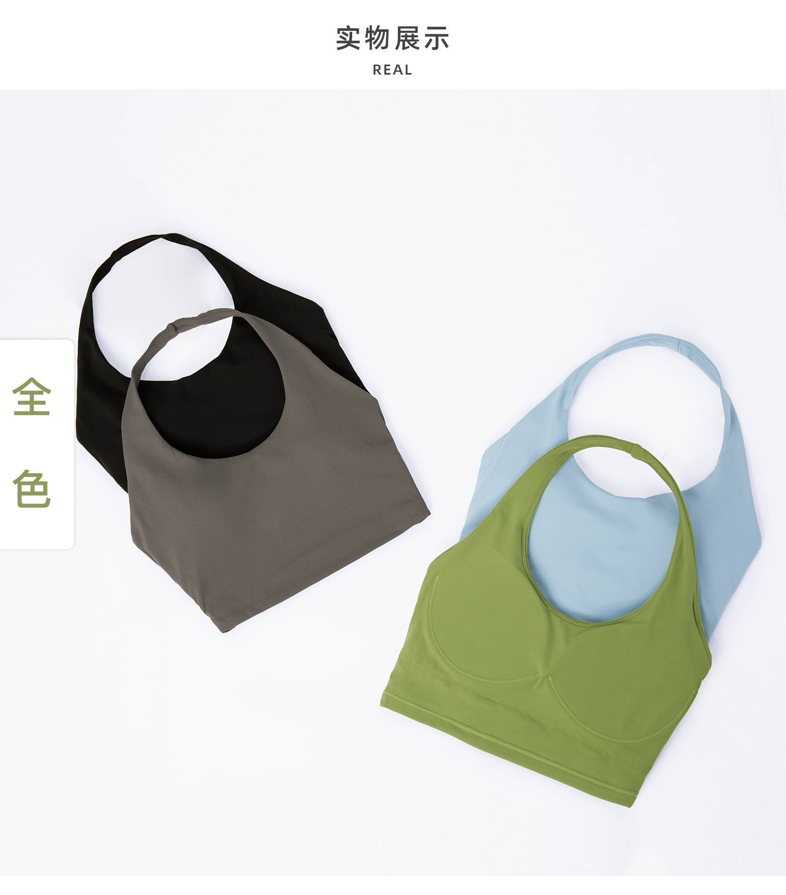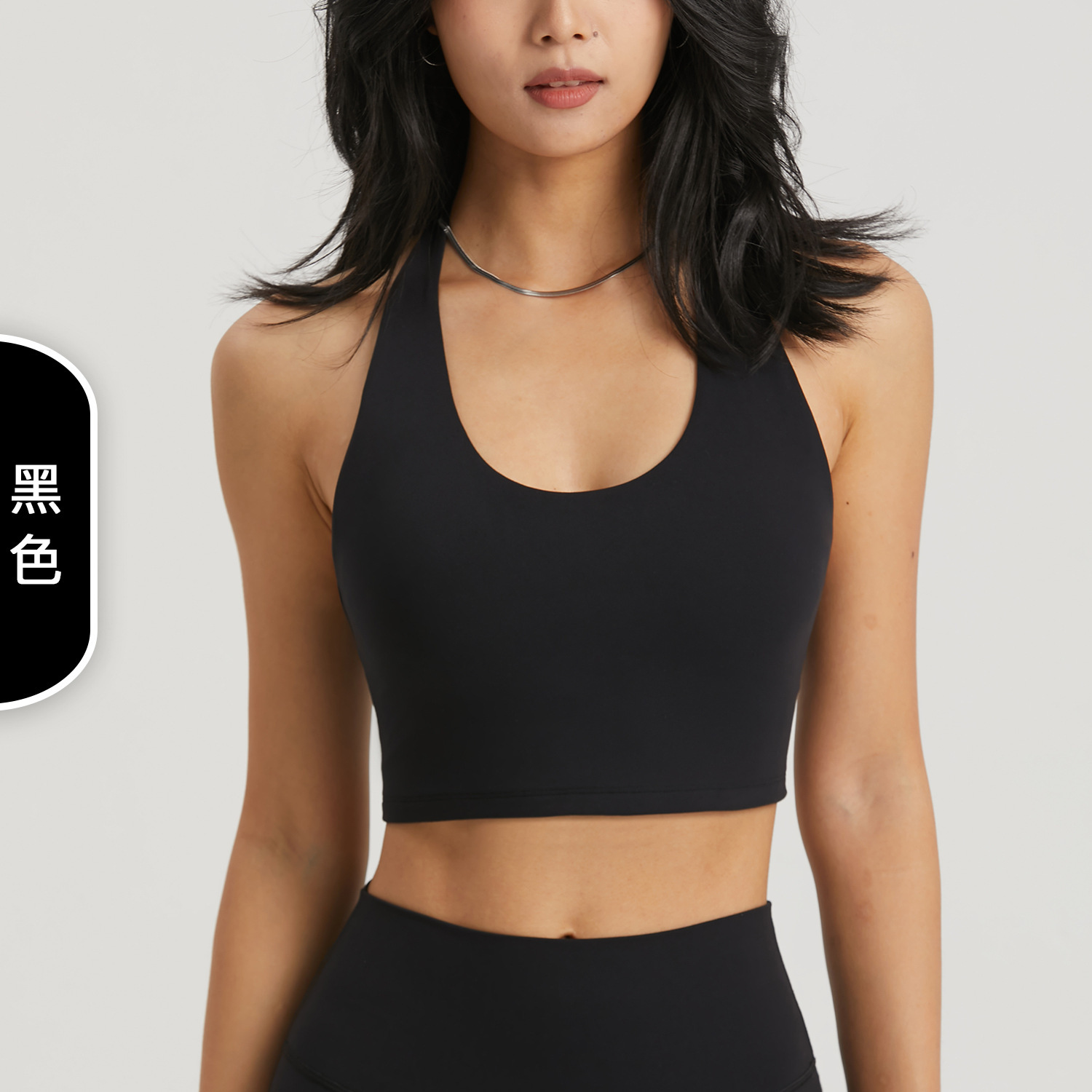 NUF 홀터넥 스포츠 브라, 고정컵 누드 느낌 요가탑, 아름다운 등 라인을 연출하는 푸쉬업 피트니스 브라, 여성용 가슴 패드 브라