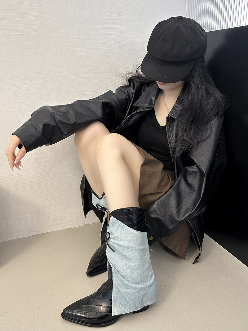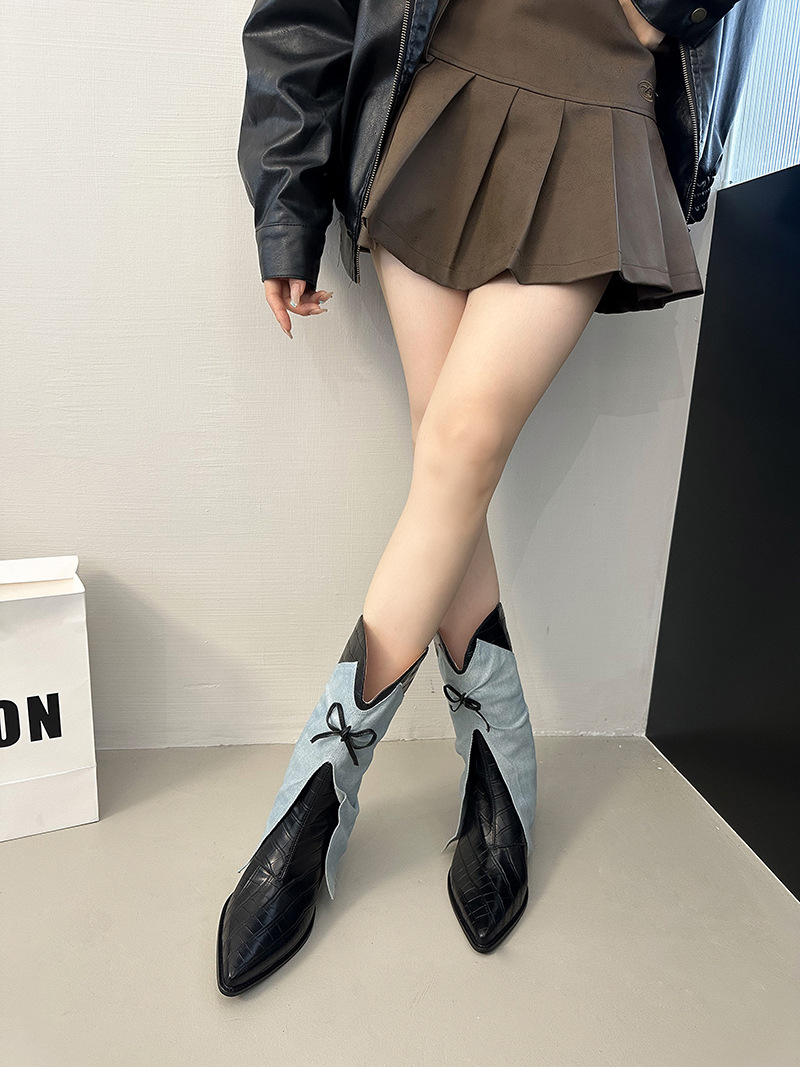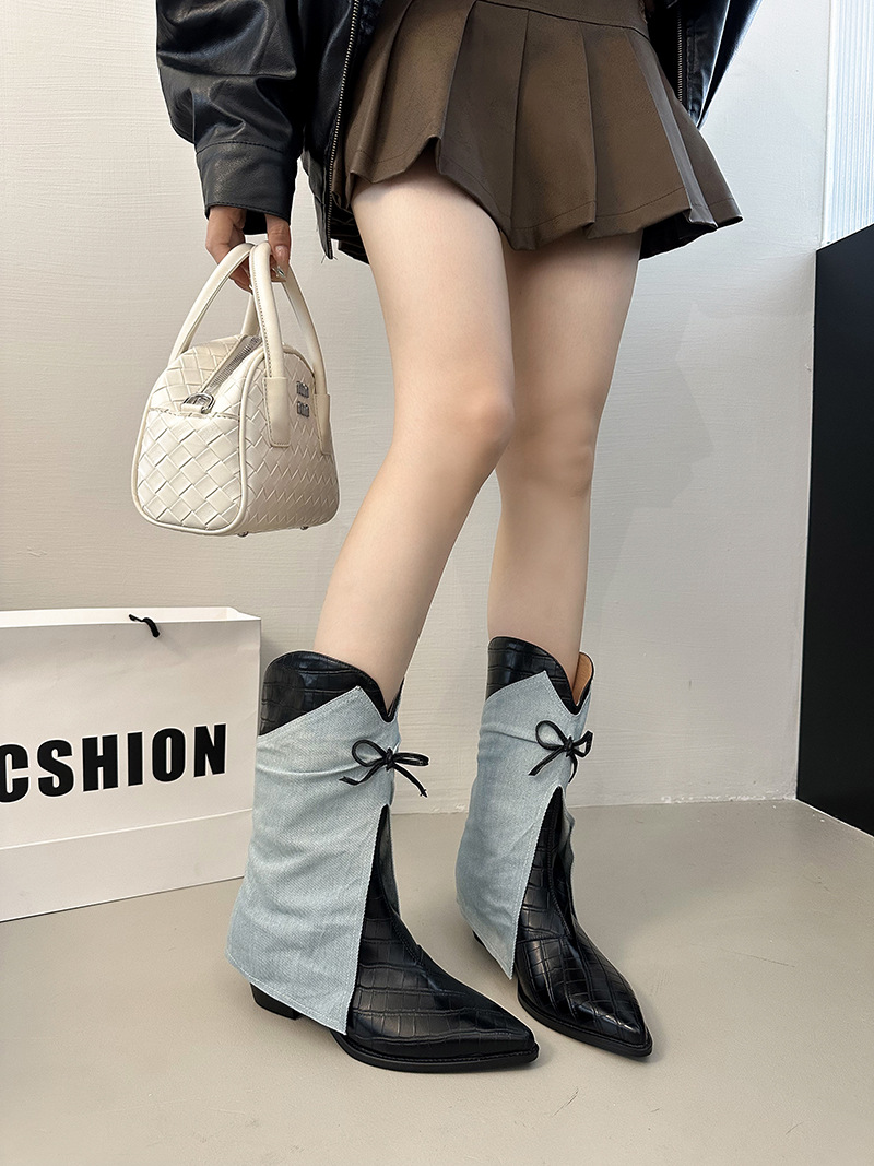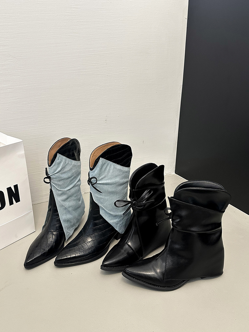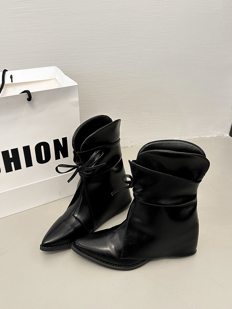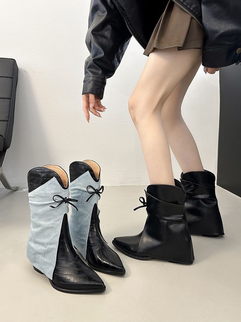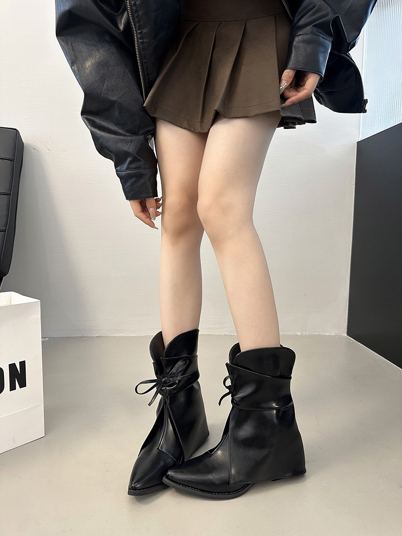 유럽과 미국 스타일의 부드러운 가죽 틈새 디자인 바지 부츠 뾰족한 발가락 플랫 바닥 스플 라이스 슬리밍 V 입 짧은 부츠 여성 여름 마틴 부츠스토어 가기