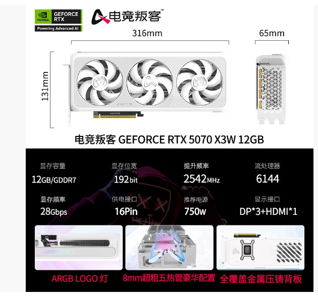 电竞叛客GeForce RTX 5070 X3W 12G DLSS 4 显卡台式机独立显卡
