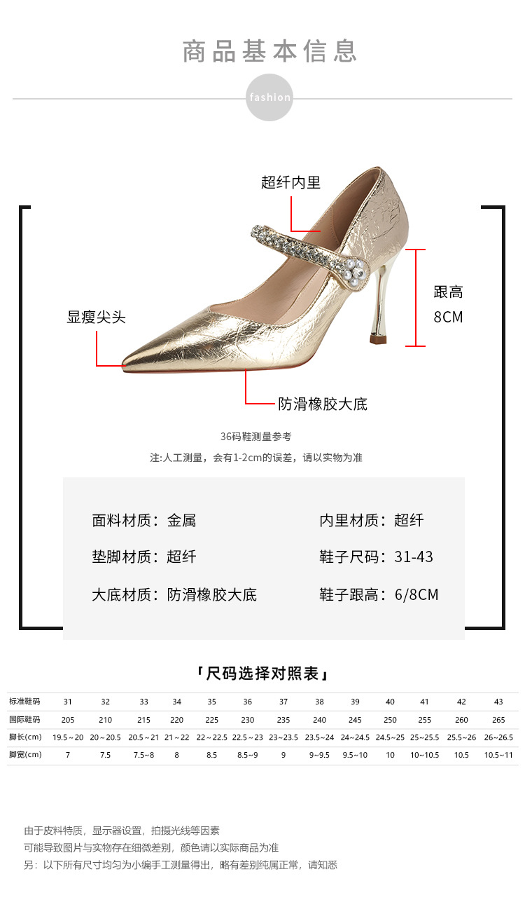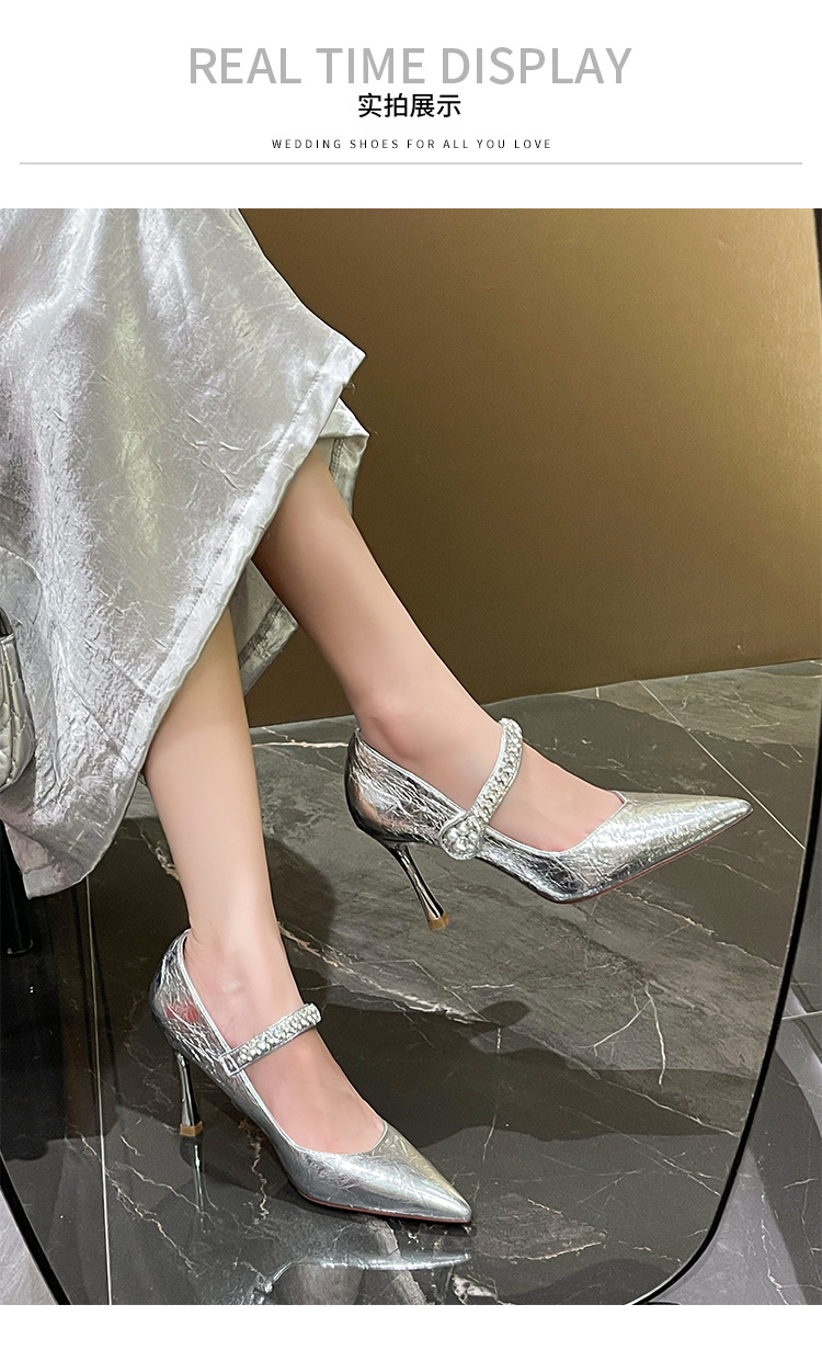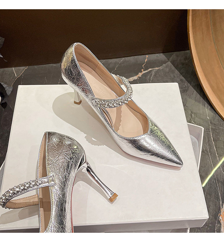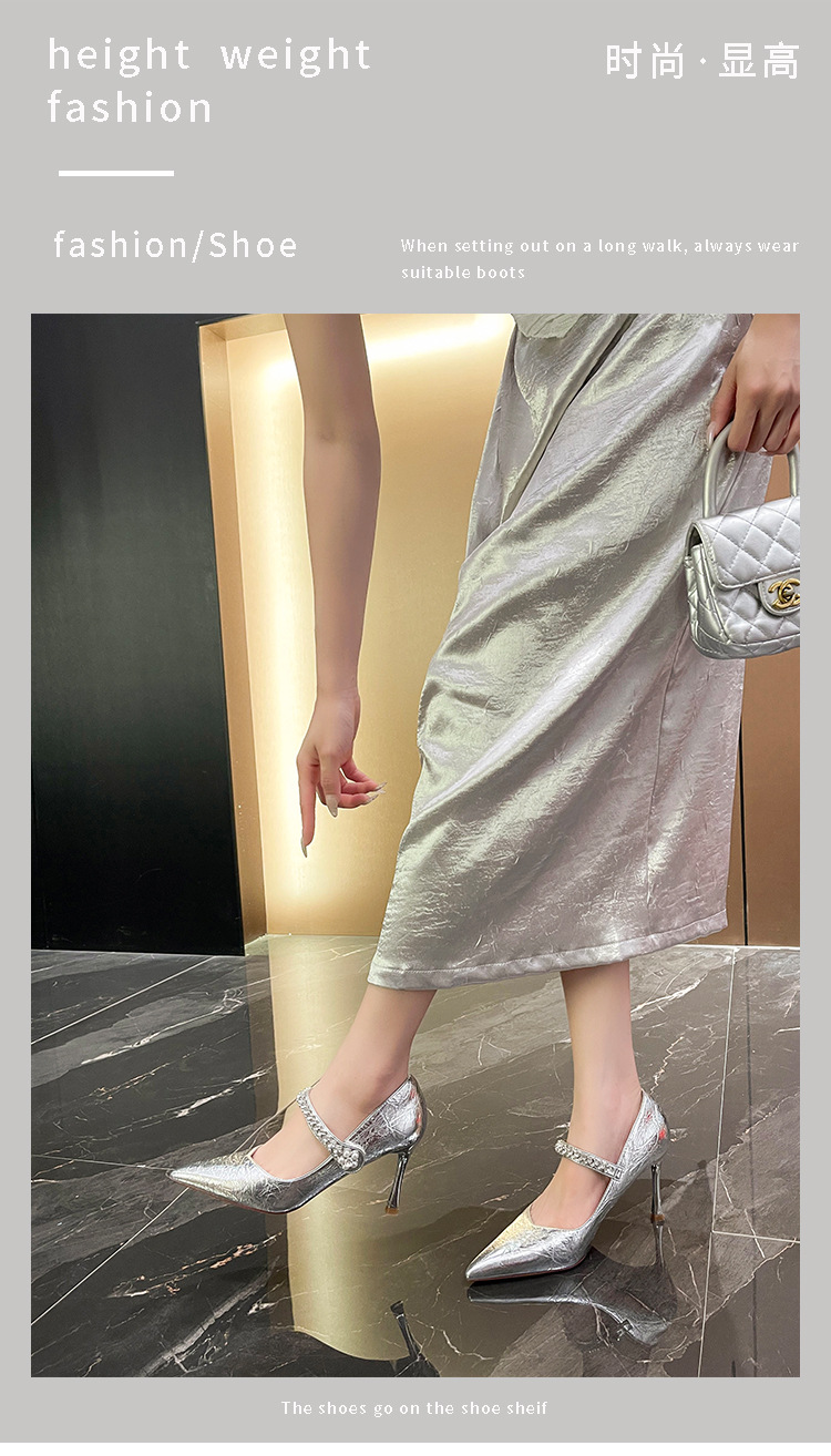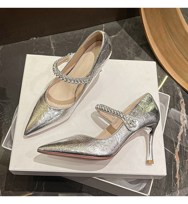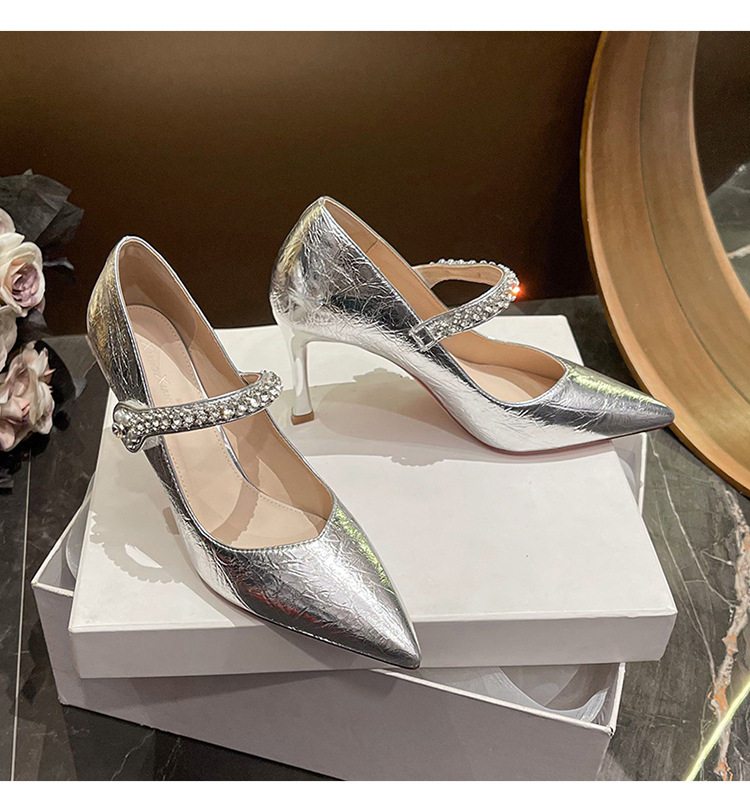 체인 스틸레토 힐이 달린 프렌치 포인티드 토 하이힐, 부드러운 가죽 메리제인 여성화, 라인스톤 펌프스, 큰 사이즈와 작은 사이즈의 싱글 슈즈스토어 가기