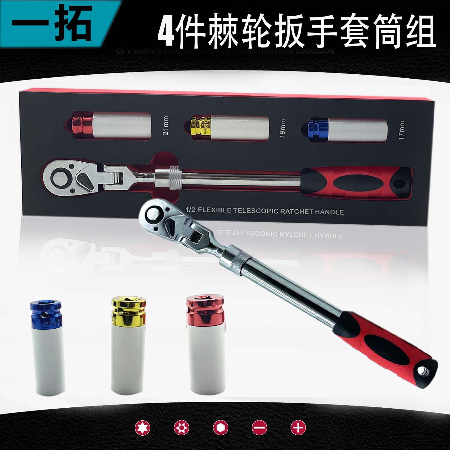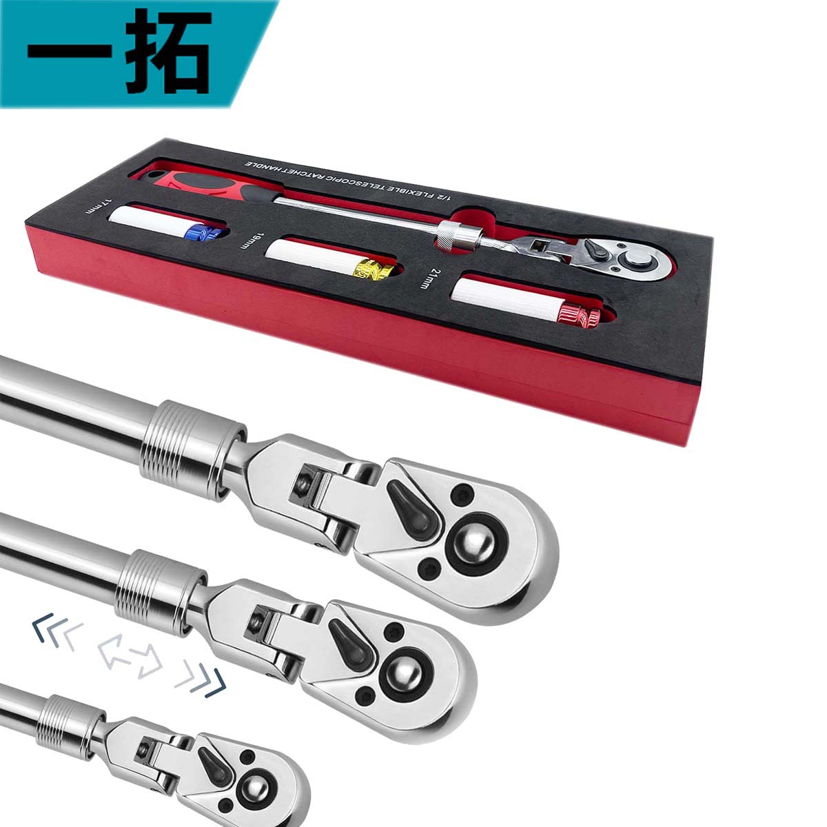 4피스 텔레스코픽 로커 래칫 렌치, 대형 플라이 24톱니 직선 핸들, 72톱니 곡선 핸들, 속도판 자동 수리 도구 세트