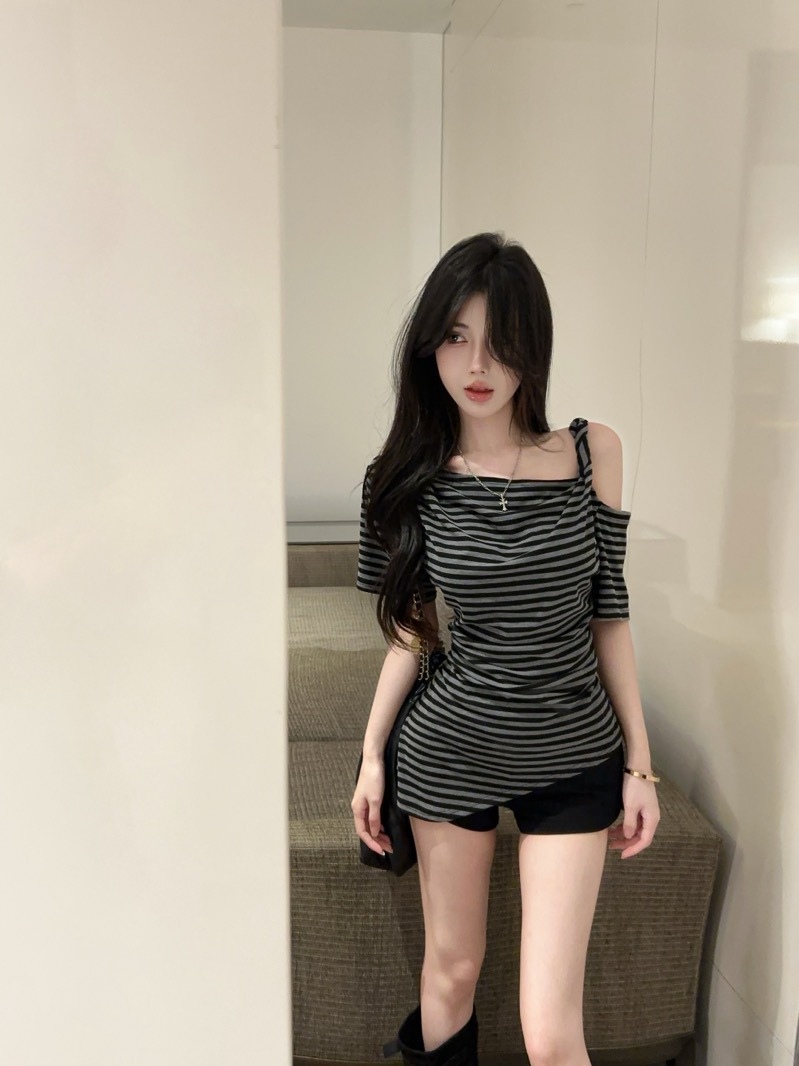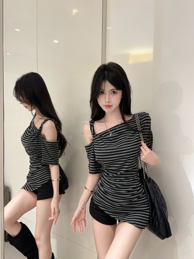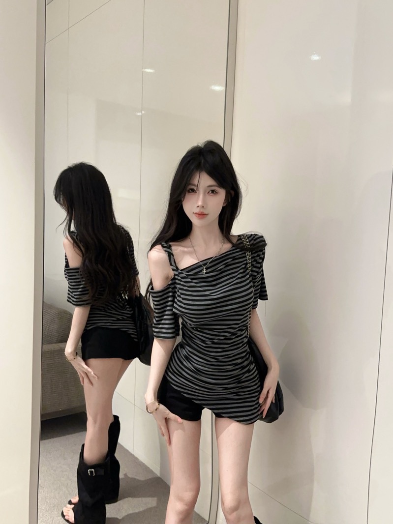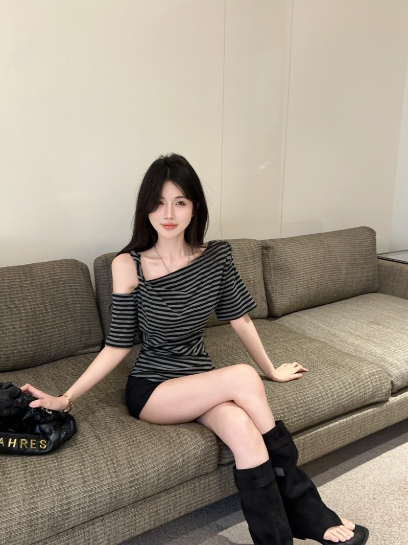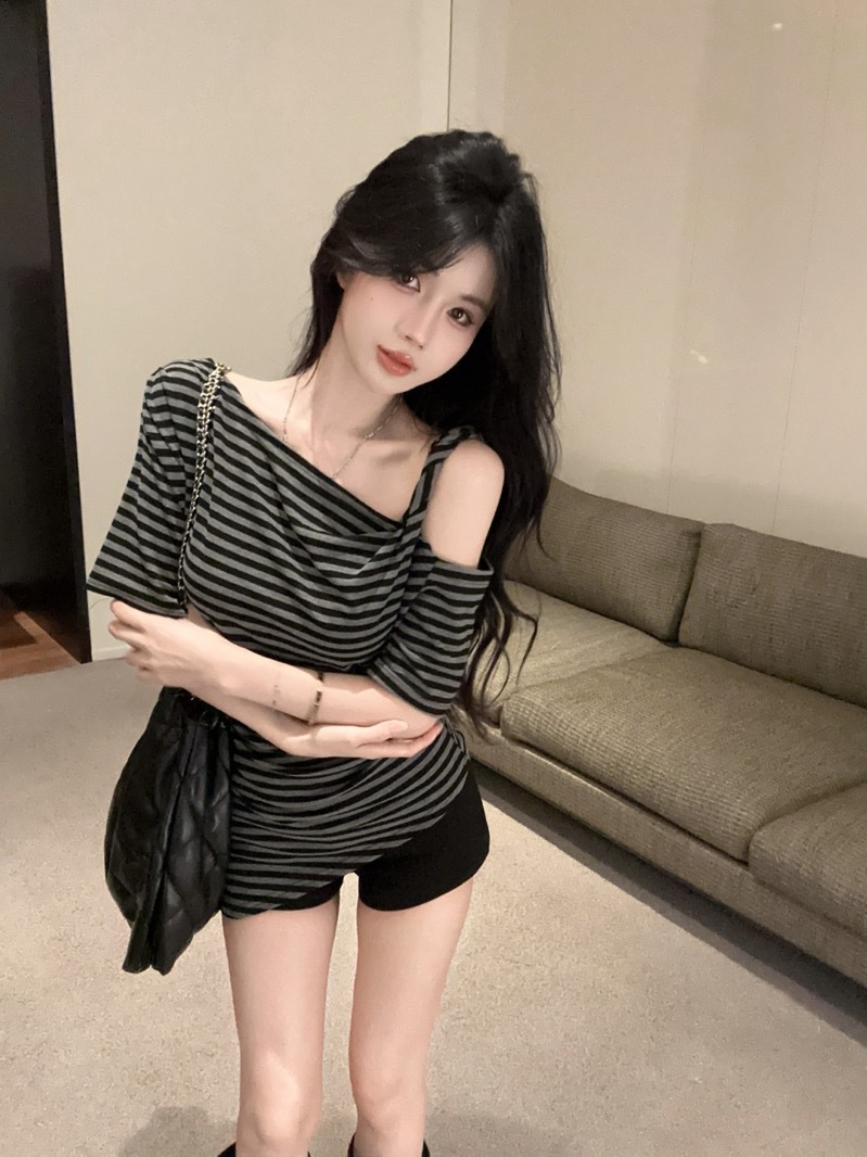 여름 여성을 위한 섹시한 핫걸 슬로프 숄더 대비 스트라이프 반팔 티셔츠 새로운 슬림핏 불규칙 스타일 탑