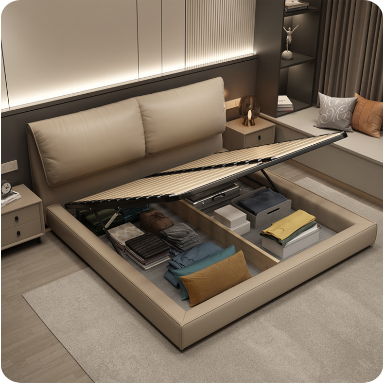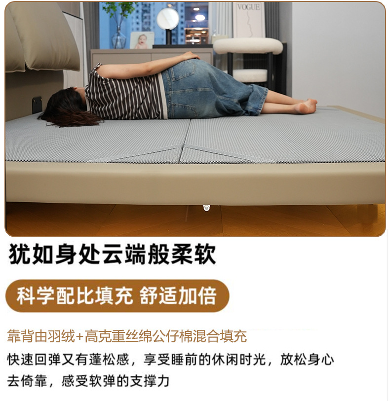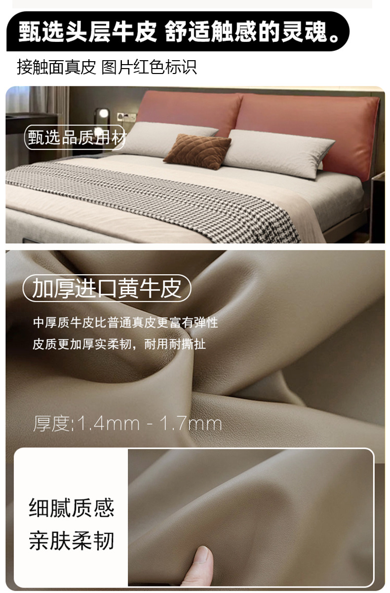 • 가죽 침대 [모든 단단한 나무 3D 조용한 조밀한 솔기 침대 보드] 나파 옐로우 소가죽 + 식물성 텐셀 패브릭 브랜드 매트리스