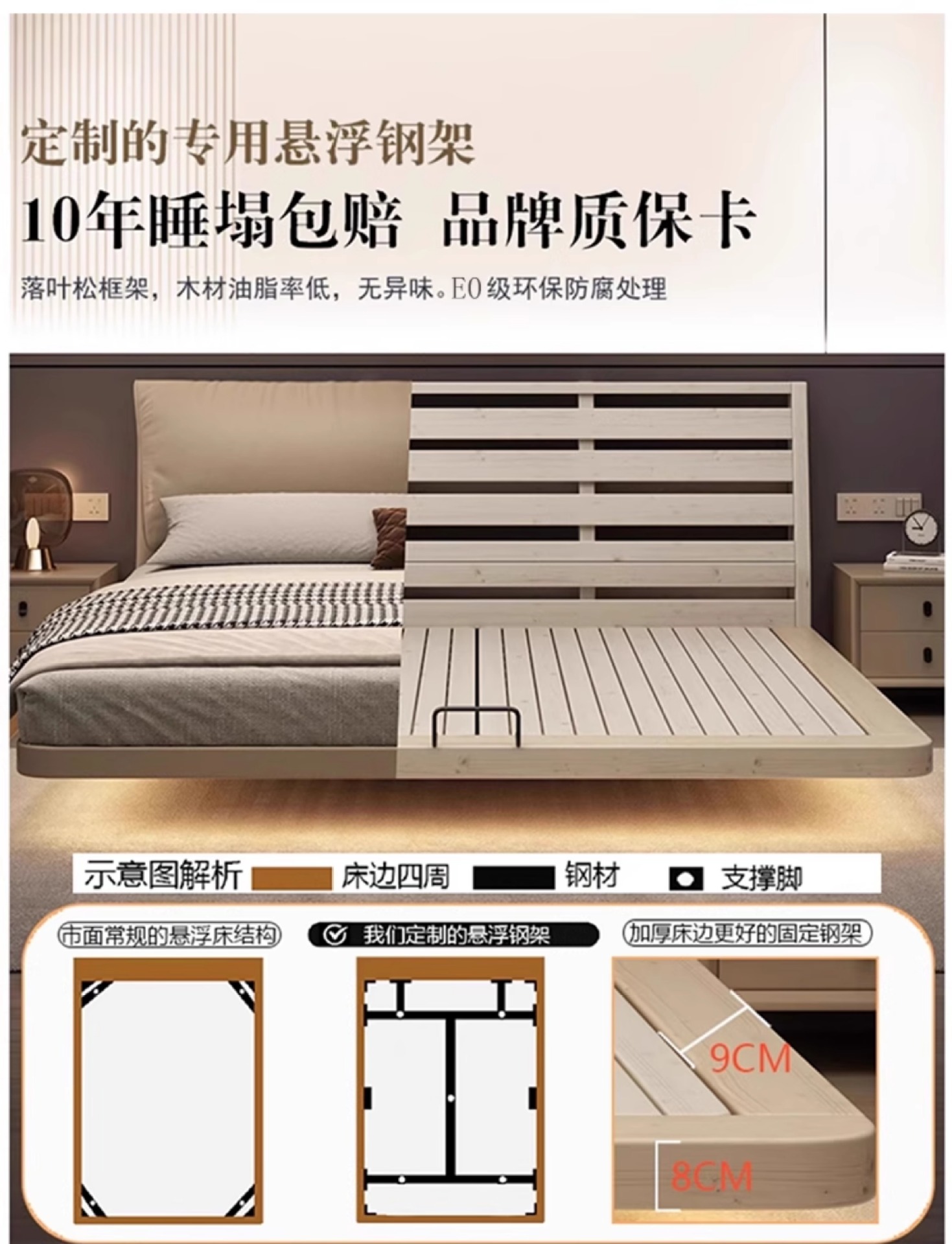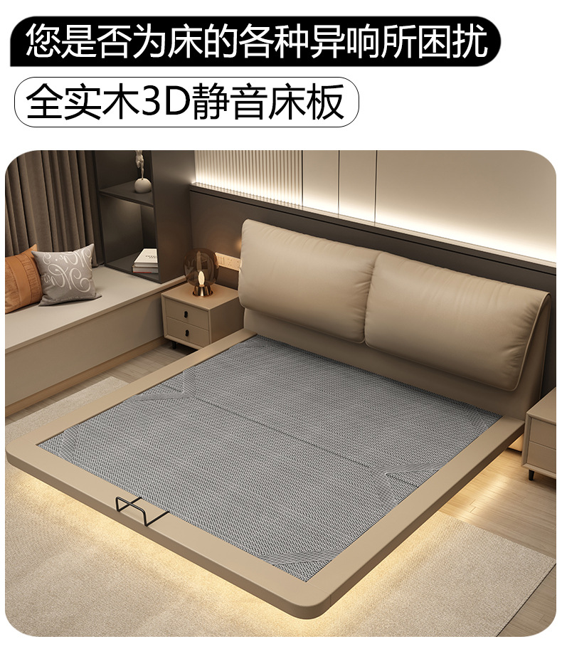 • 가죽 침대 [모든 단단한 나무 3D 조용한 조밀한 솔기 침대 보드] 나파 옐로우 소가죽 + 폴리머 브랜드 아이스 실크 패브릭 매트리스 + 침대 옆 테이블 * 1