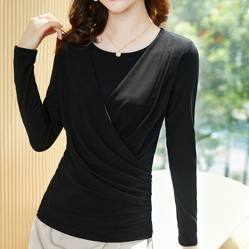 2025 봄 가을 신상 라운드넥 크로스 플리츠 배 커버 셔츠, 스타일리시하고 슬림한 여성용 셔츠 상의스토어 가기