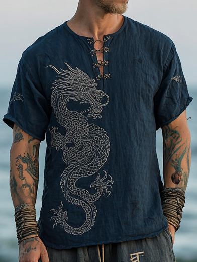 跨境夏季男士麻料短袖休闲圆领T恤3D民族风数码印花短袖量大价优