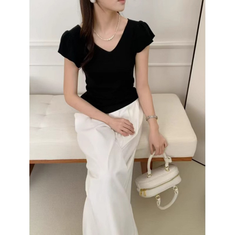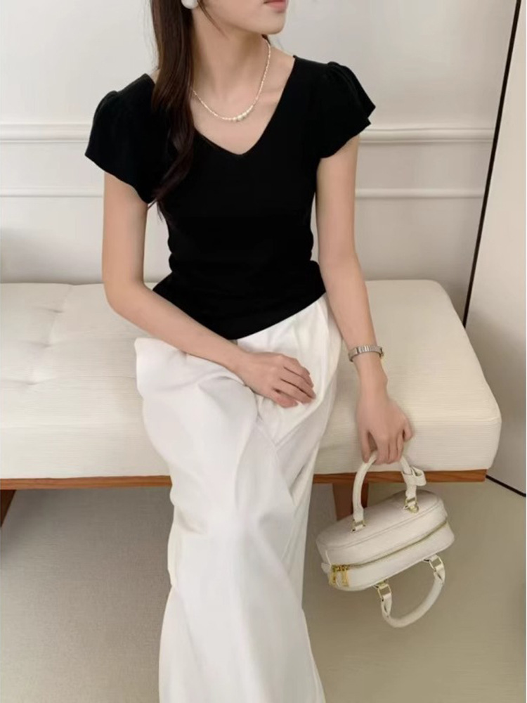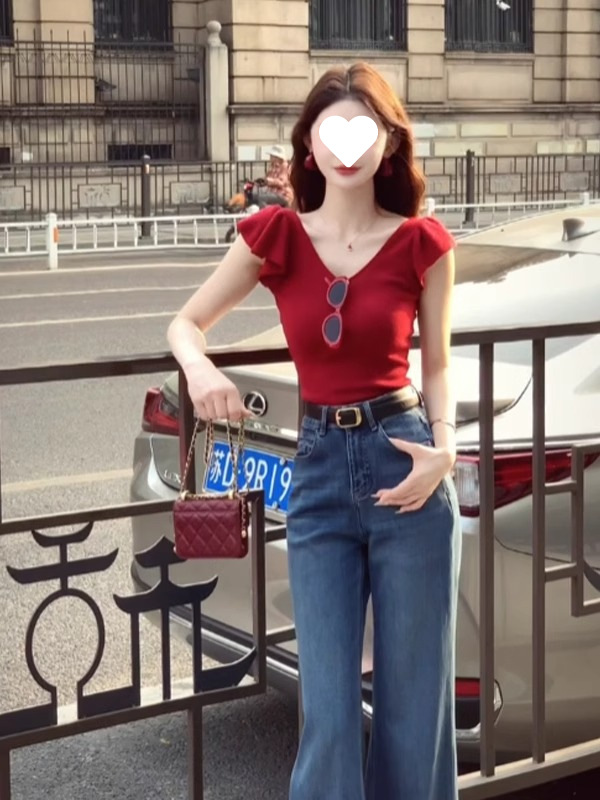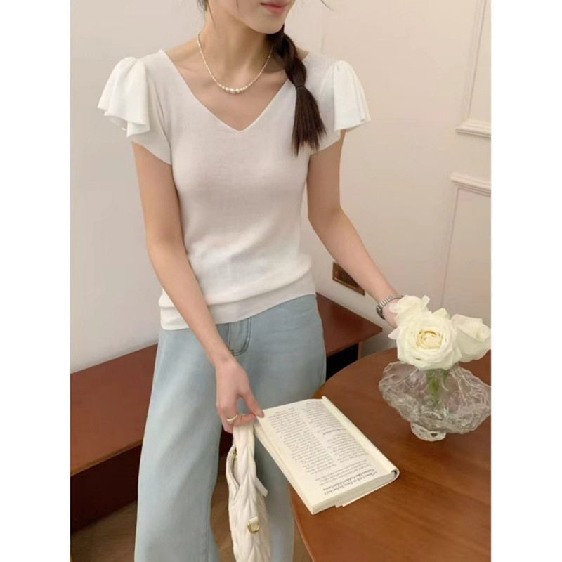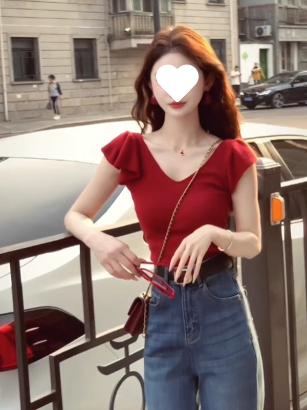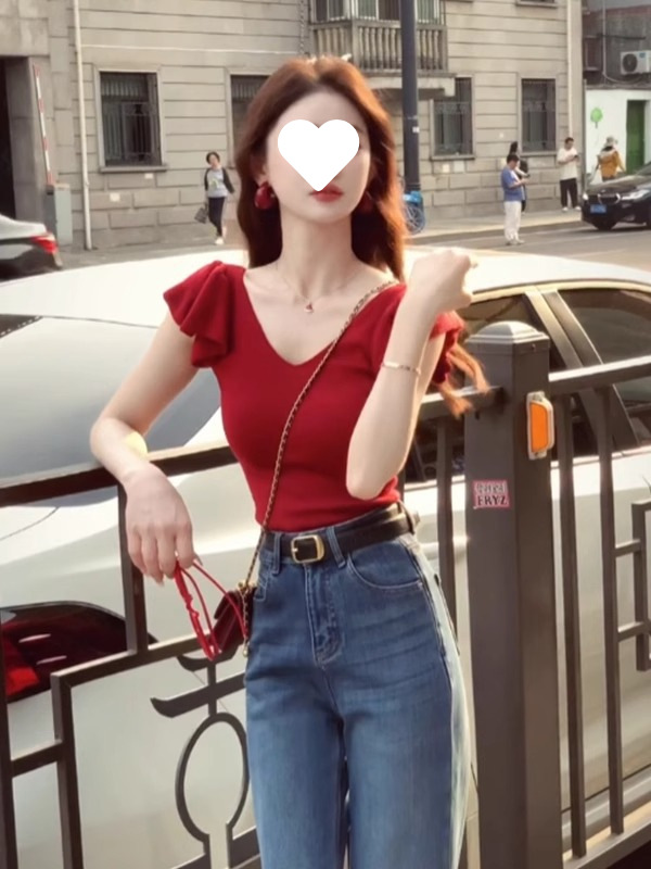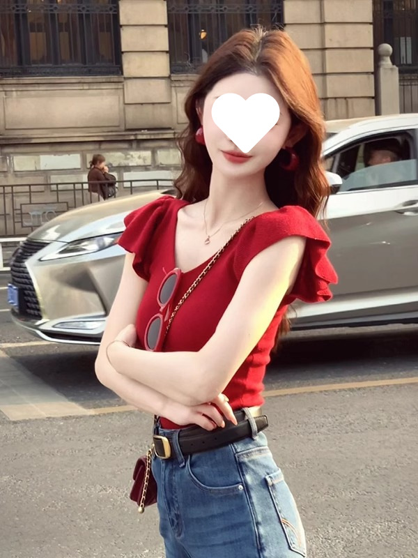 여름 디자인 틈새 시장 독특하고 아름다운 슬림핏 작은 플라잉 슬리브 탑 여성용 프렌치 레드 브이넥 니트 반팔 티셔츠스토어 가기