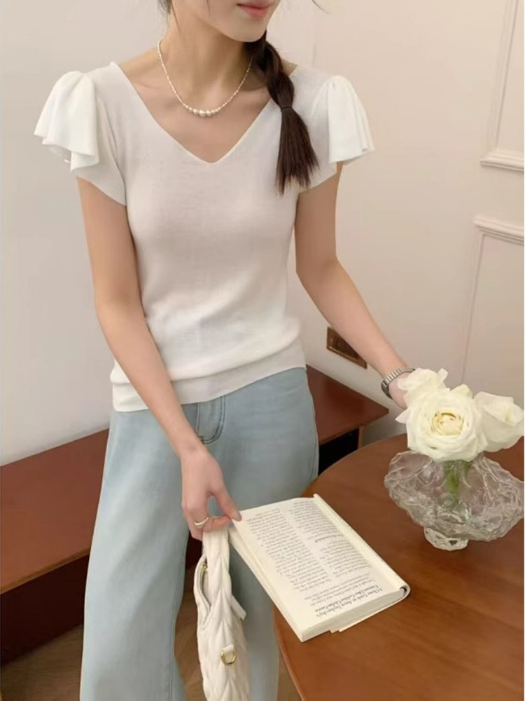 여름 디자인 틈새 시장 독특하고 아름다운 슬림핏 작은 플라잉 슬리브 탑 여성용 프렌치 레드 브이넥 니트 반팔 티셔츠