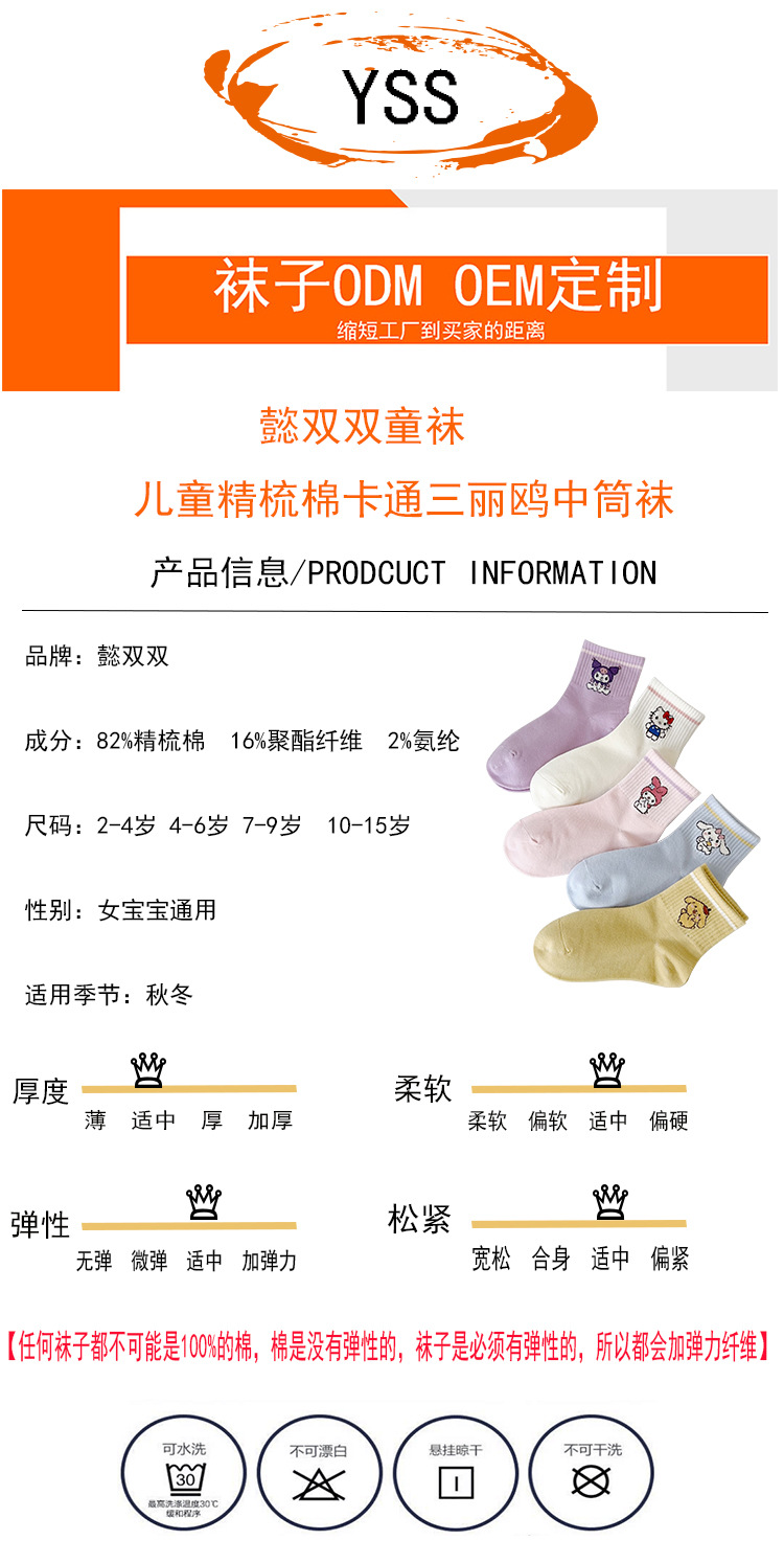 Yishuangshuang 어린이 양말 가을, 겨울 새로운 만화 Sanrio 중간 튜브 양말 빗질면 한국어 버전 소녀 유행 양말 학생스토어 가기