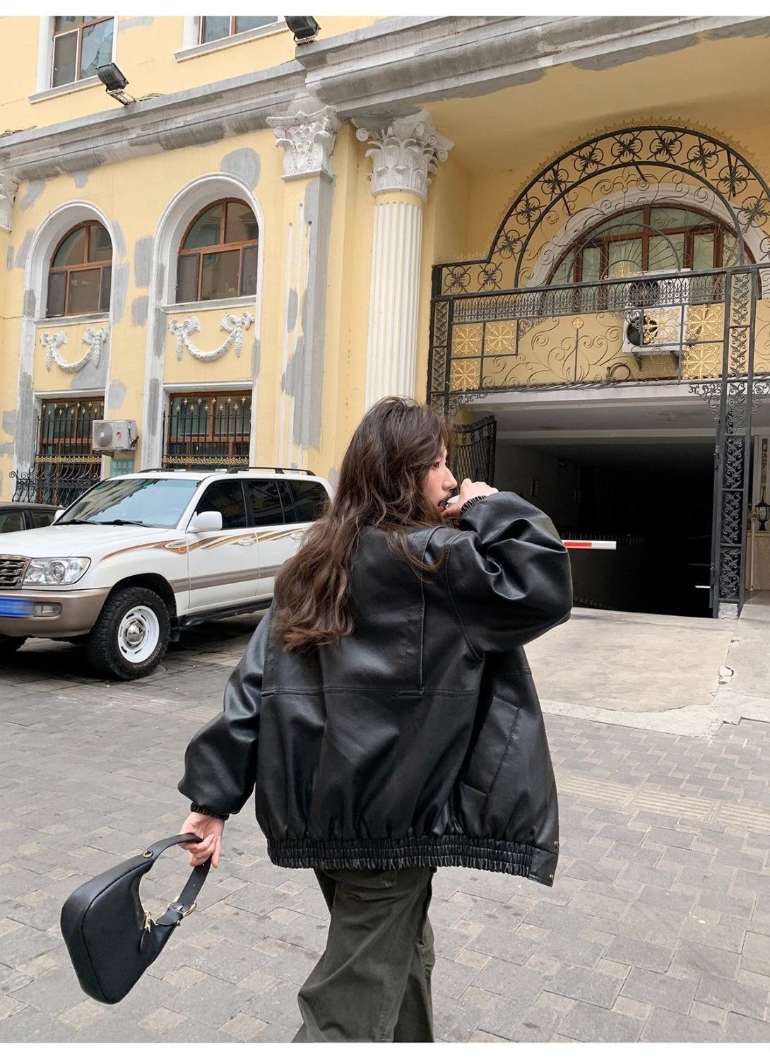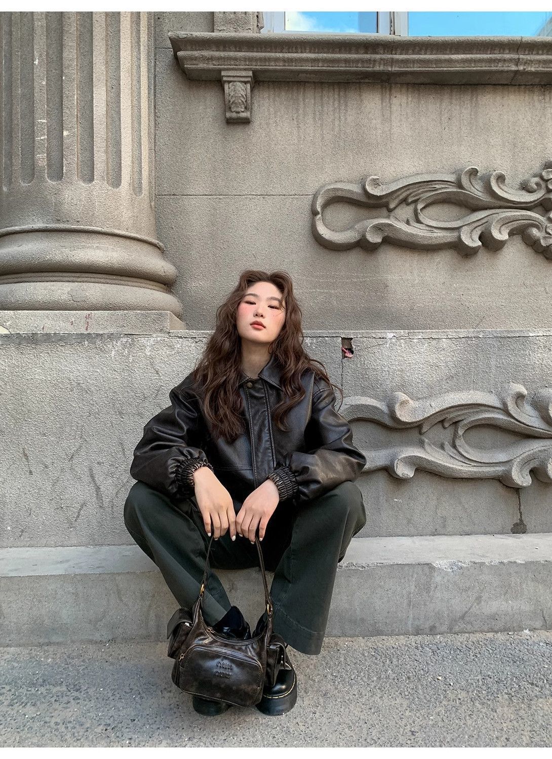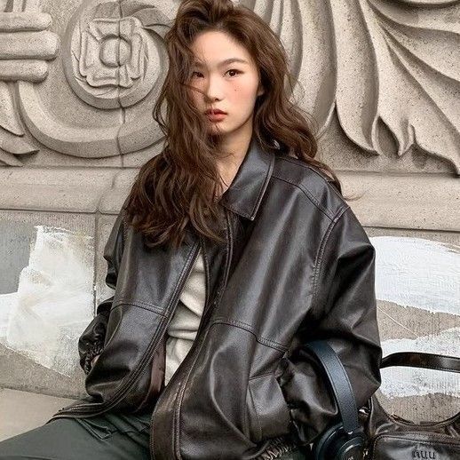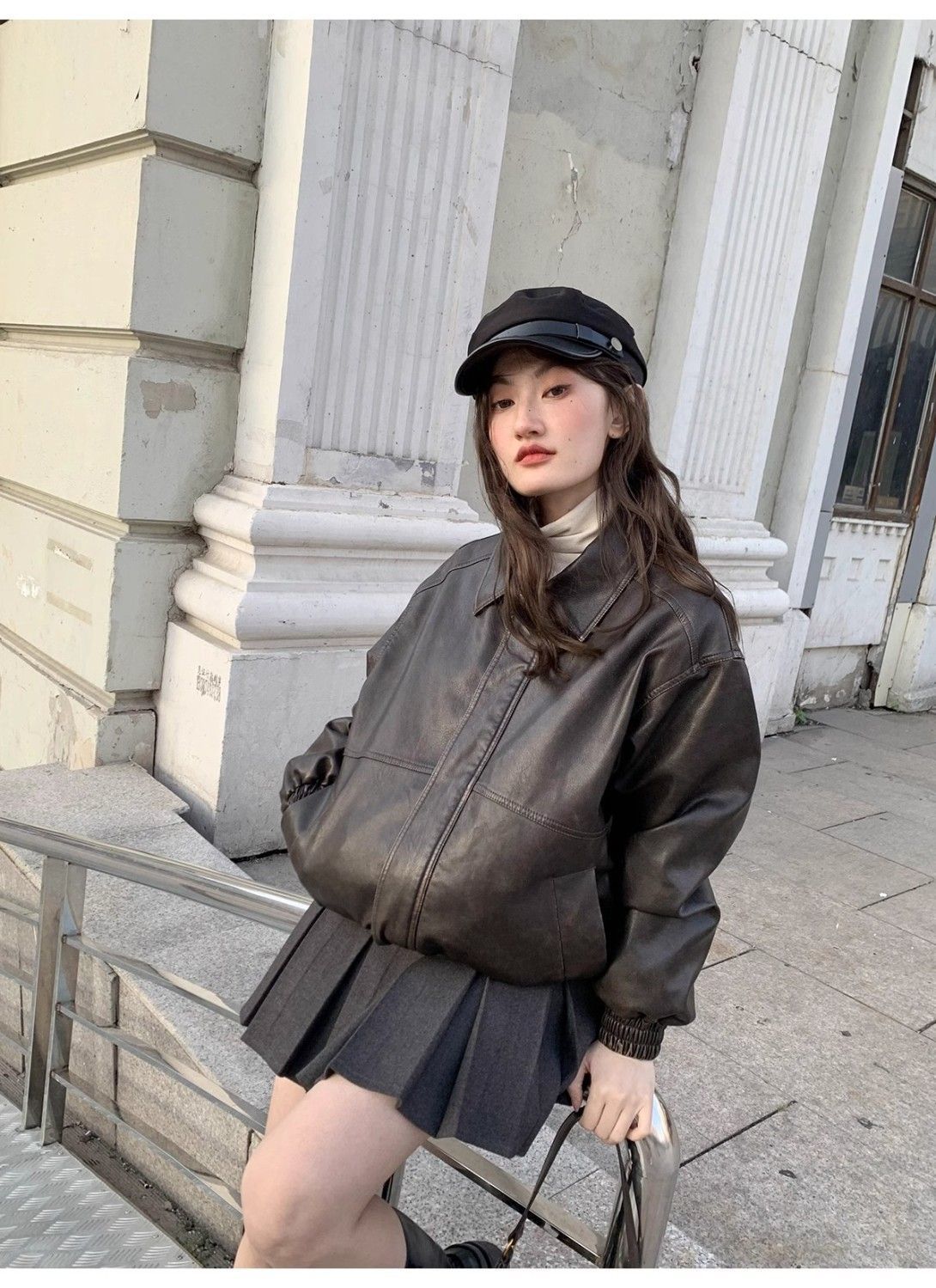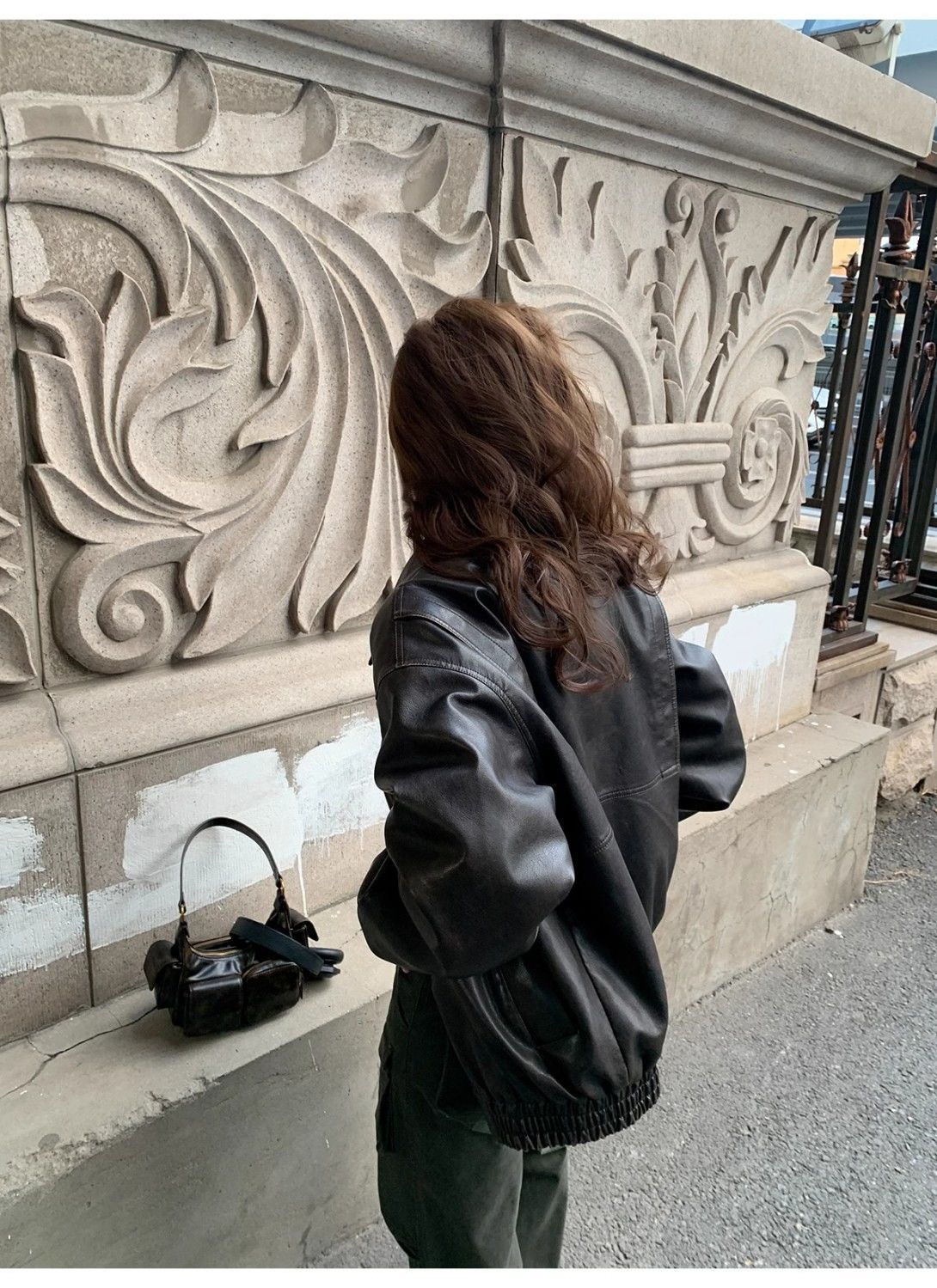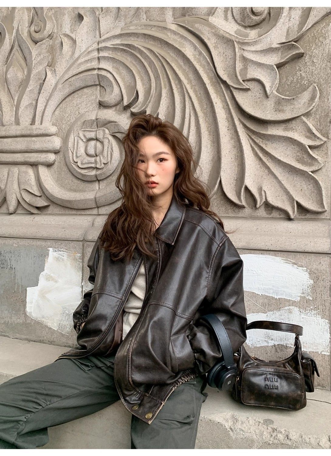 여성을위한 미국 갈색 복고풍 오래된 느슨한 가죽 자켓 봄, 가을 2025 새로운 느슨한 한국 스타일 따뜻한 자켓 유행스토어 가기