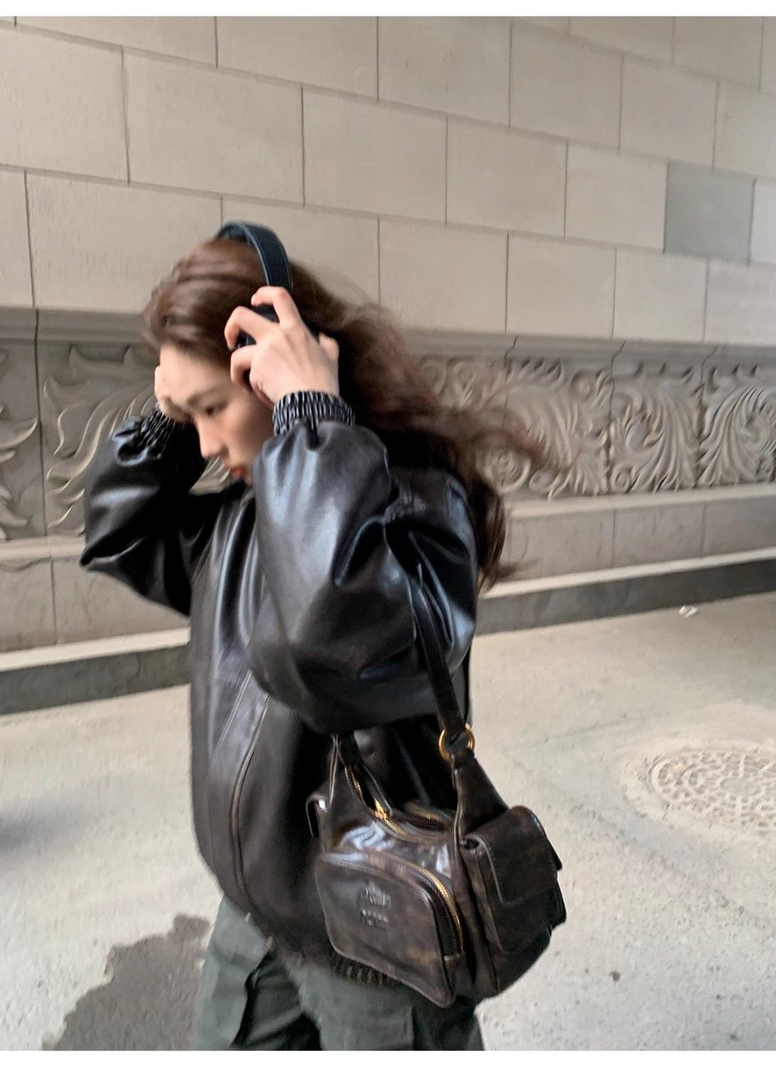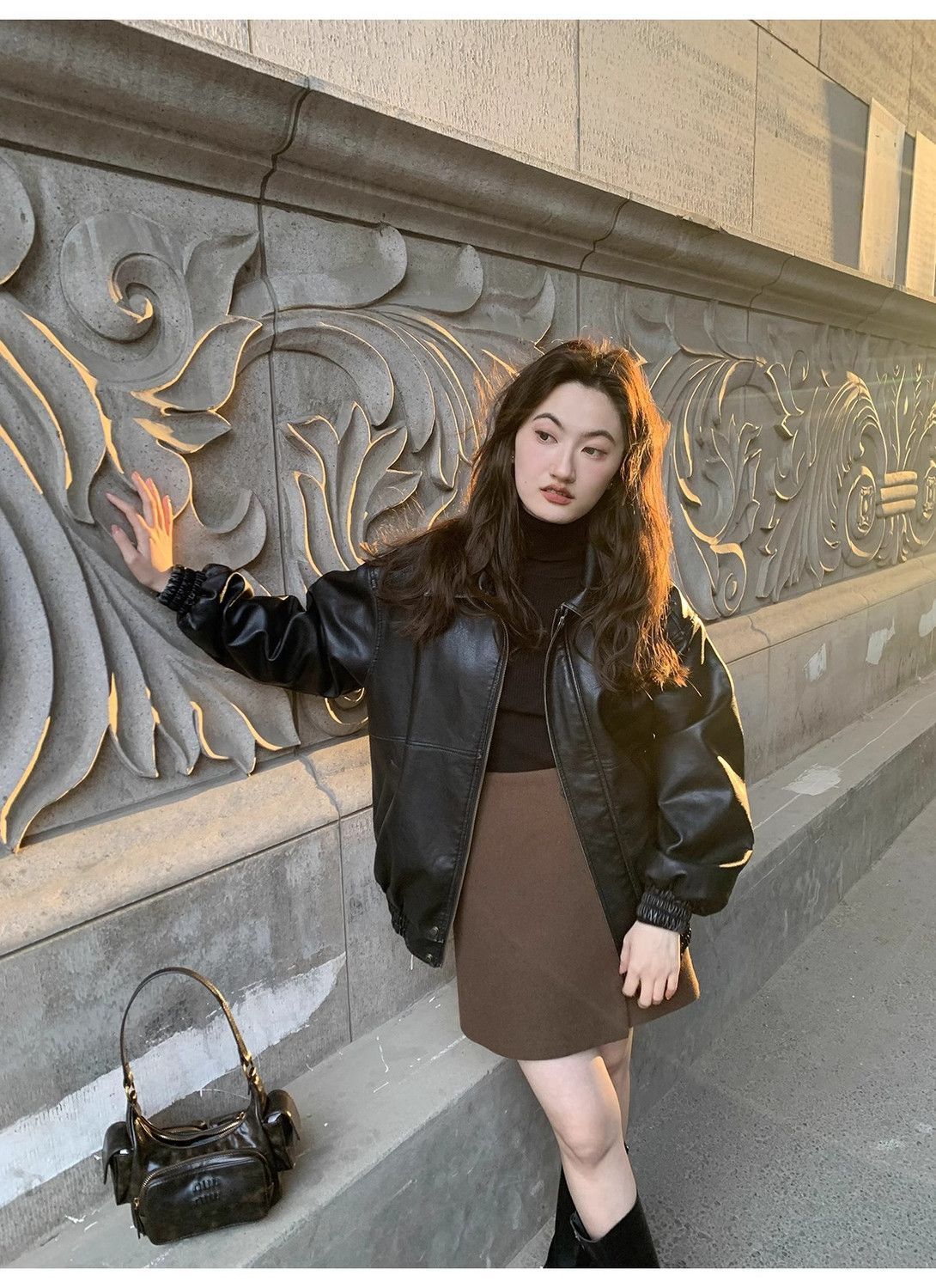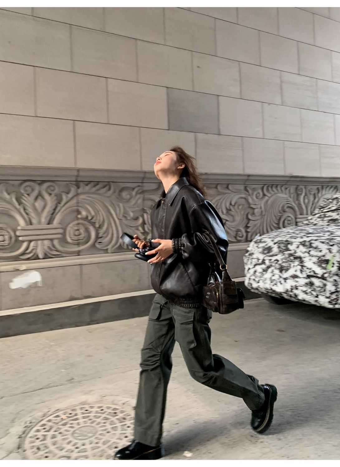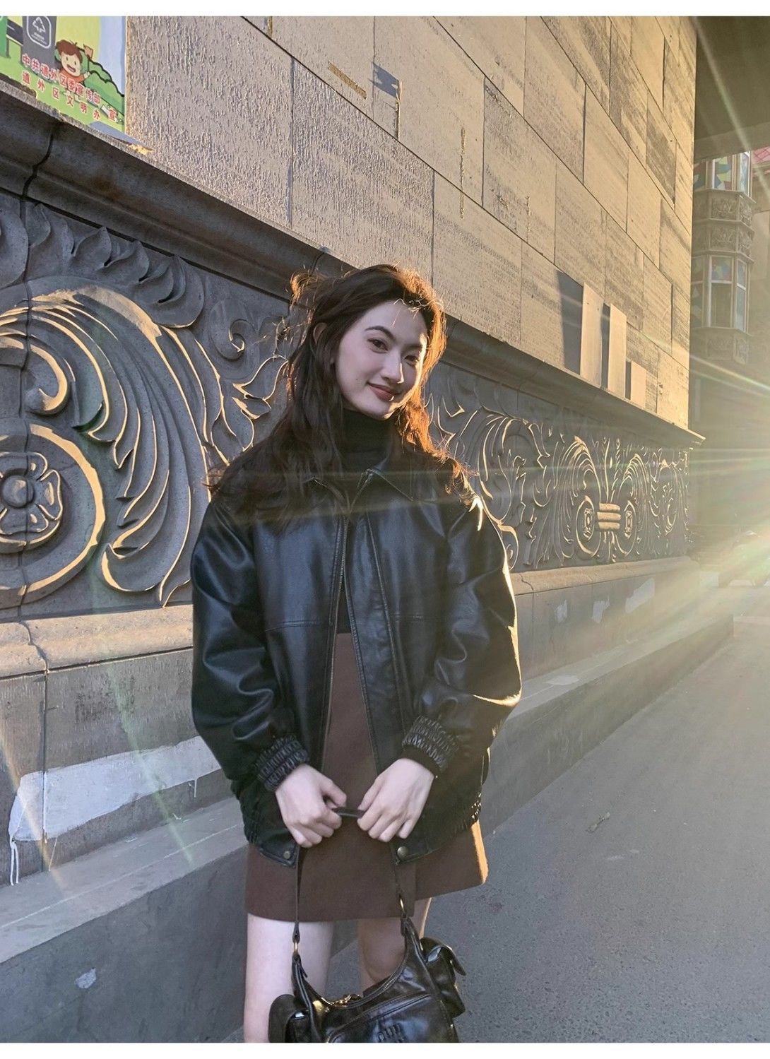 여성을위한 미국 갈색 복고풍 오래된 느슨한 가죽 자켓 봄, 가을 2025 새로운 느슨한 한국 스타일 따뜻한 자켓 유행스토어 가기