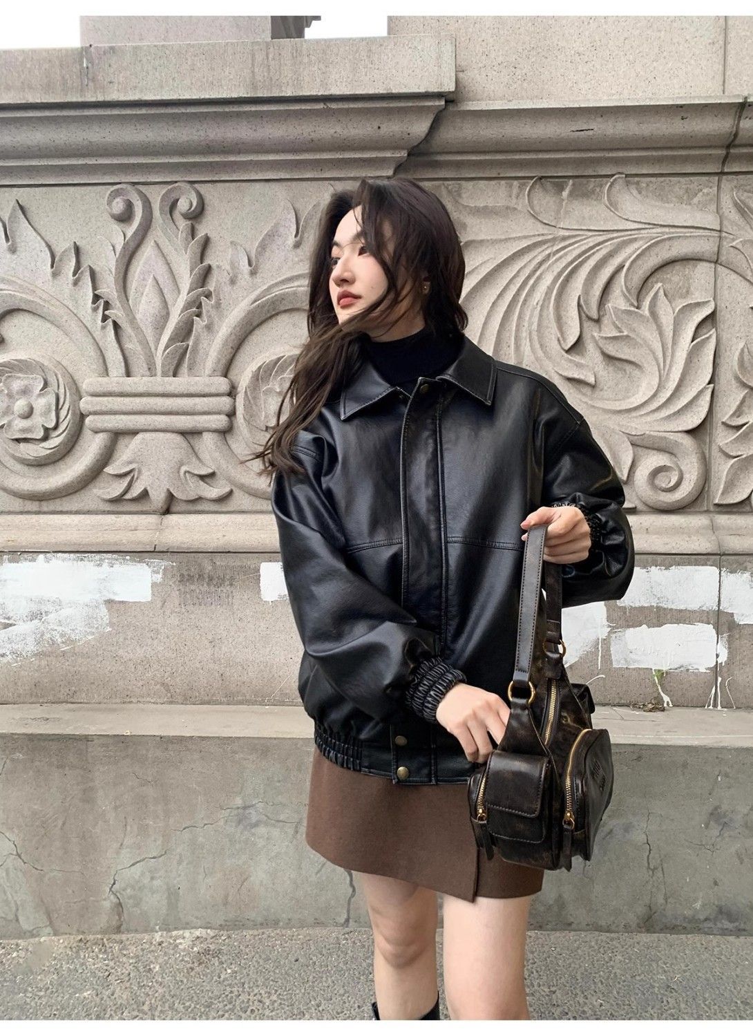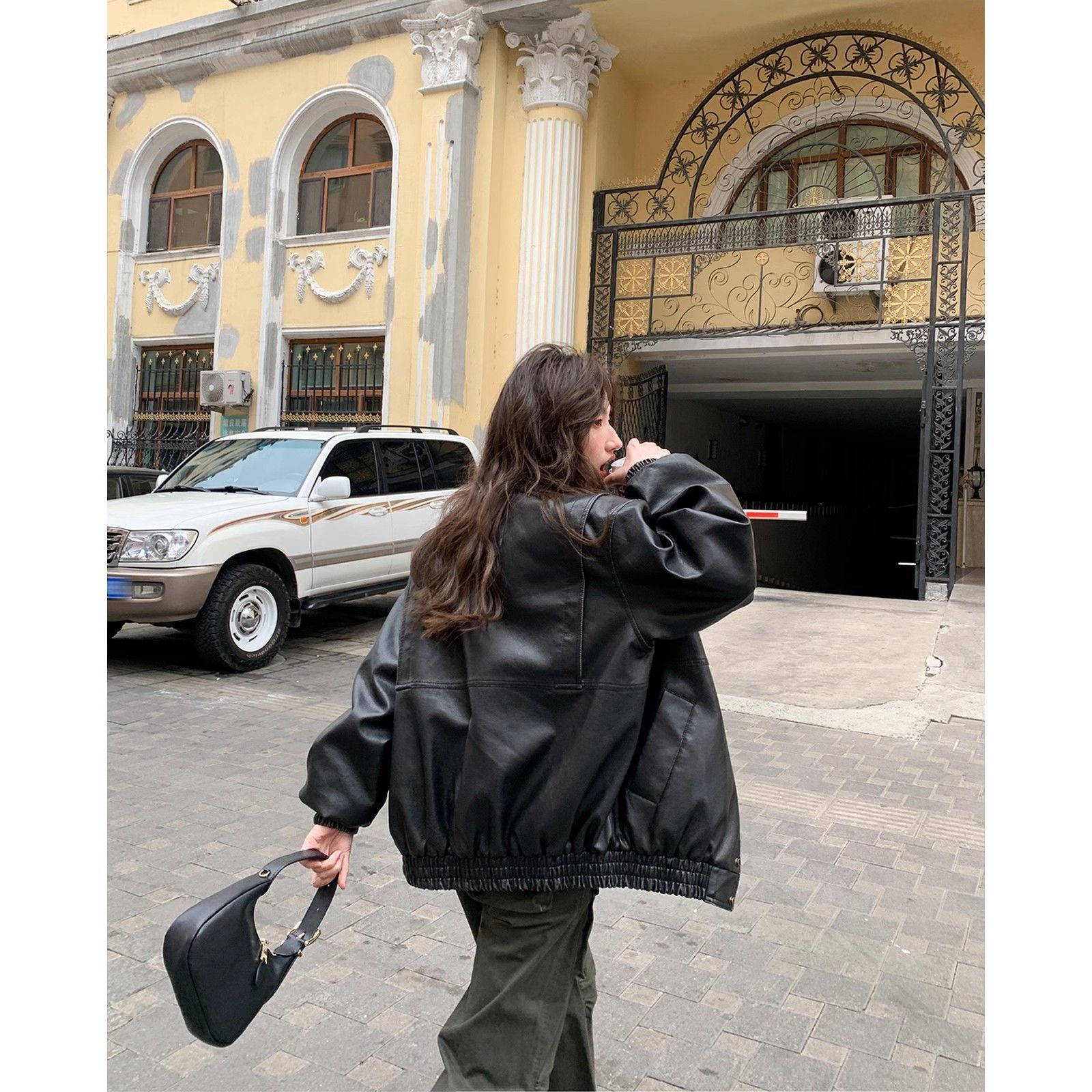 여성을위한 미국 갈색 복고풍 오래된 느슨한 가죽 자켓 봄, 가을 2025 새로운 느슨한 한국 스타일 따뜻한 자켓 유행