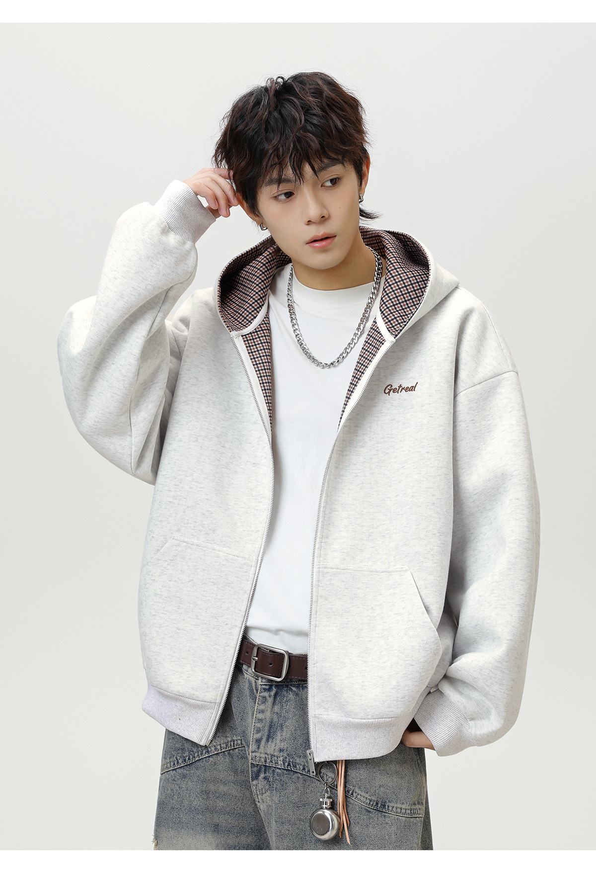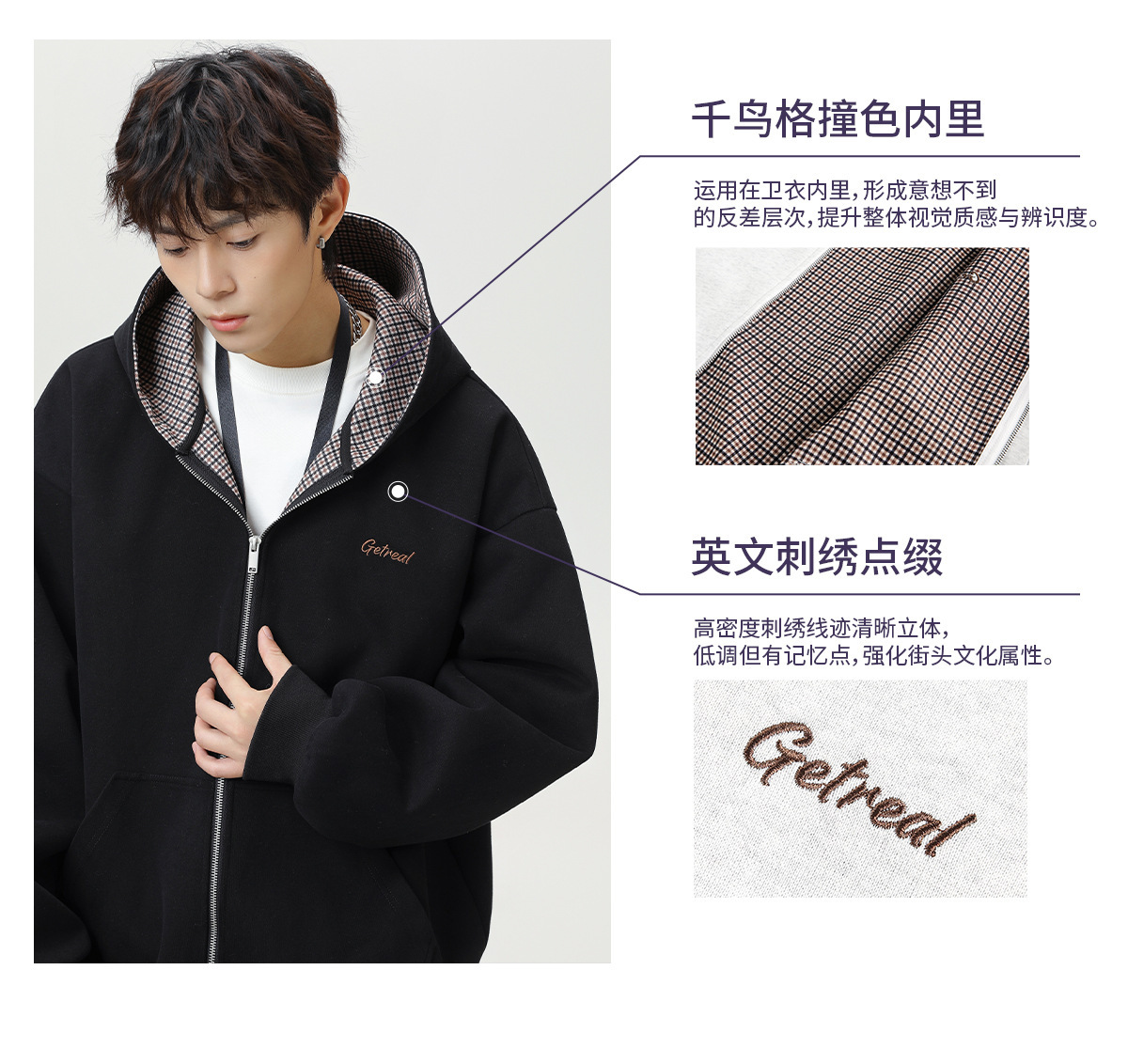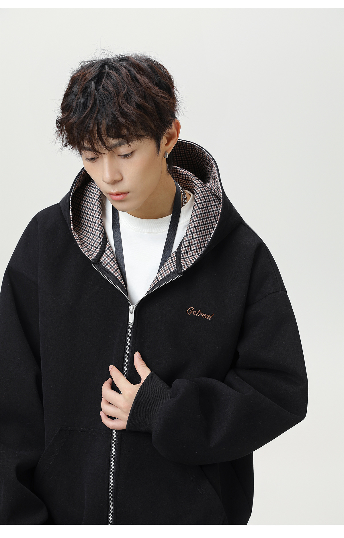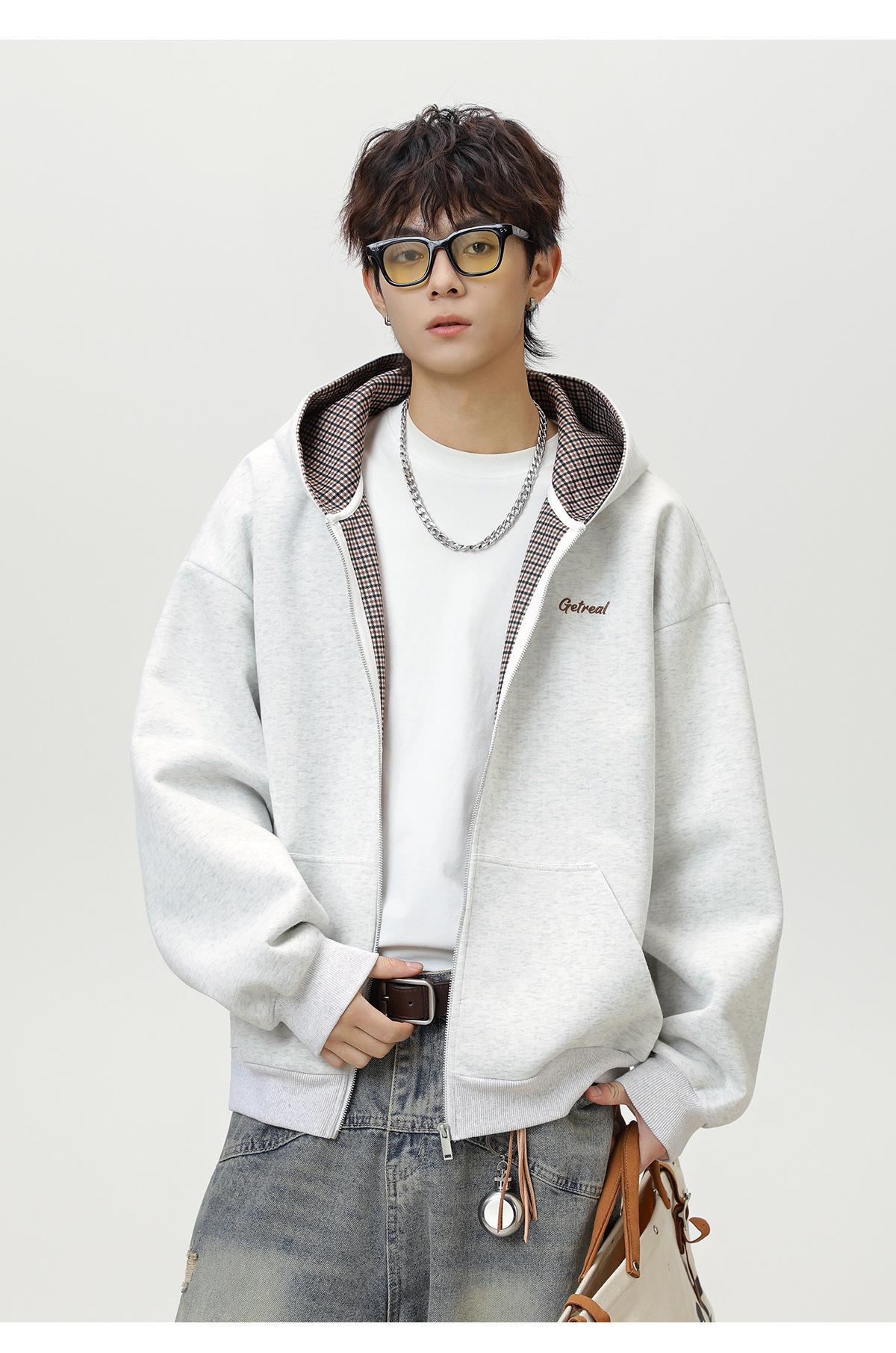 가을 남성용 하운드투스 콘트라스트 컬러 안감 후드 스웨트셔츠 헤비 레트로 쇼트 와이드 트렌디 브랜드 지퍼 카디건 재킷스토어 가기