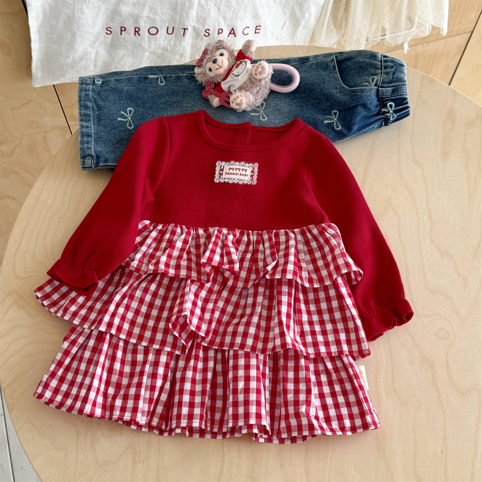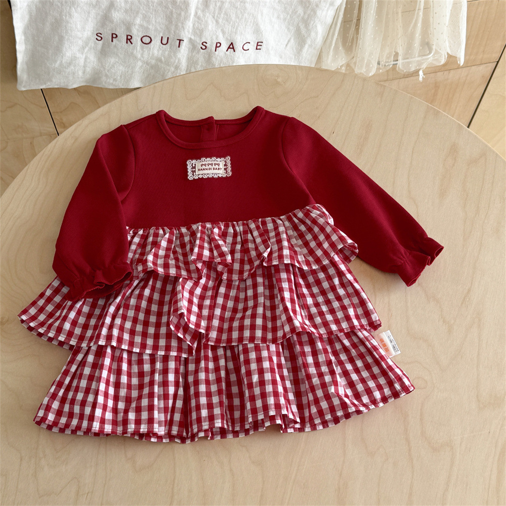 Tongxingyuan 봄과 가을 소녀 한국 스타일 격자 무늬 드레스 가을 새로운 어린이 유행 공주 드레스 아기 케이크 드레스스토어 가기