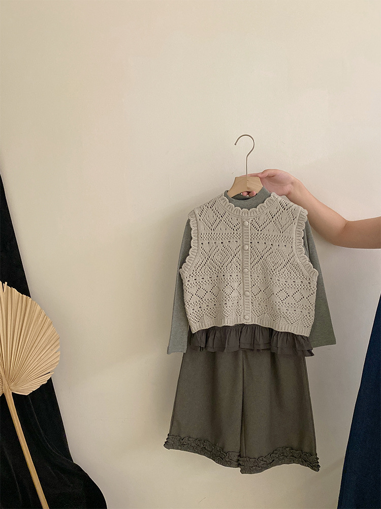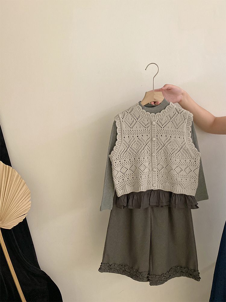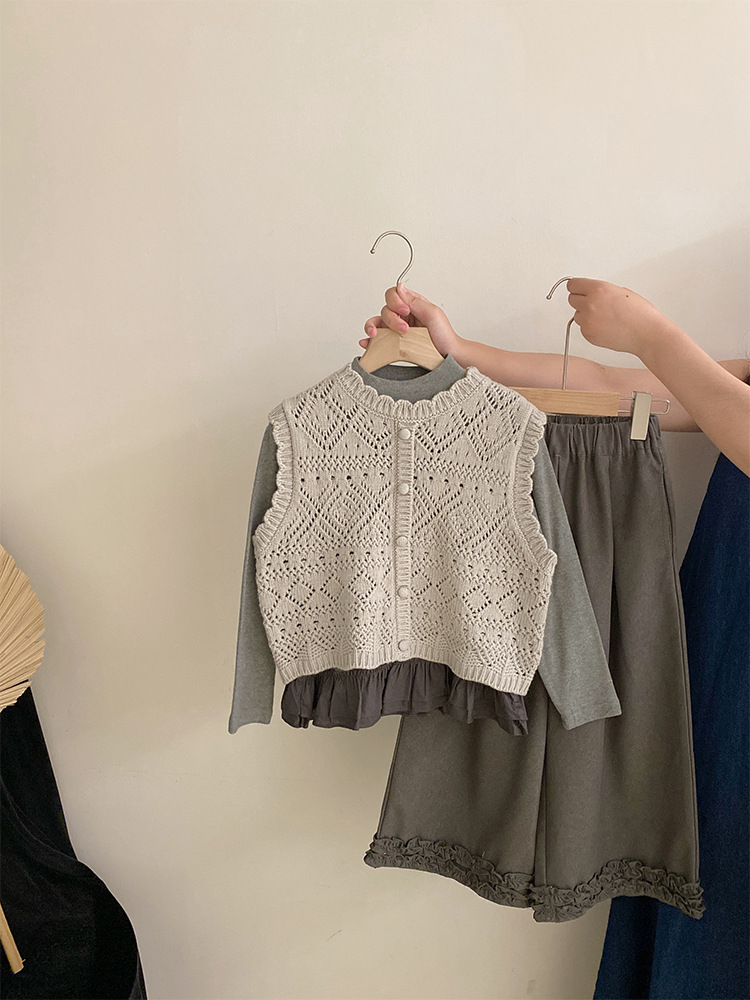 여자 한국 스타일 가을 신작 니트 조끼 솔리드 컬러 바닥 셔츠 2025 레이스 와이드 레그 캐주얼 바지 투피스 트렌디 세트