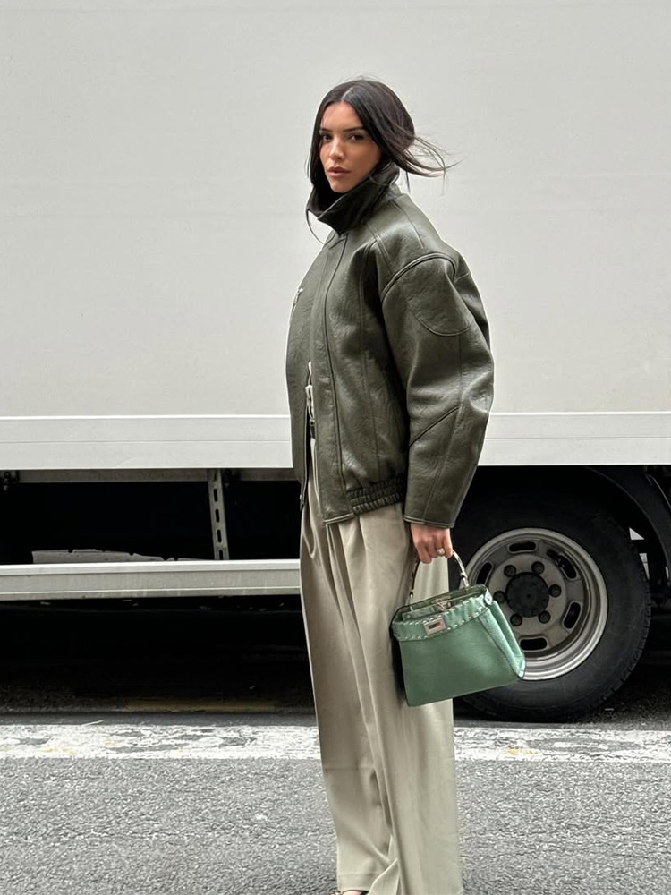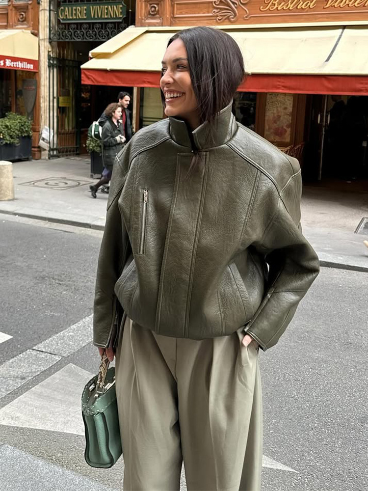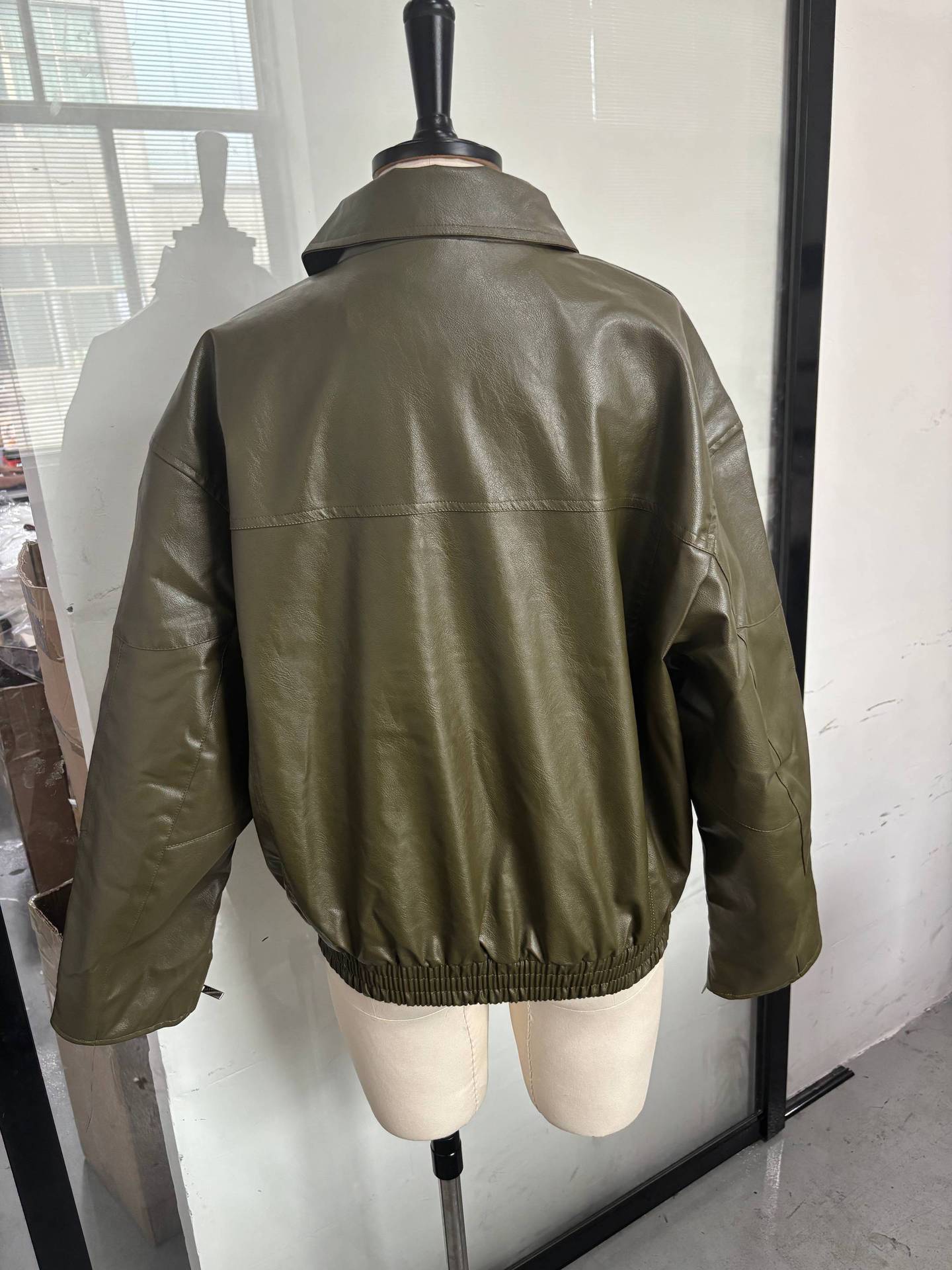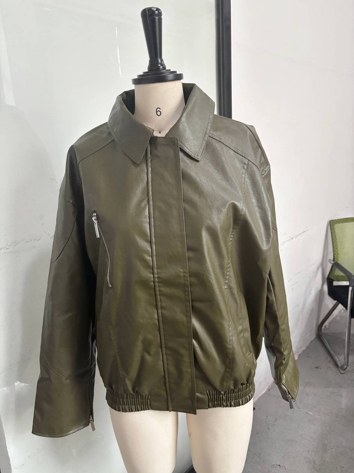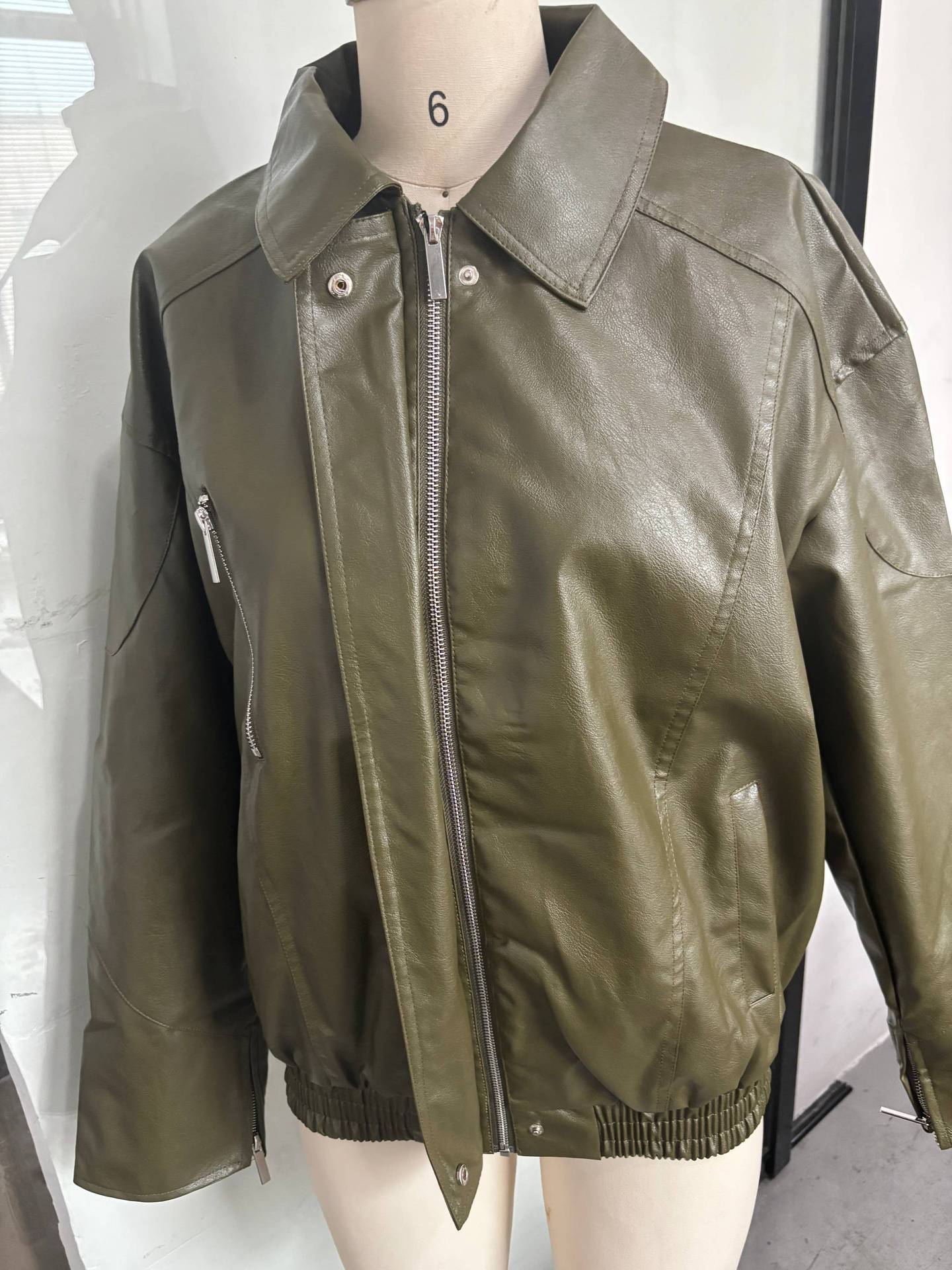 실제 사진-개성 있는 스트리트 스타일 패션 단색 라펠 지퍼 가죽 재킷 여성용 2025년 유럽 및 미국 신상품스토어 가기