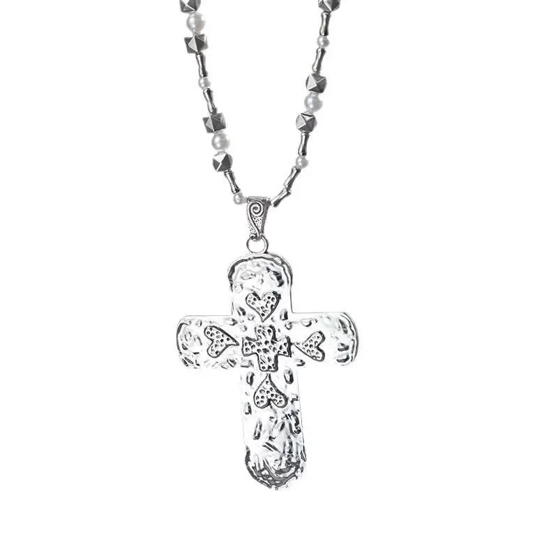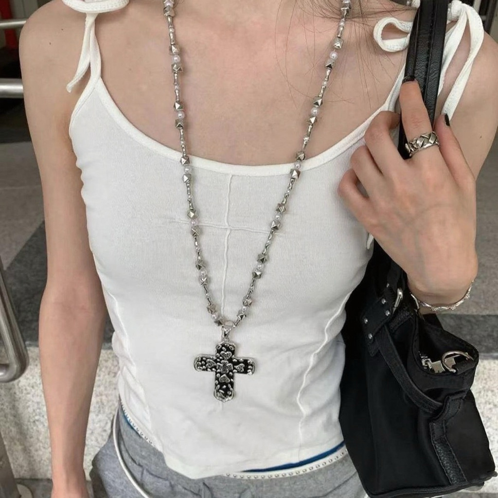 고딕 크로스 롱 목걸이 중공업 Y2K 하위 문화 소녀 모조 진주 라이트 럭셔리 핫 소녀 스웨트 체인 액세서리