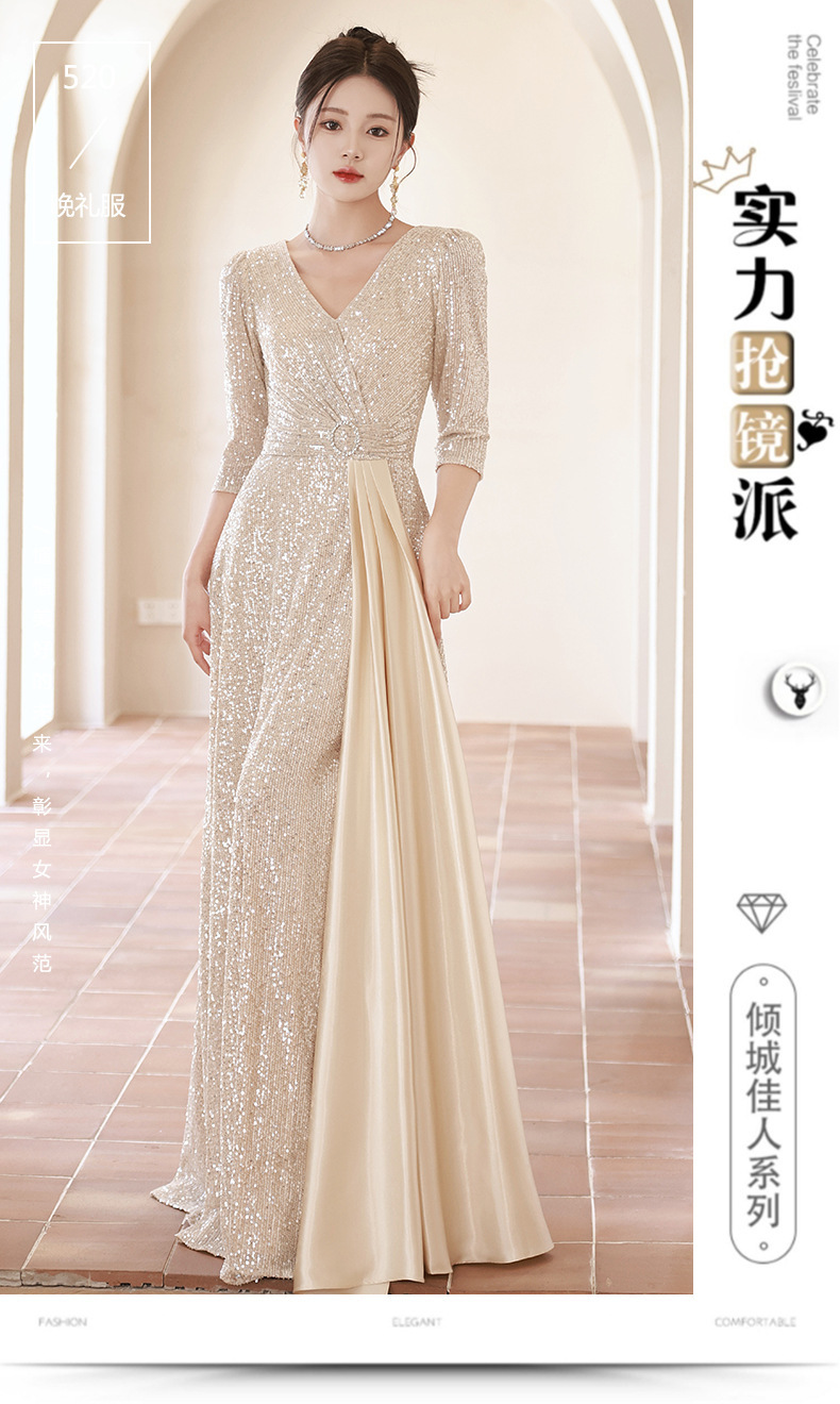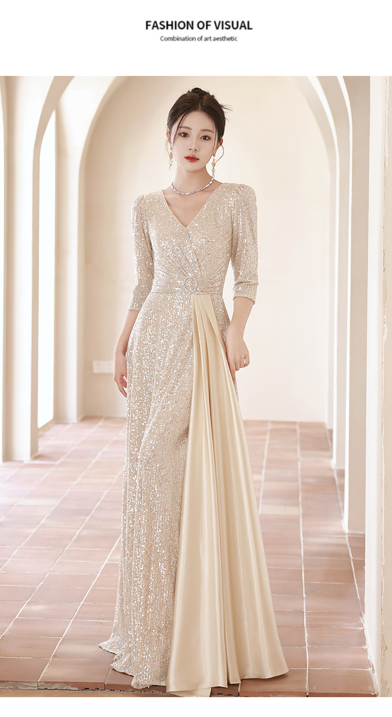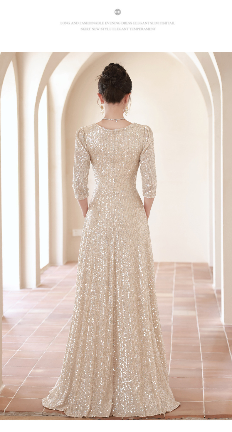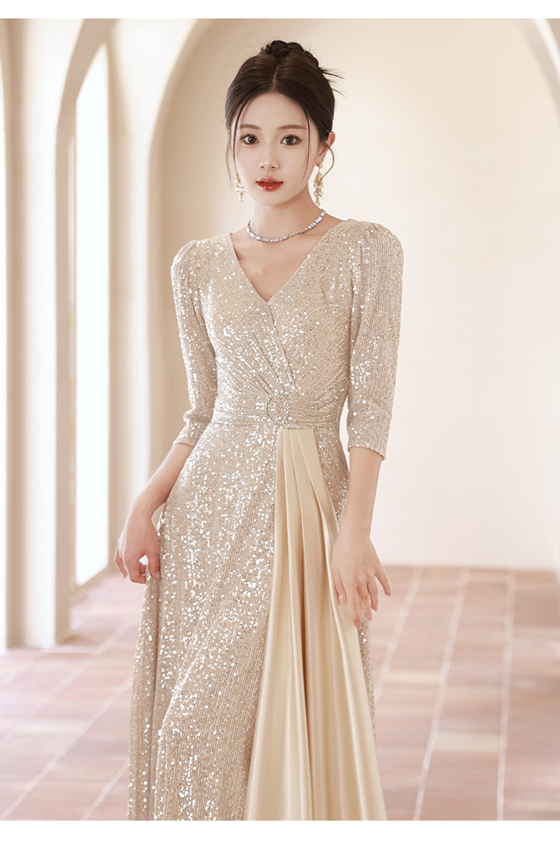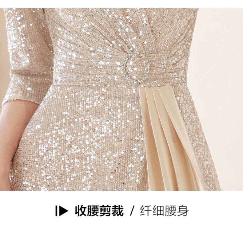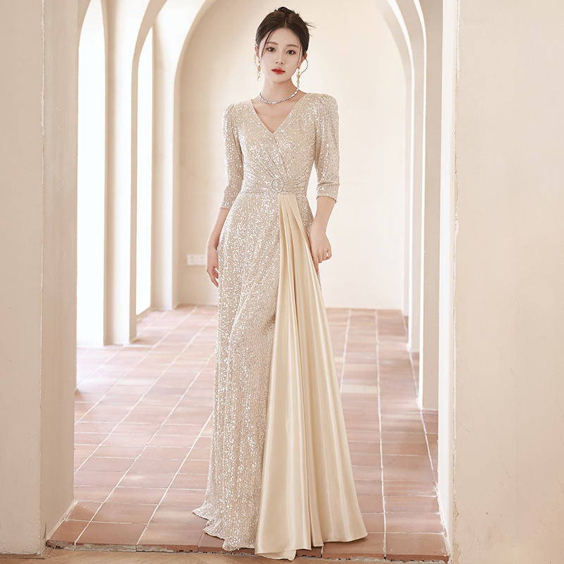 여성을위한 샴페인 컬러 이브닝 드레스 2024 새로운 스타일 하이 엔드 기질 라이트 럭셔리 틈새 하이 엔드 호스트 스팽글 퍼포먼스 드레스