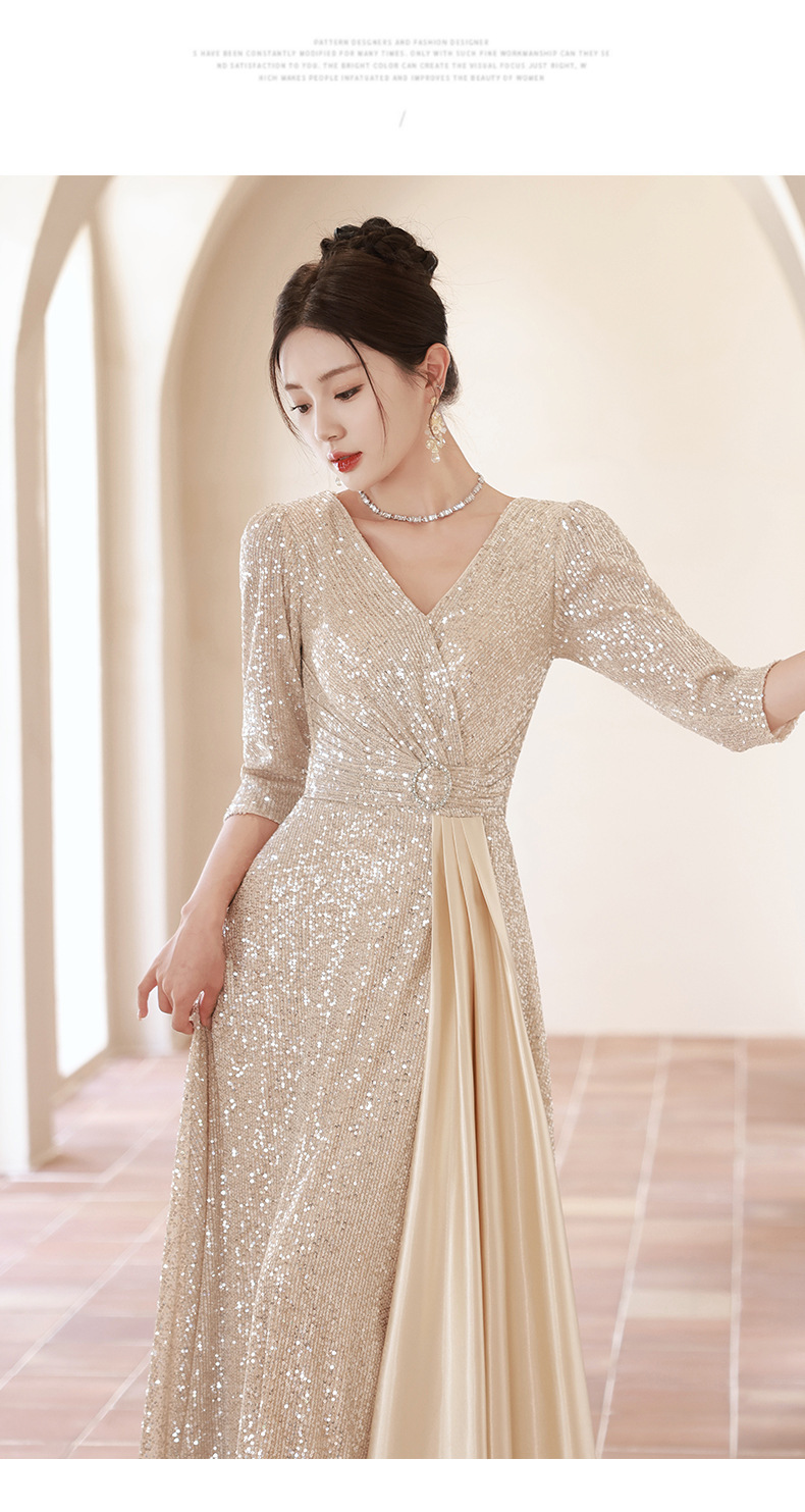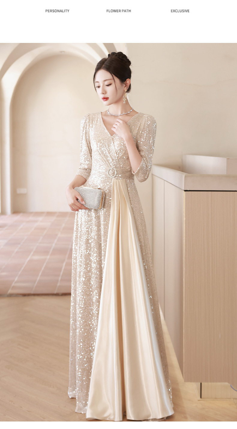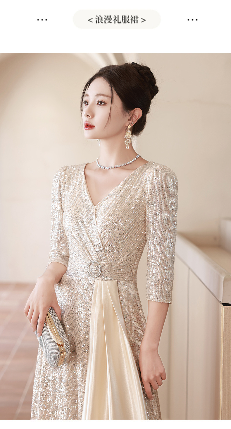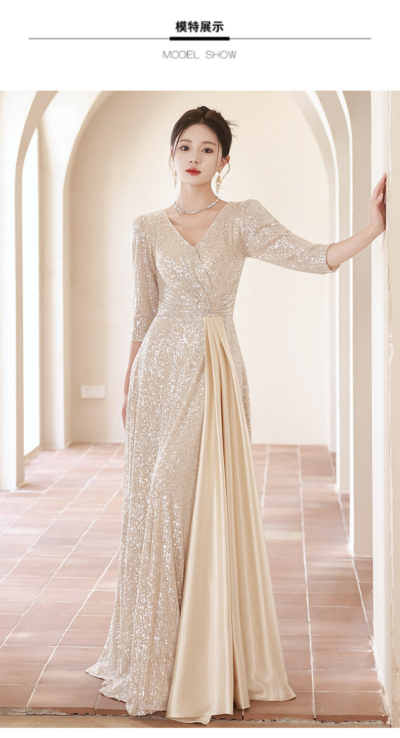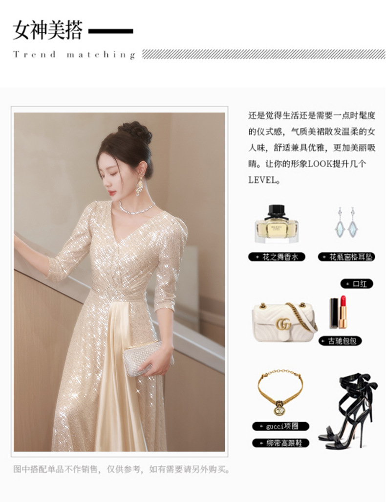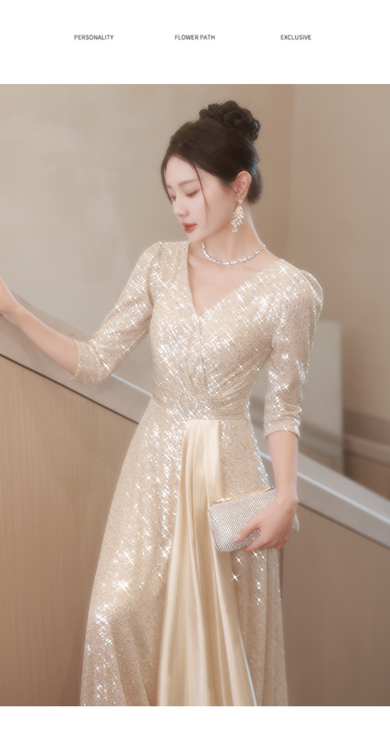 여성을위한 샴페인 컬러 이브닝 드레스 2024 새로운 스타일 하이 엔드 기질 라이트 럭셔리 틈새 하이 엔드 호스트 스팽글 퍼포먼스 드레스