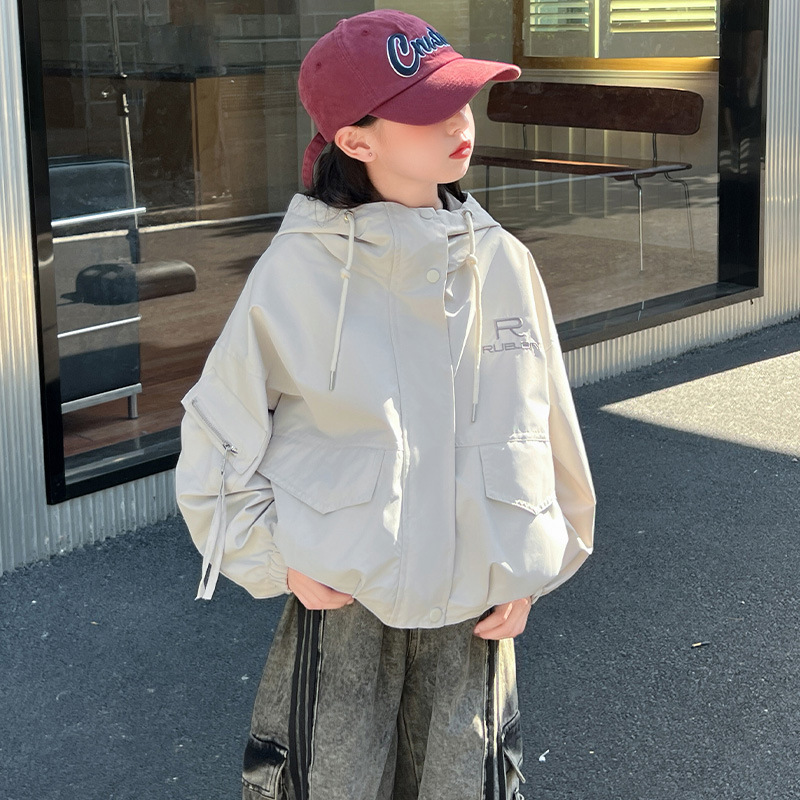 여아 봄, 가을 코트 2025 가을 새로운 스타일 여아 패션 포켓 작업복 후드 캐주얼 탑