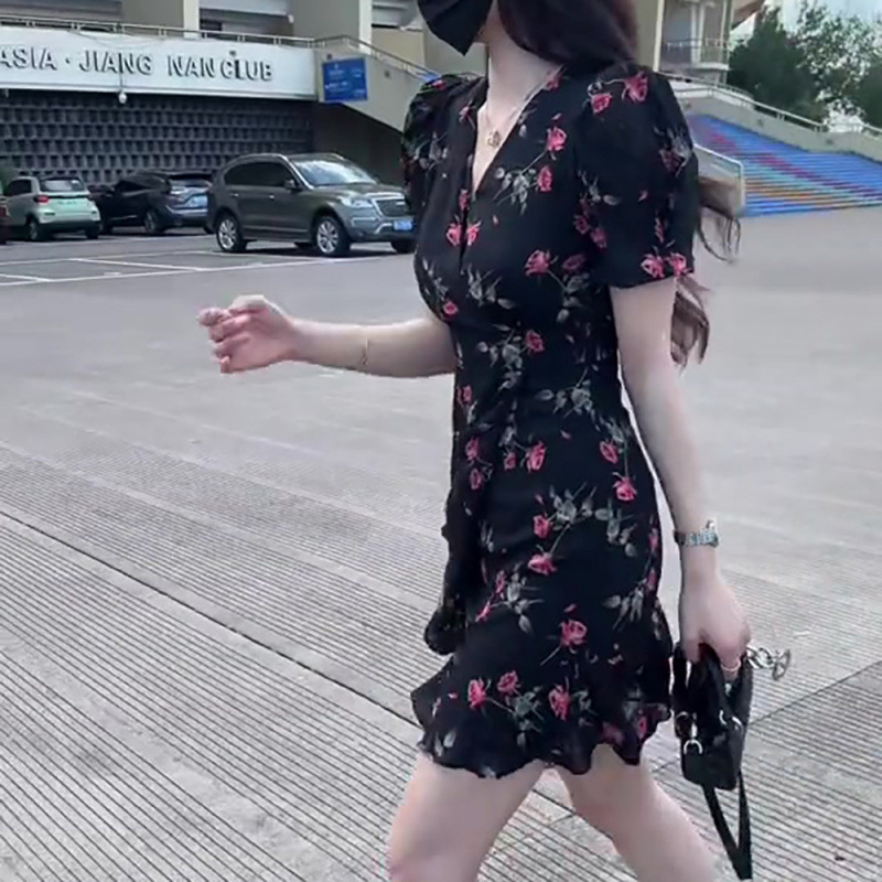 2025年夏季韩版洋气v领荷叶边短袖裙子收腰显瘦印花短裙连衣裙女