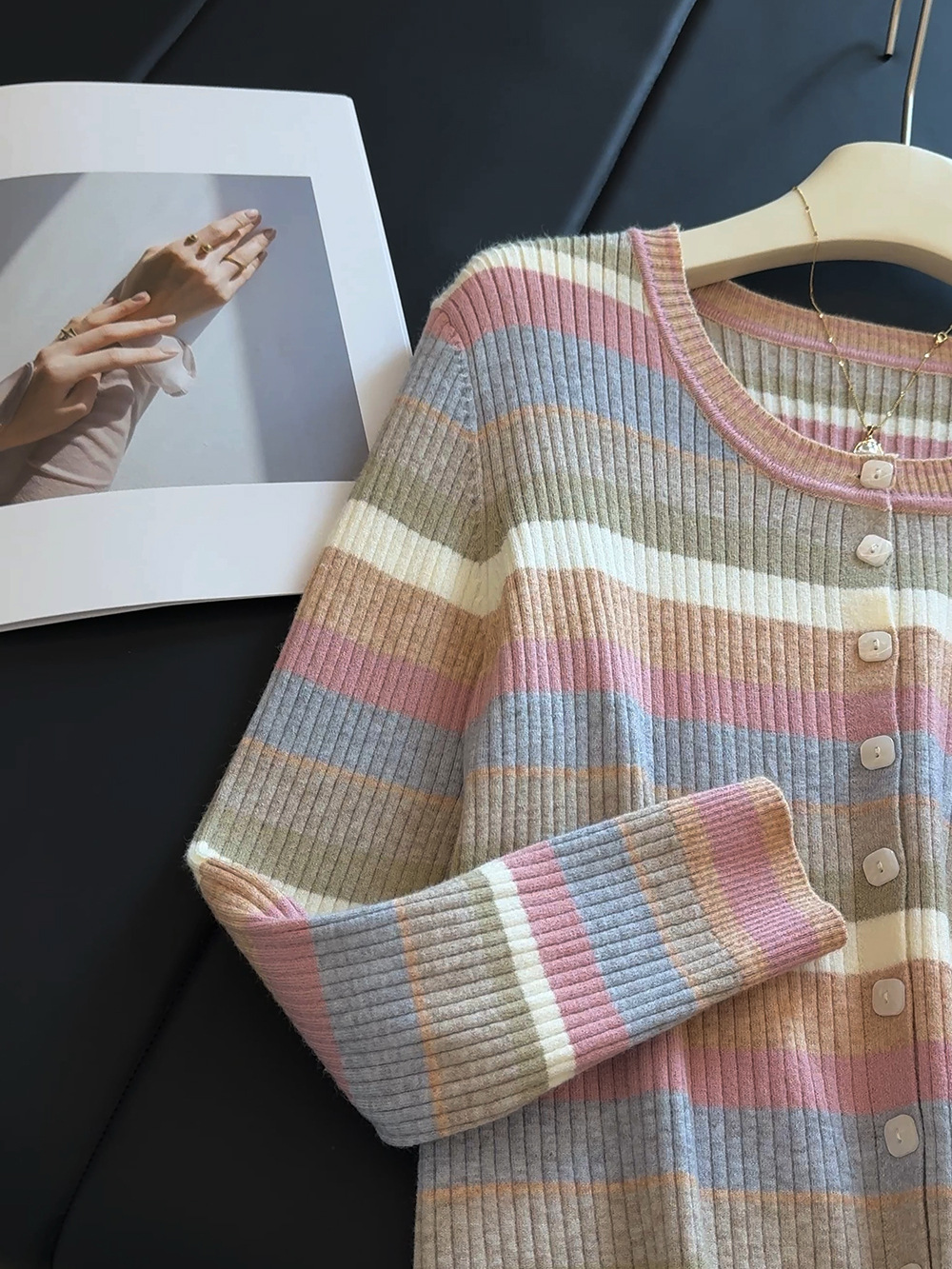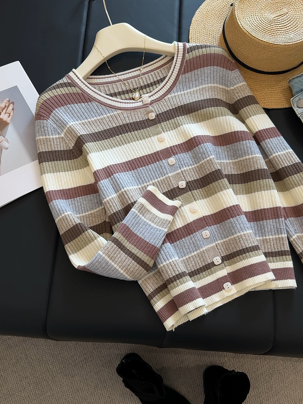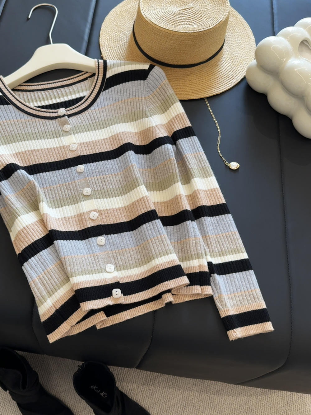 여성을위한 세련된 연령 감소 긴팔 스트라이프 스웨터 2025 여성을위한 새로운 봄, 가을 탑 얇은 슬림 피트 바닥 스웨터스토어 가기