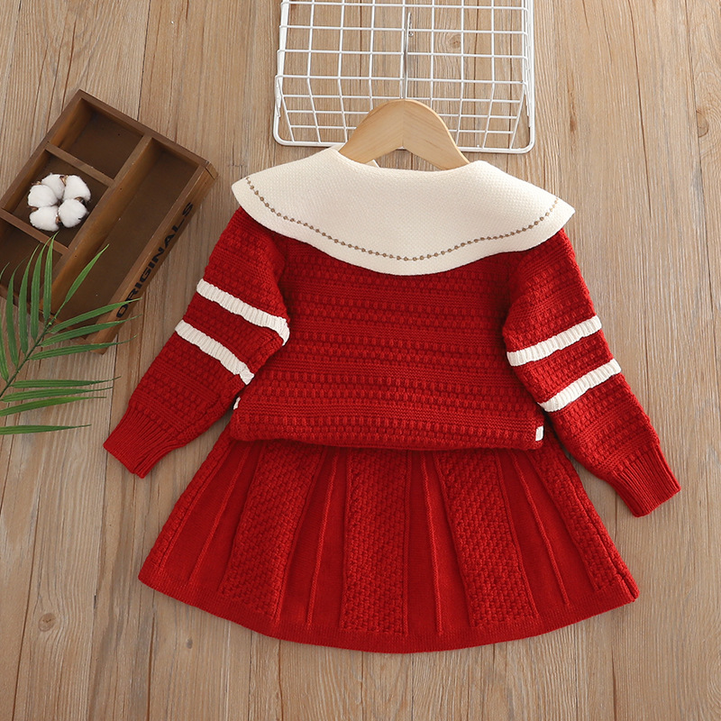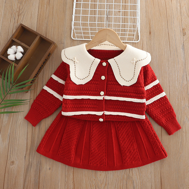 국경 간 대외 무역 2025 새로운 가을, 겨울 소녀 니트 스웨터 정장 아동 카디건 투피스 탑 + 스커트
