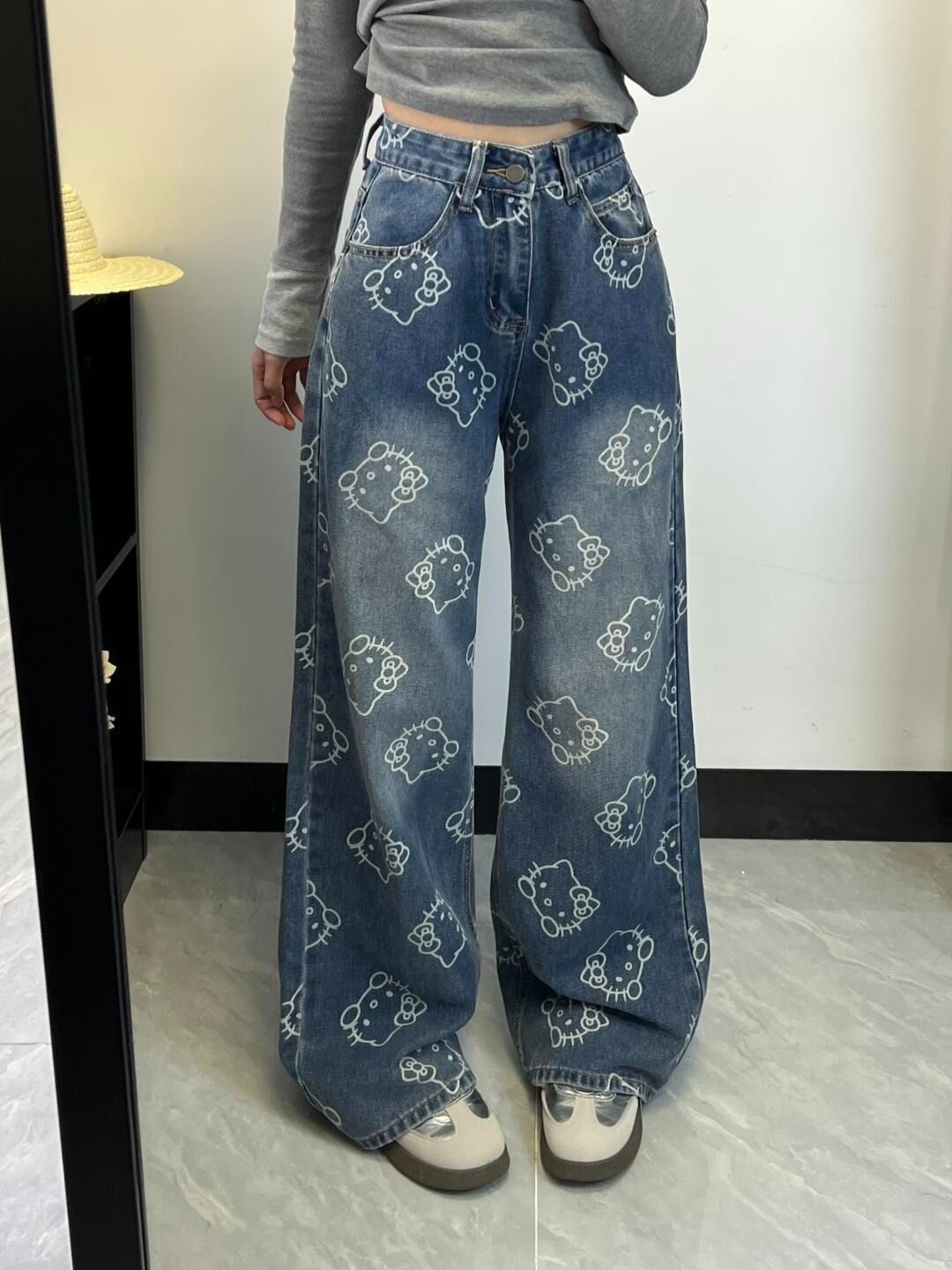 hellokitty 청바지 여성 봄 2025 새로운 디자인 프린트 워시 루즈 슬리밍 바닥 길이 바지