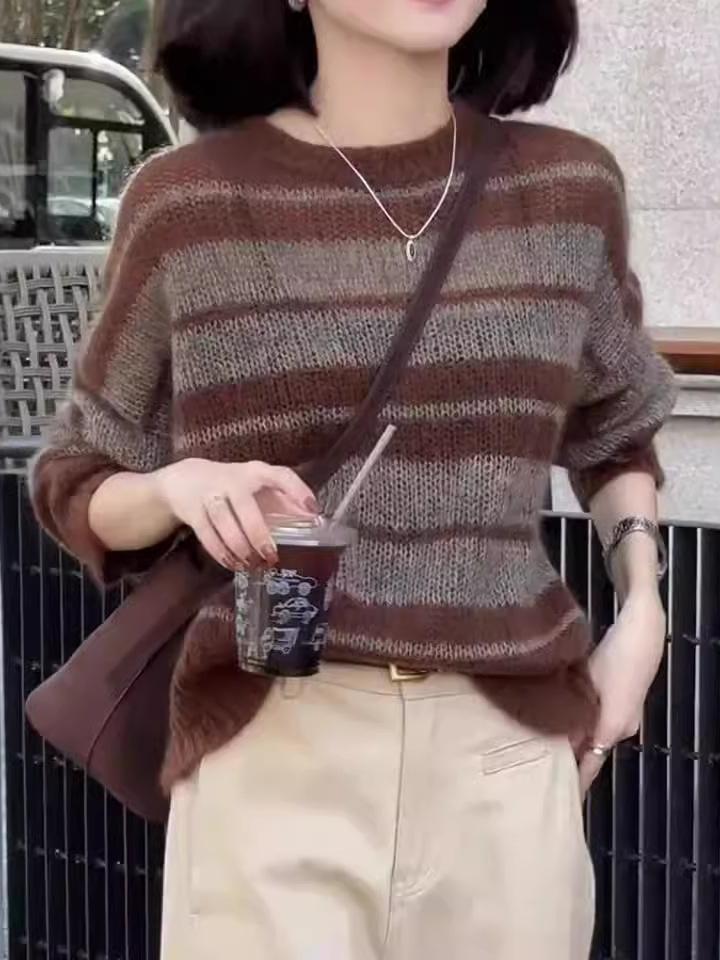 봄과 가을 새로운 바닥 셔츠 크로스 바운드 대비 색 줄무늬 스웨터 여성 캐주얼 스타일 부드럽고 밀랍 느슨한 슬리밍 니트 탑
