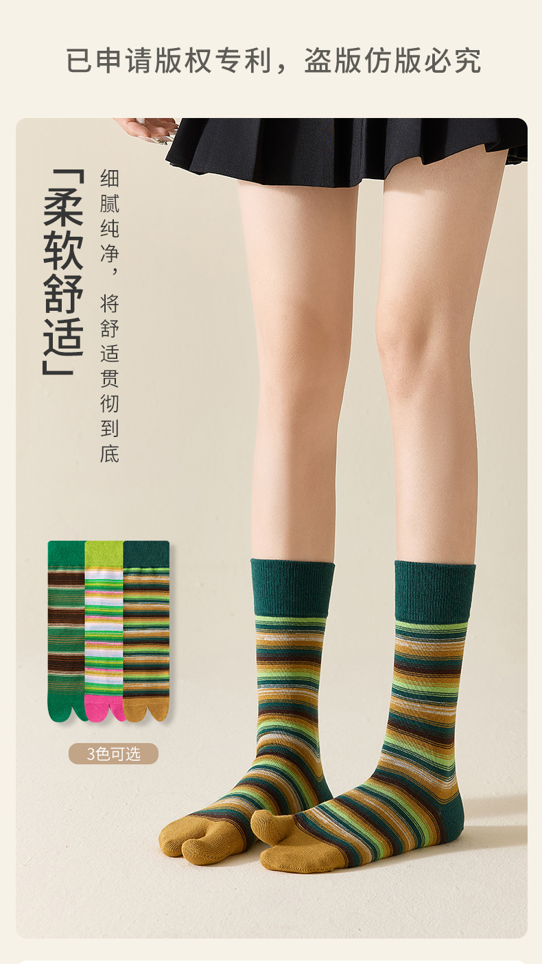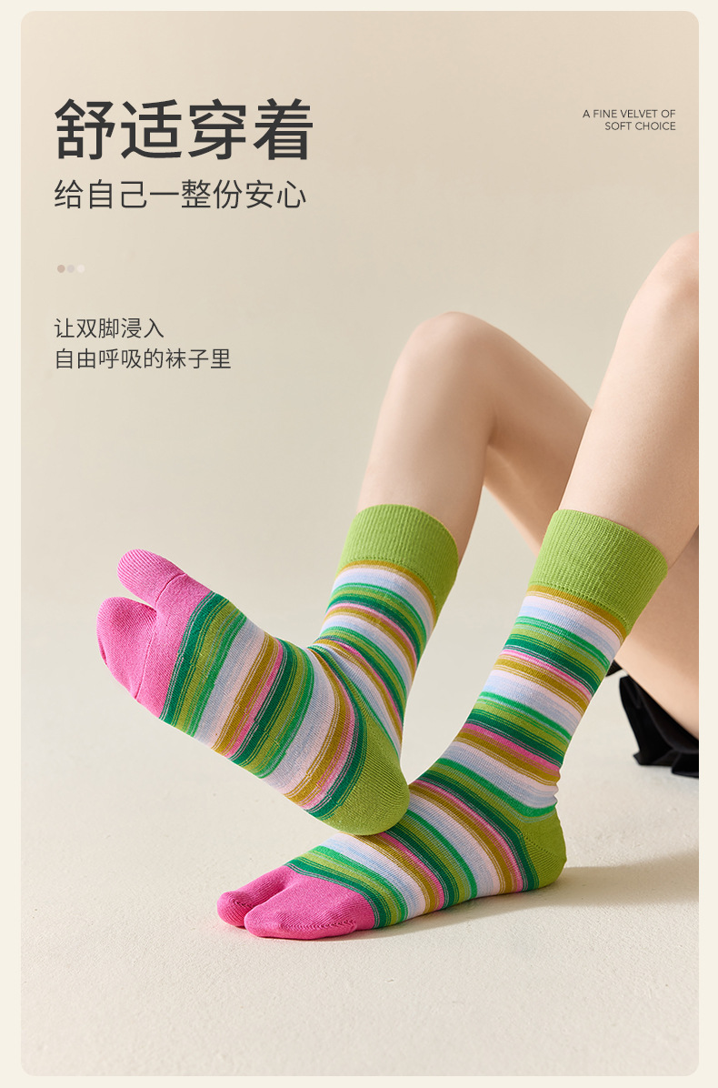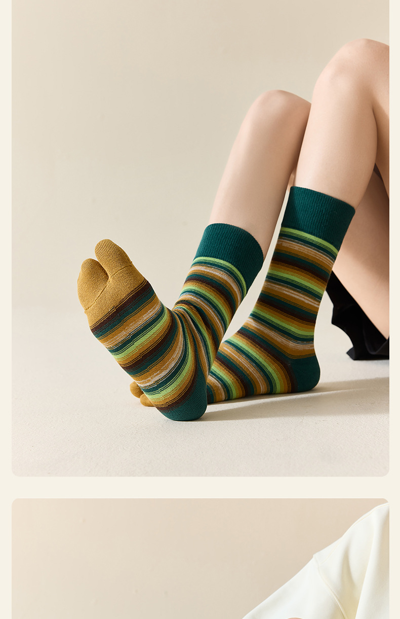 여성용 대비색 스트라이프 스플릿 발가락 양말, 일본식 귀여운 종아리 양말, 여성용 두 손가락 양말, 여성용 레인보우 그린 포레스트 양말스토어 가기