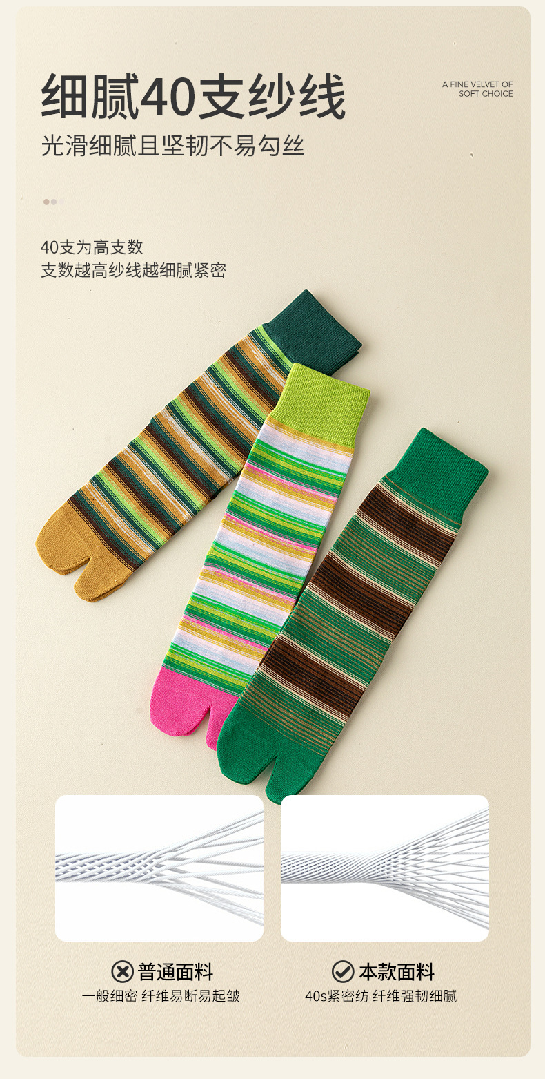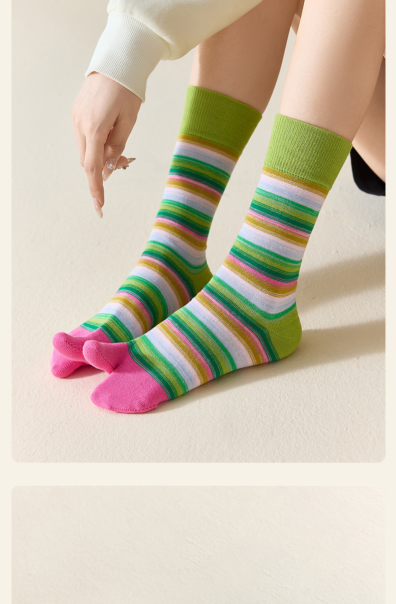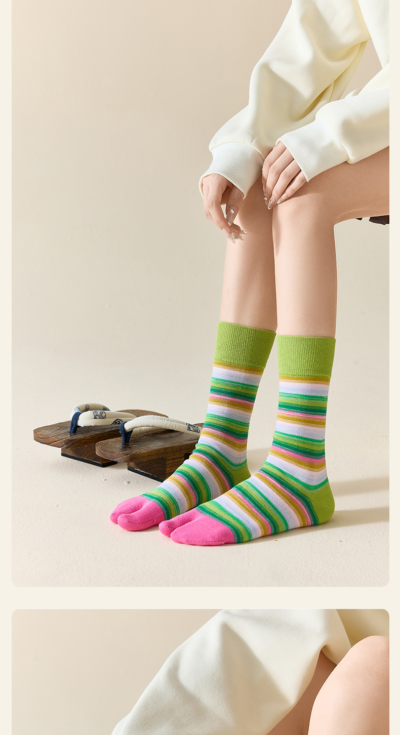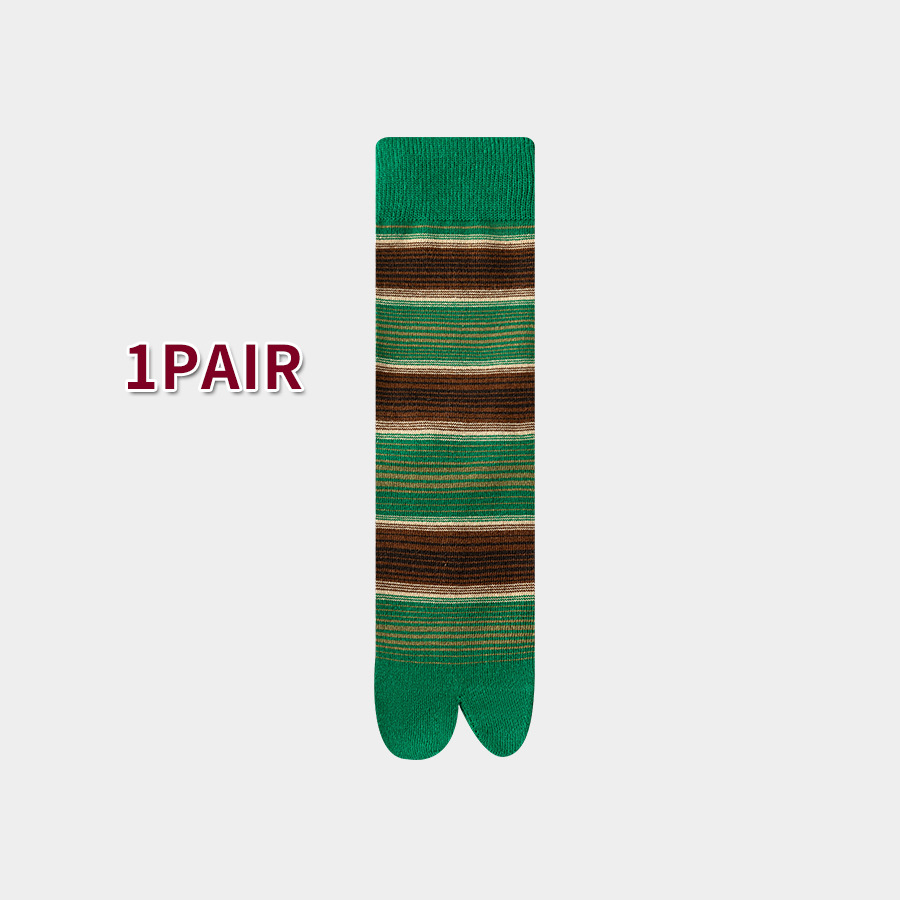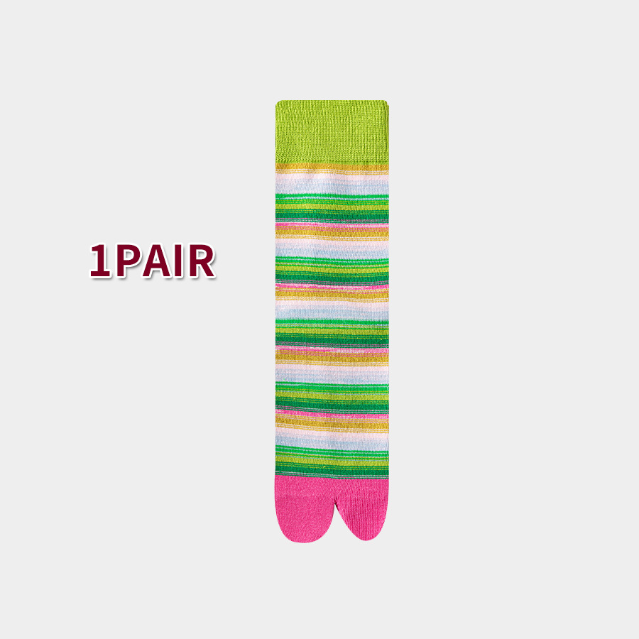 여성용 대비색 스트라이프 스플릿 발가락 양말, 일본식 귀여운 종아리 양말, 여성용 두 손가락 양말, 여성용 레인보우 그린 포레스트 양말