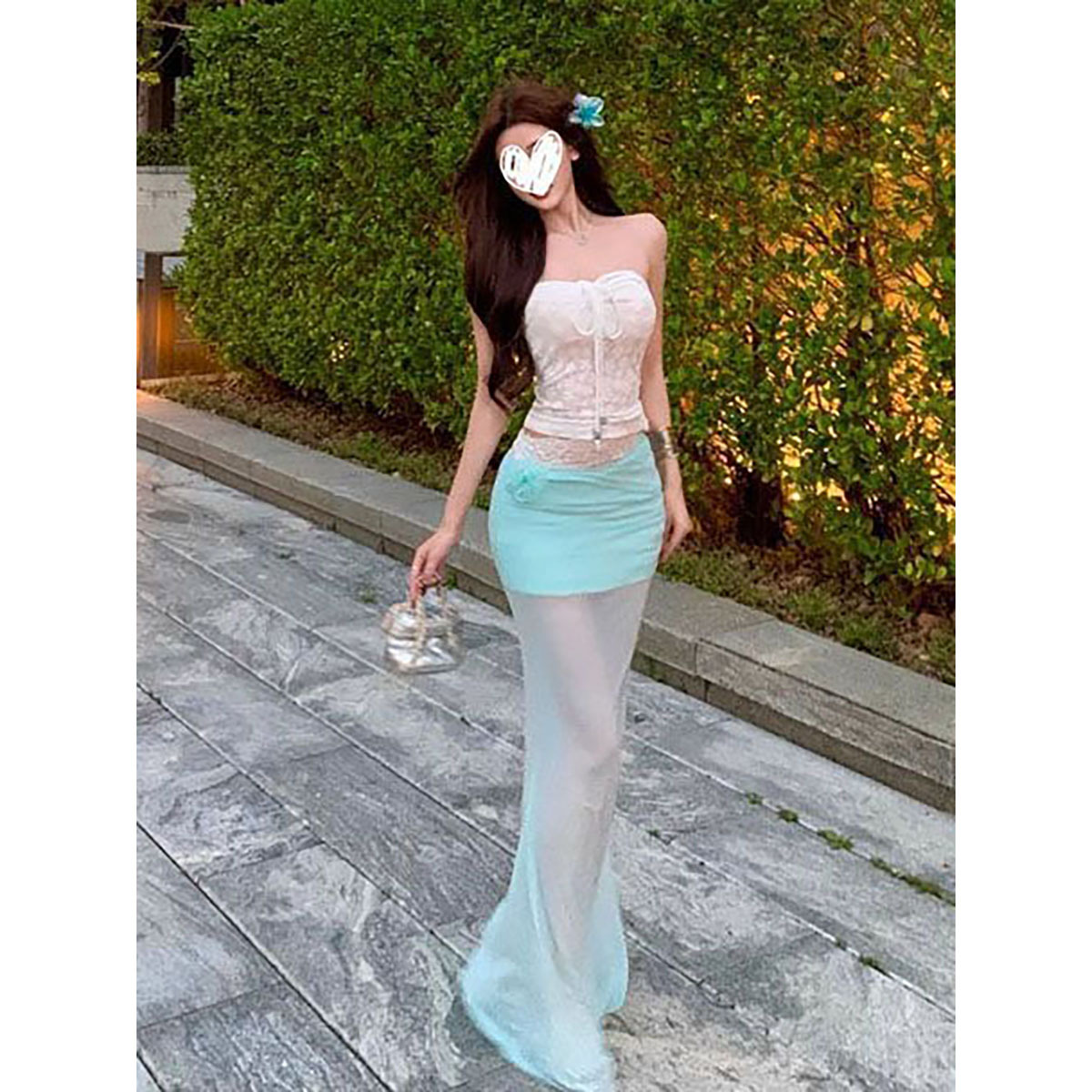 프렌치 퓨어 러브 리조트 스타일 도파민 화이트 튜브 탑 여성 여름 신작 메쉬 스커트 슈트
