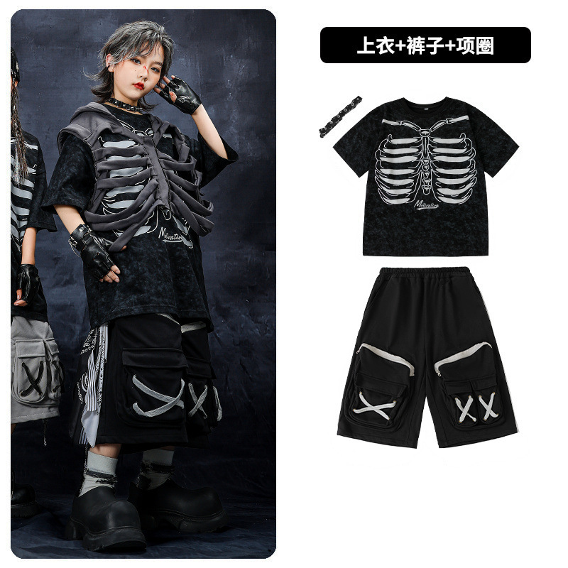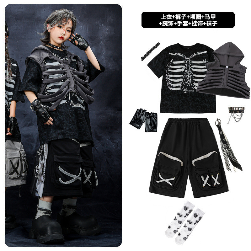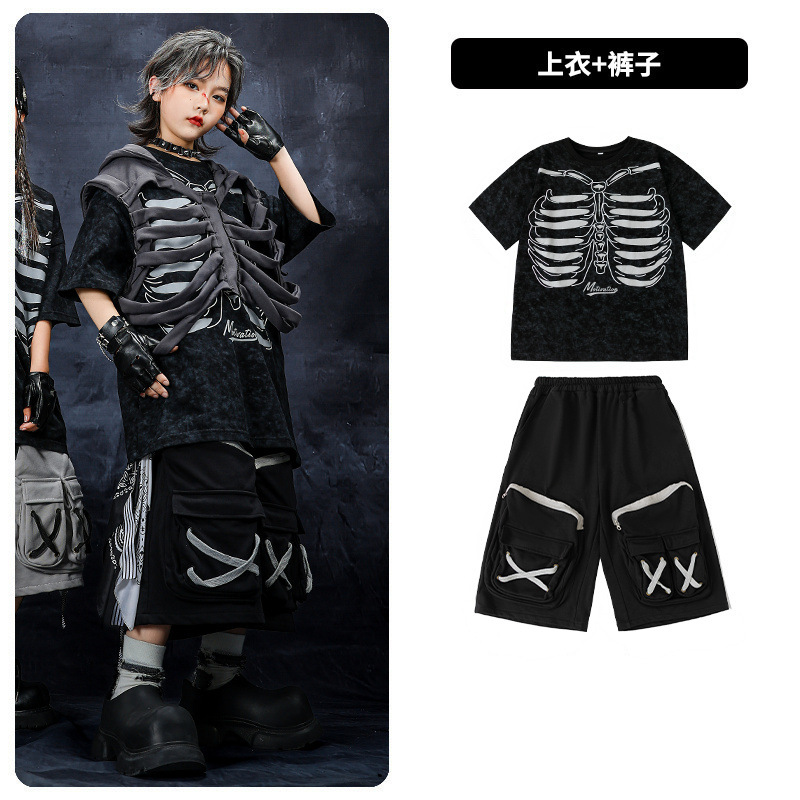스트리트 댄스 아동 트렌디 의류 힙합 소년 검은 갈비뼈 반팔 퍼포먼스 슈트 힙합 소녀 패션쇼 트렌디 의류