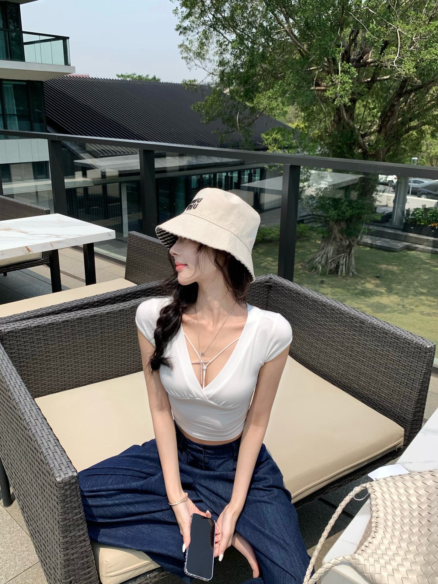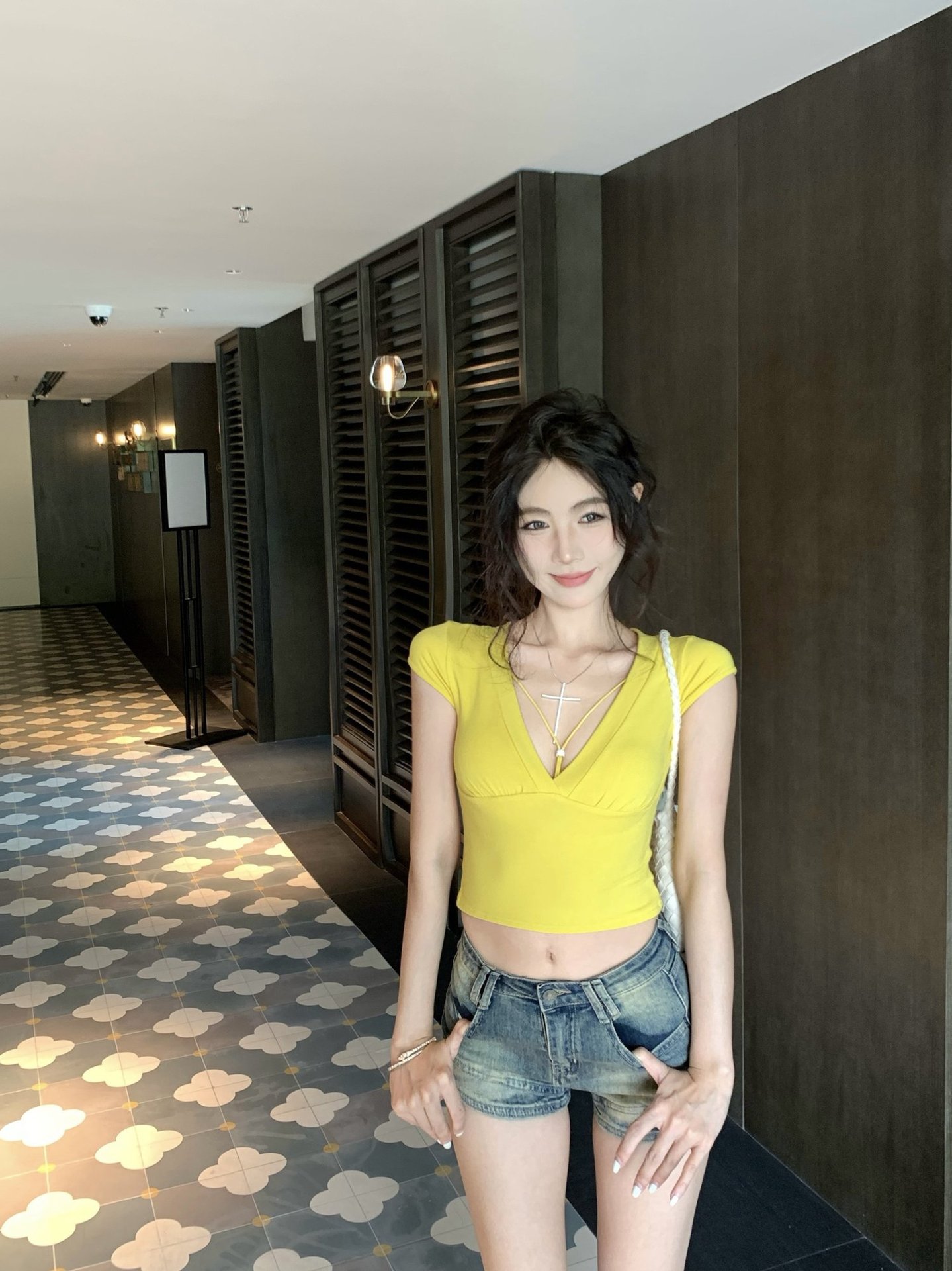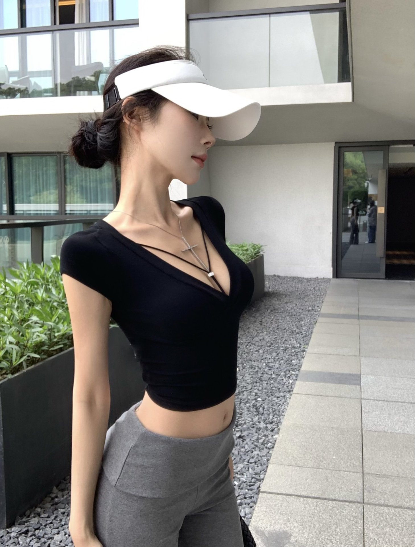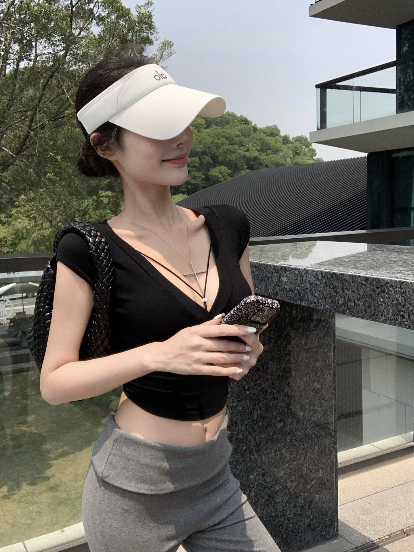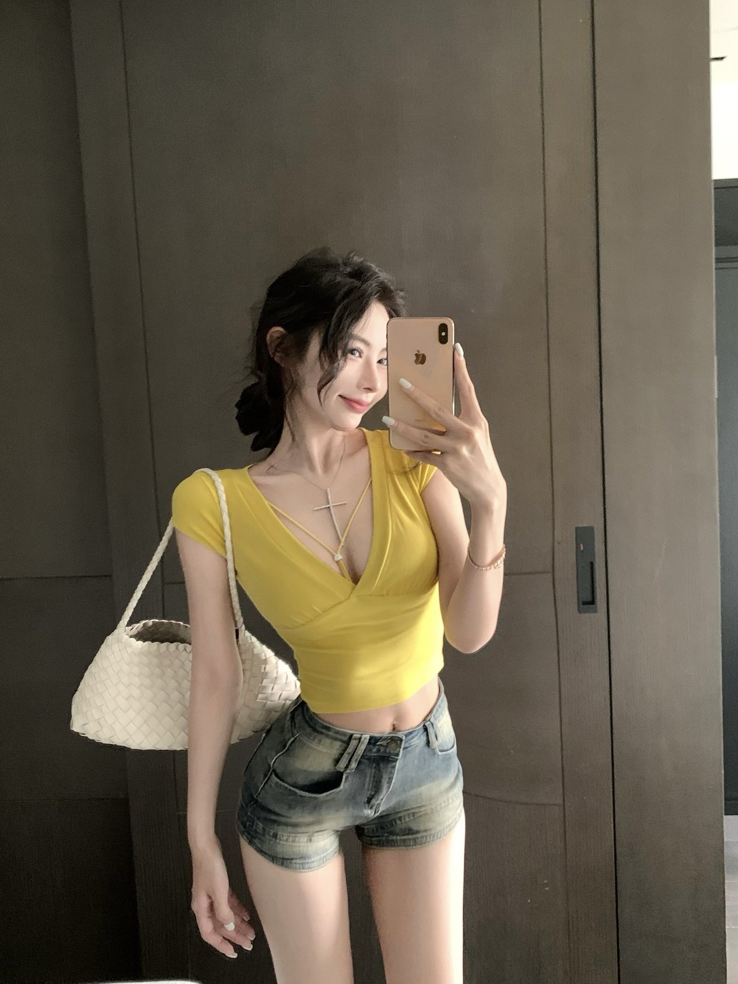 独特性感甜辣妹深v领短袖t恤女设计感春夏修身高腰短款正肩小上衣스토어 가기