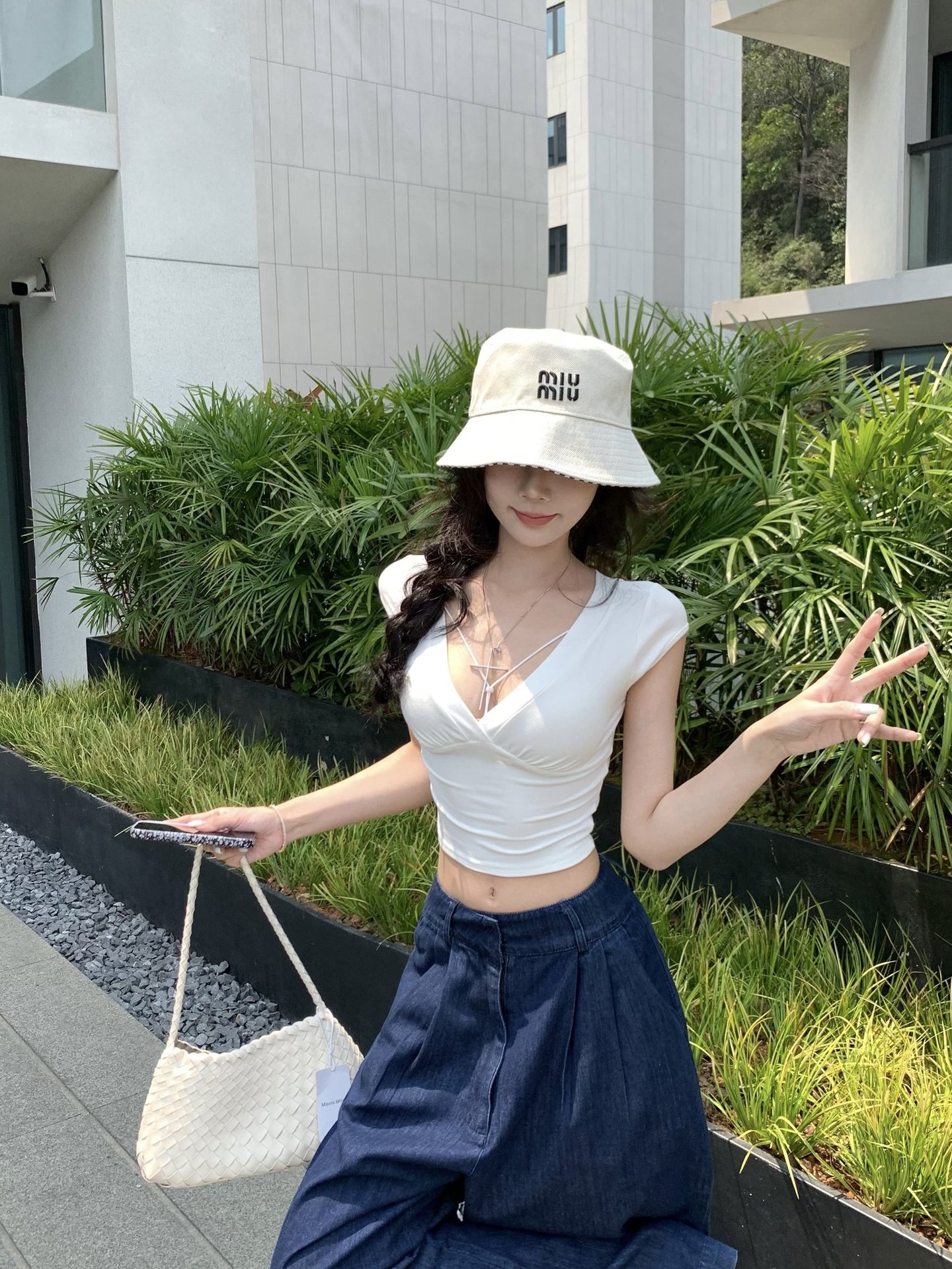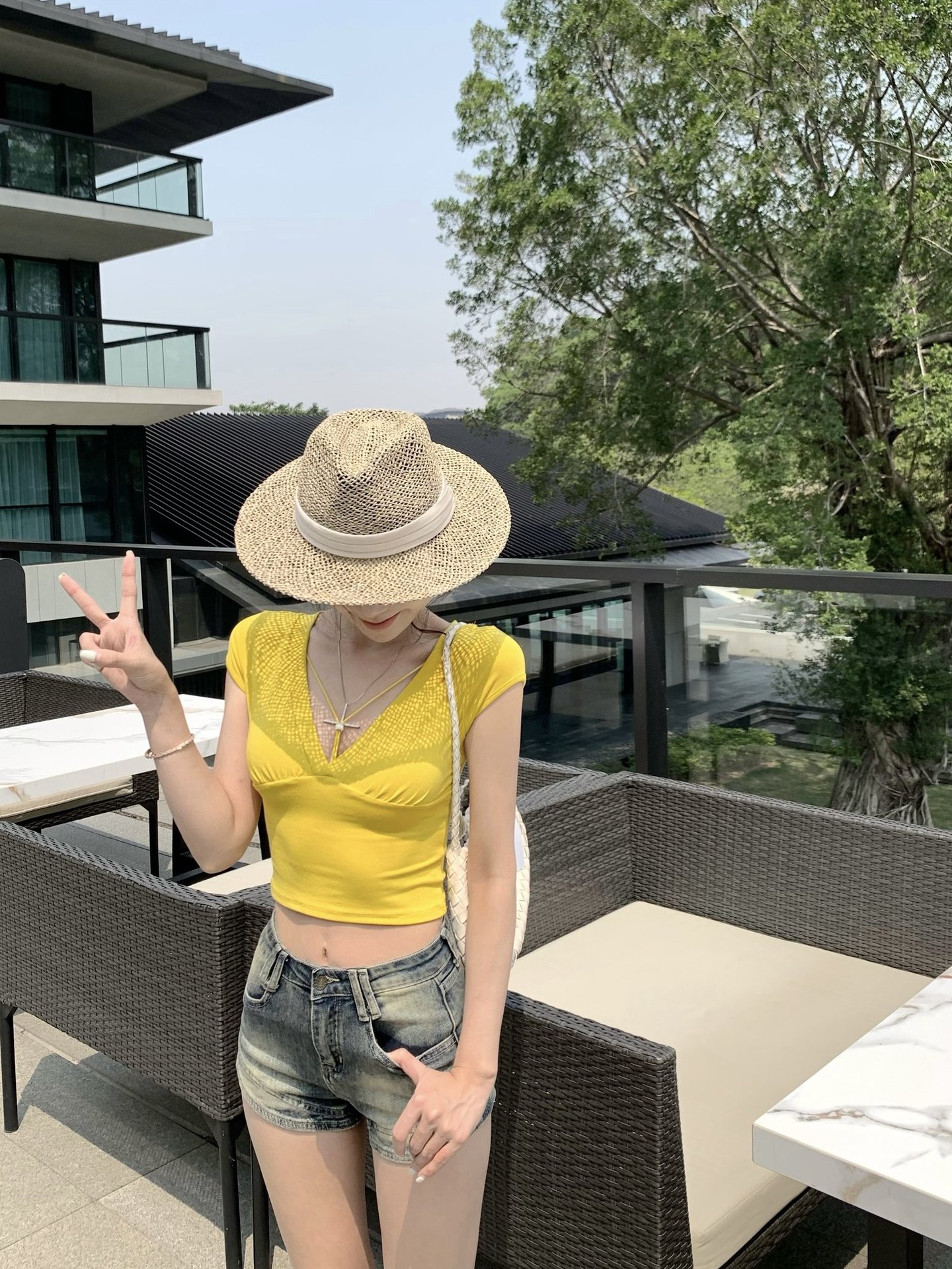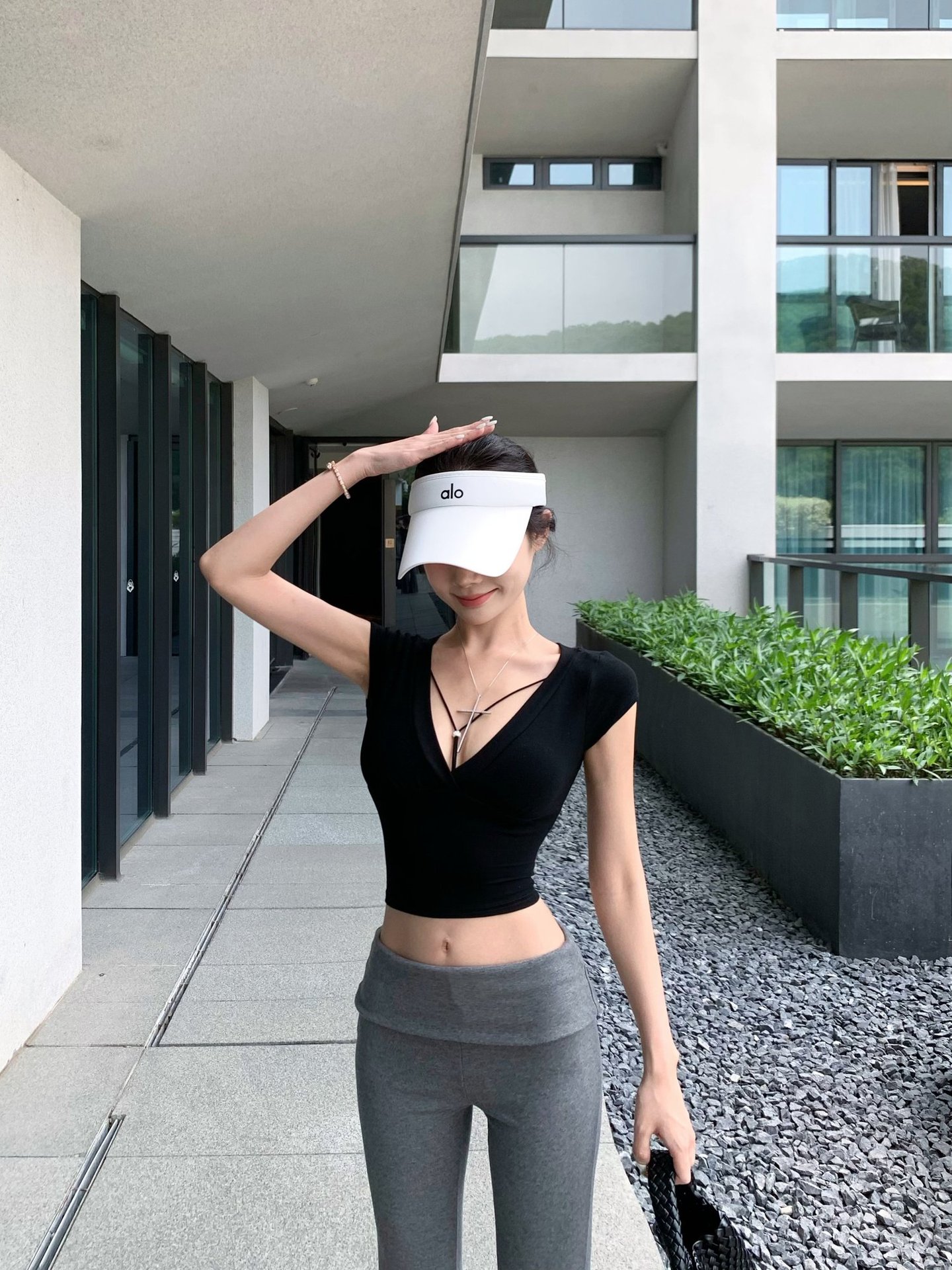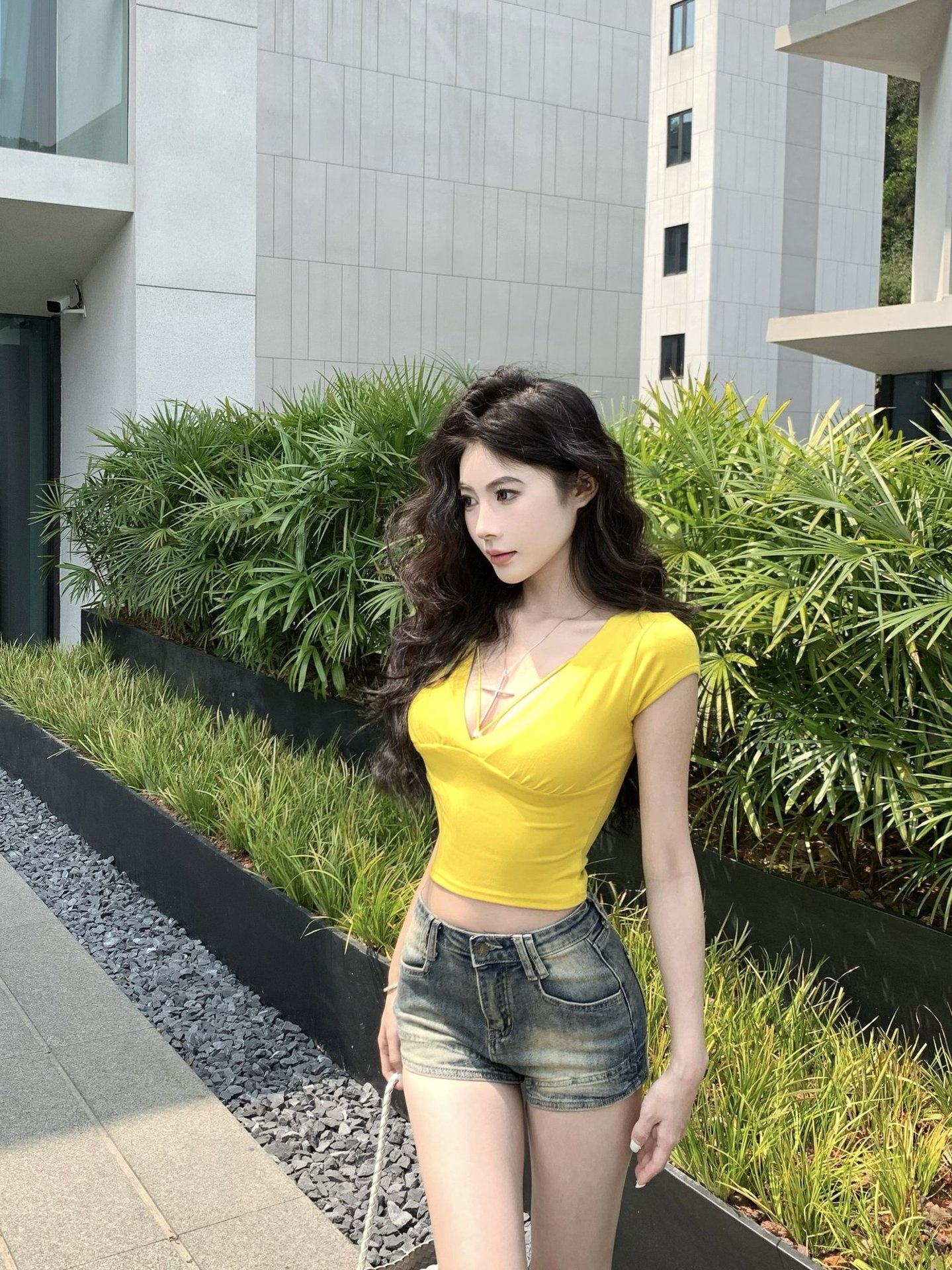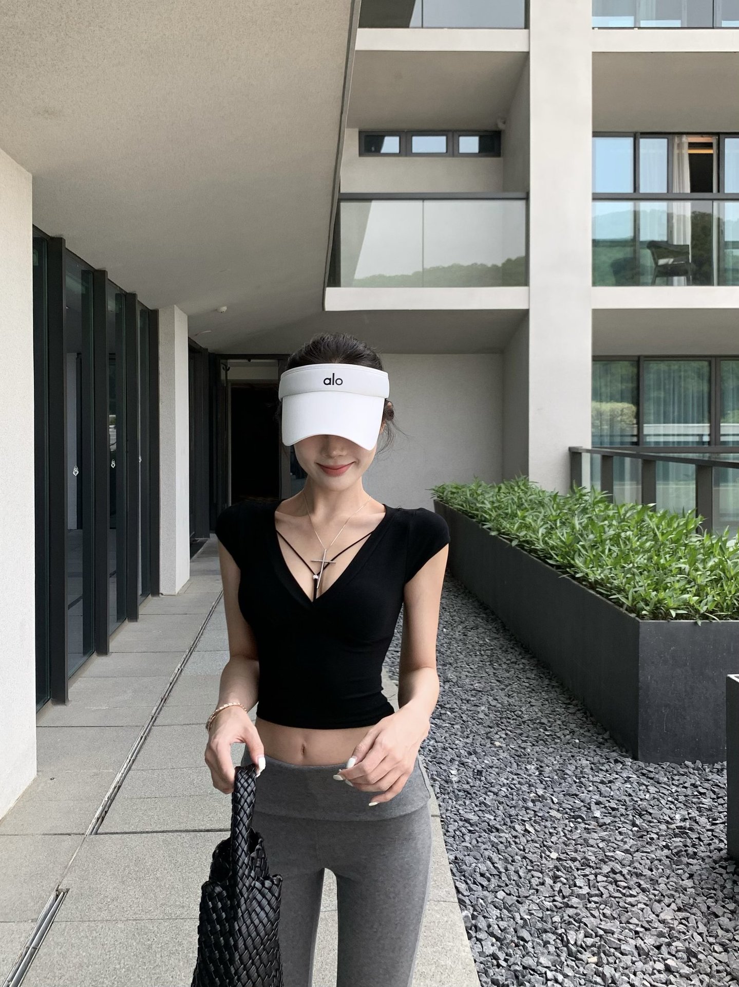 独特性感甜辣妹深v领短袖t恤女设计感春夏修身高腰短款正肩小上衣스토어 가기