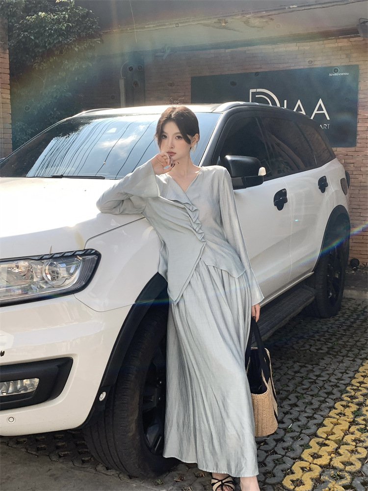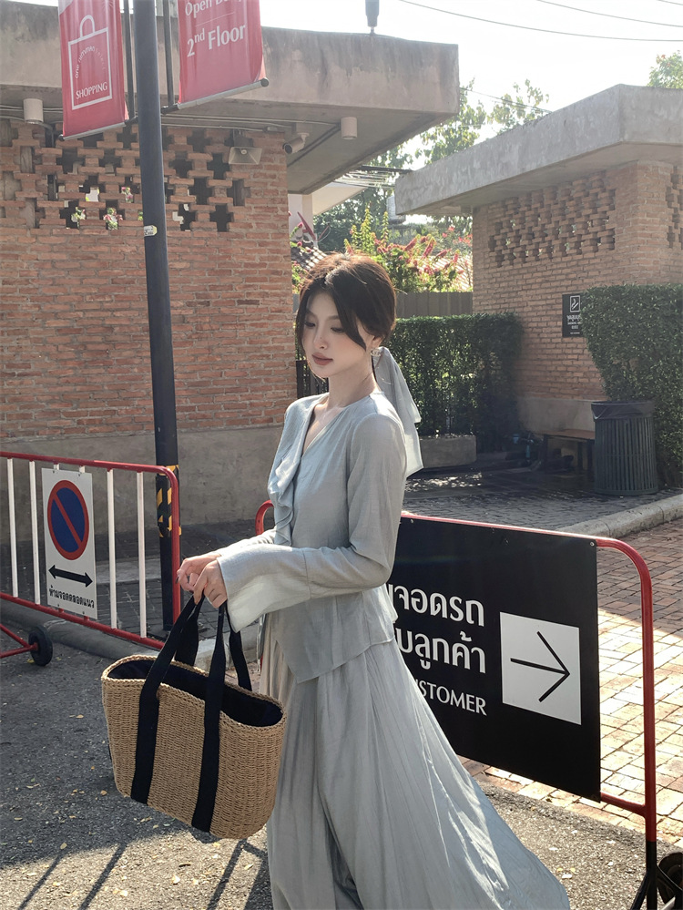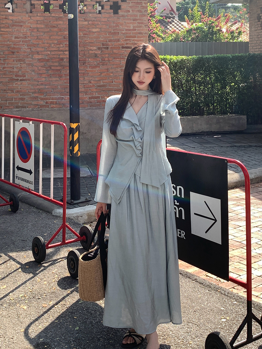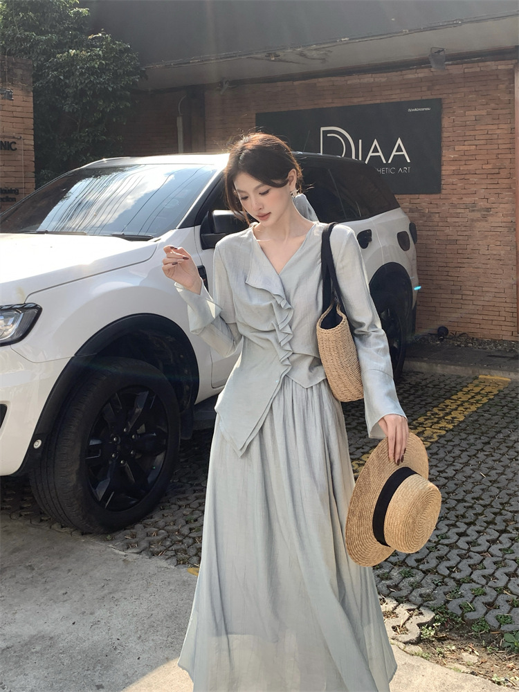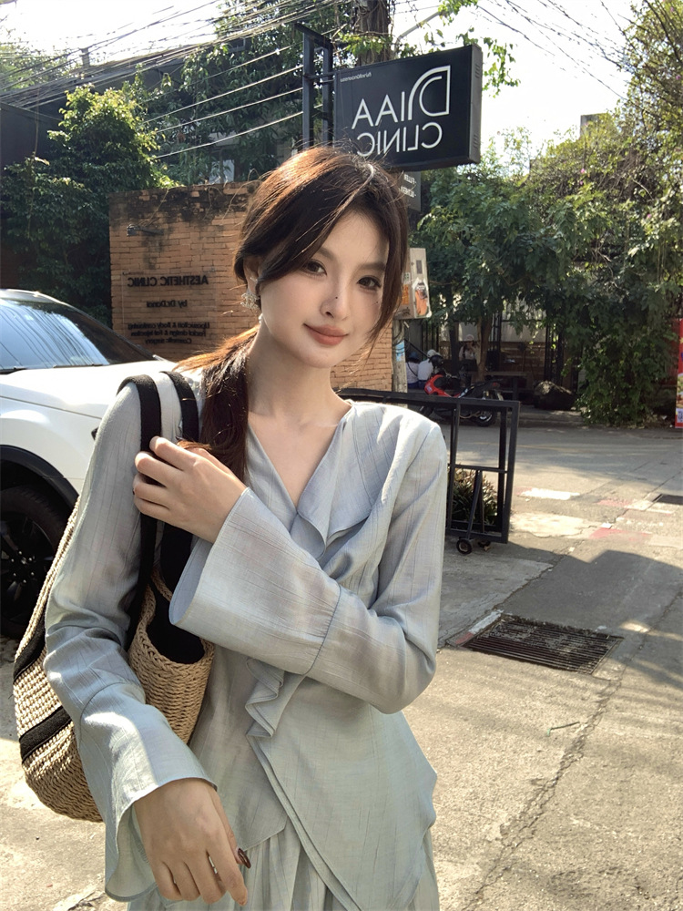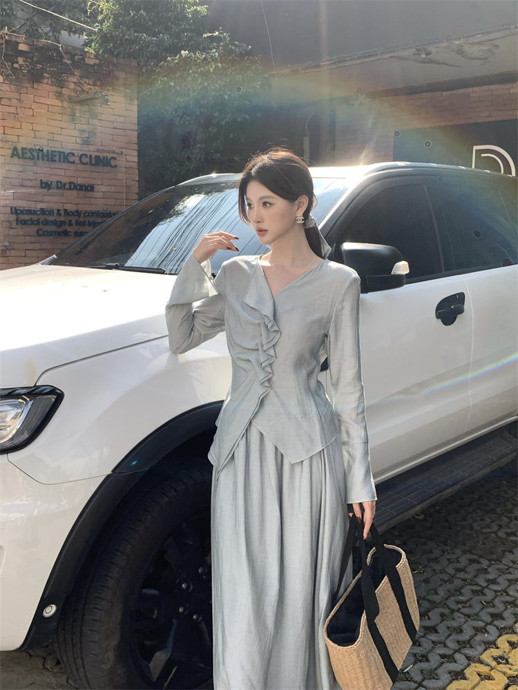 Xiuxixi 2025 새로운 가을 스타일 쉬폰 셔츠 + 여성용 하이 웨이스트 A 라인 하프 길이 스커트 투피스 슈트 89248